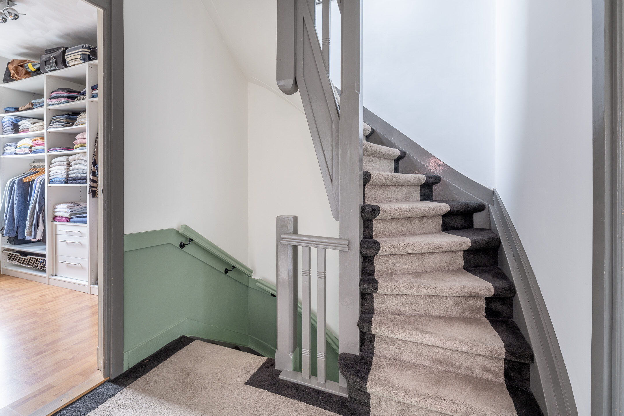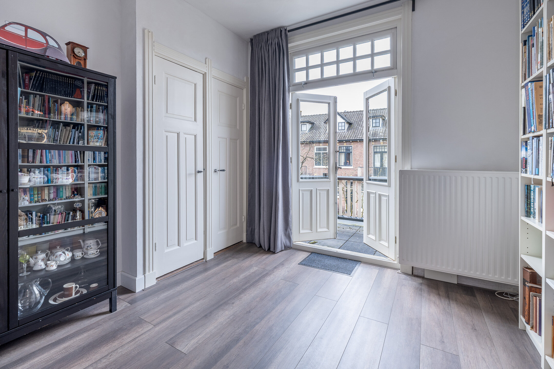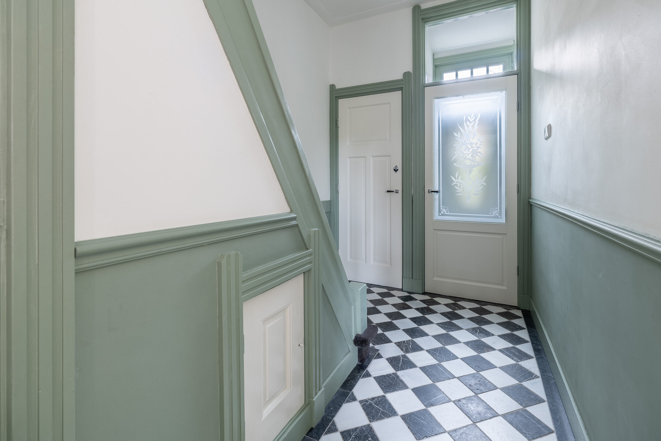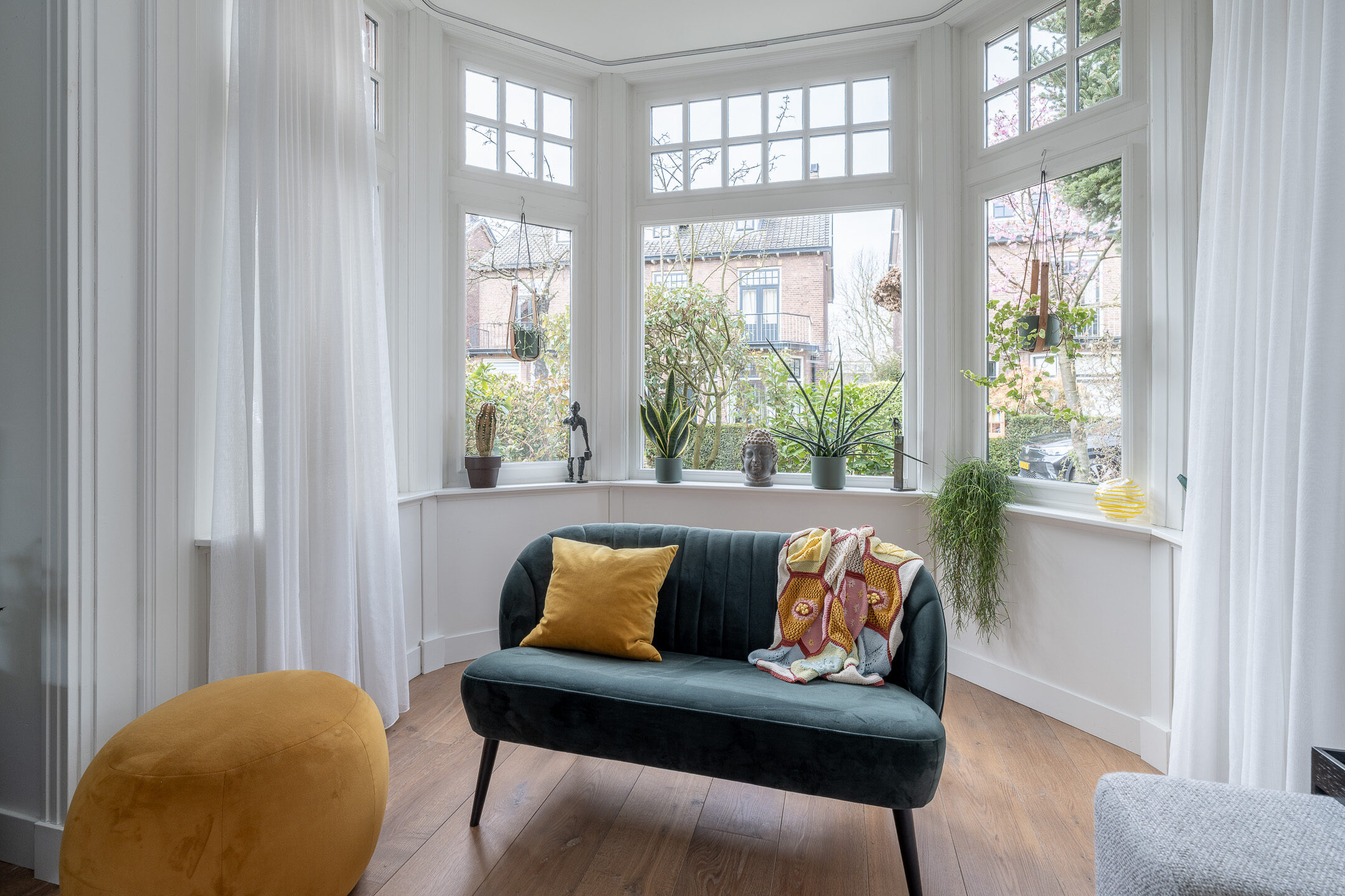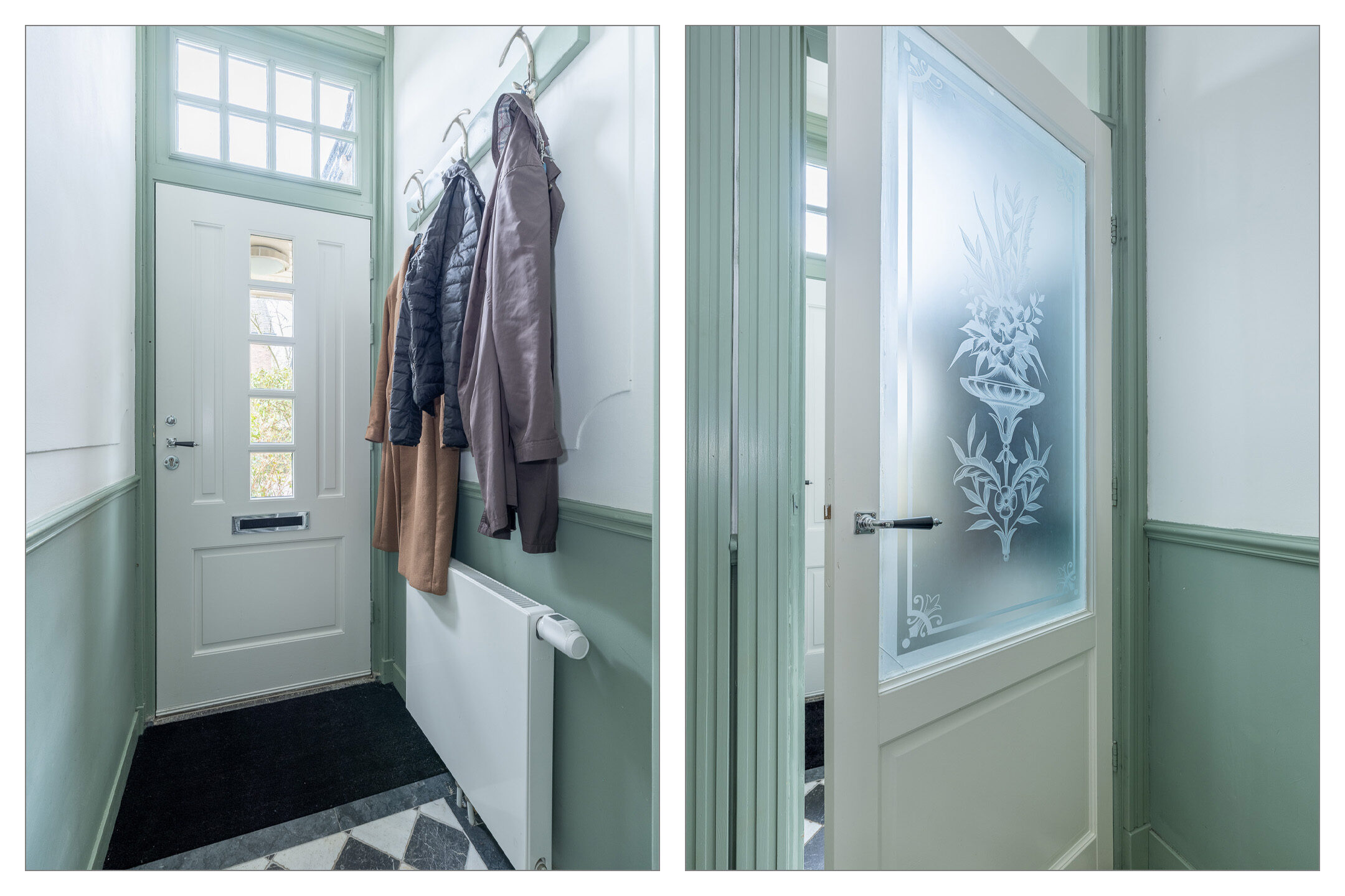 Begane grond: via de vestibule met originele glasdeur kom je in de hal met een fraaie trapopgang. Hier bevinden zich het toilet met fontein en een praktische, diepe trapkast. Vanuit de hal loop je door naar de gezellige woonkamer met erker en openslaande deuren naar de achtertuin. De woonkamer is voorzien van een mooie houten vloer en de gehele begane grond is geïsoleerd en uitgerust met vloerverwarming.