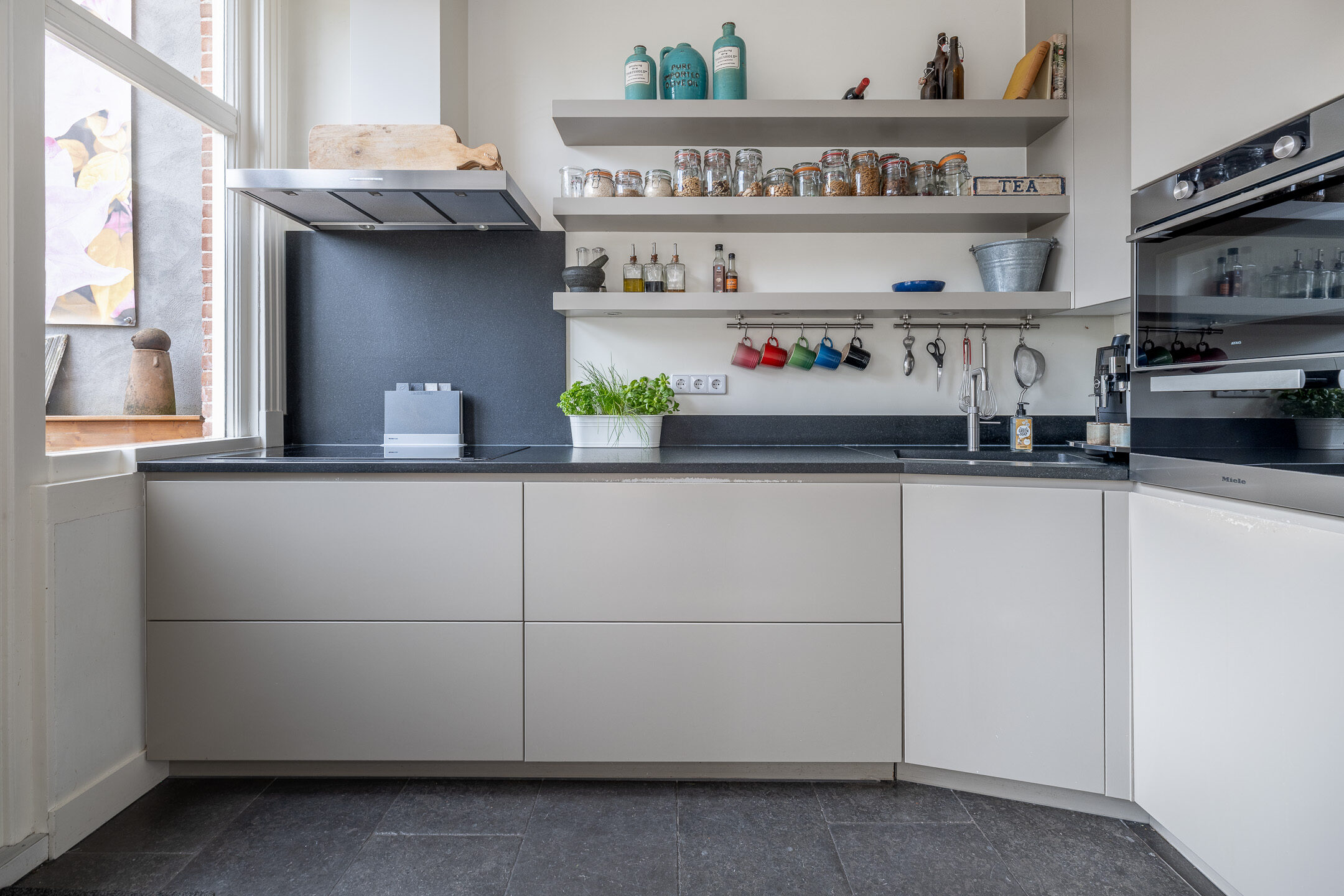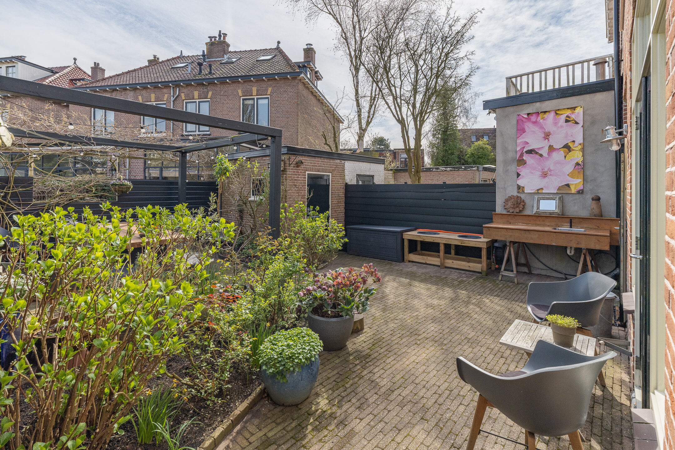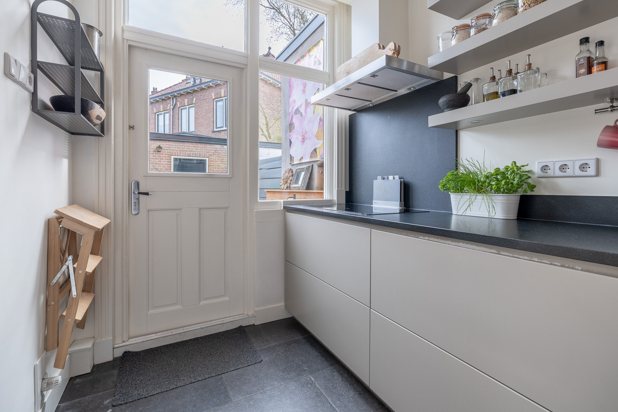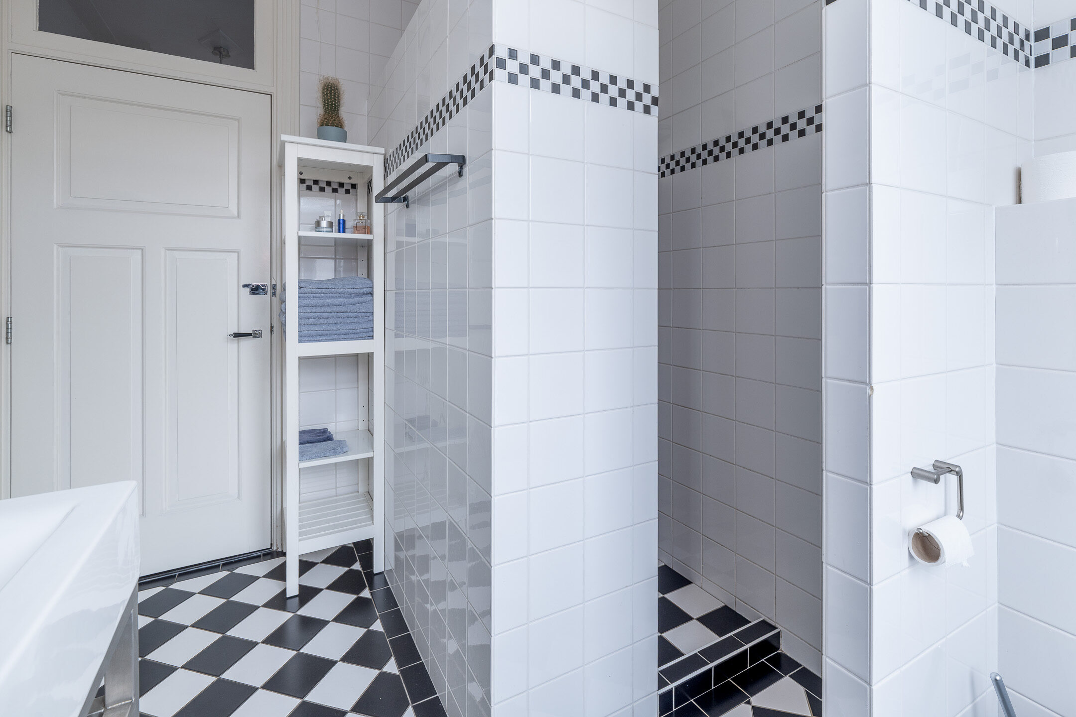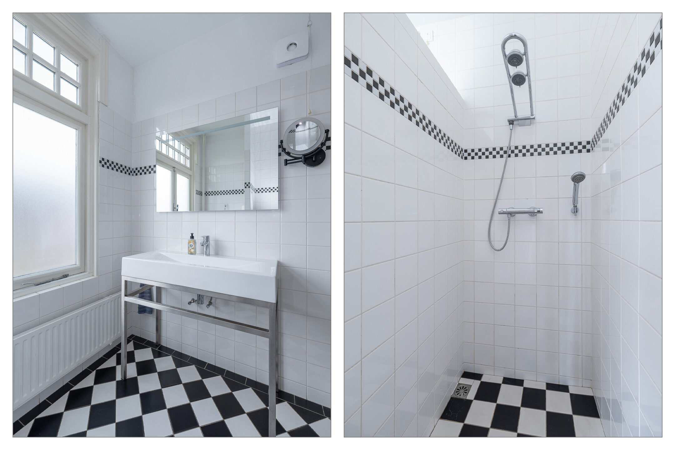 Begane grond: via de vestibule met originele glasdeur kom je in de hal met een fraaie trapopgang. Hier bevinden zich het toilet met fontein en een praktische, diepe trapkast. Vanuit de hal loop je door naar de gezellige woonkamer met erker en openslaande deuren naar de achtertuin. De woonkamer is voorzien van een mooie houten vloer en de gehele begane grond is geïsoleerd en uitgerust met vloerverwarming.