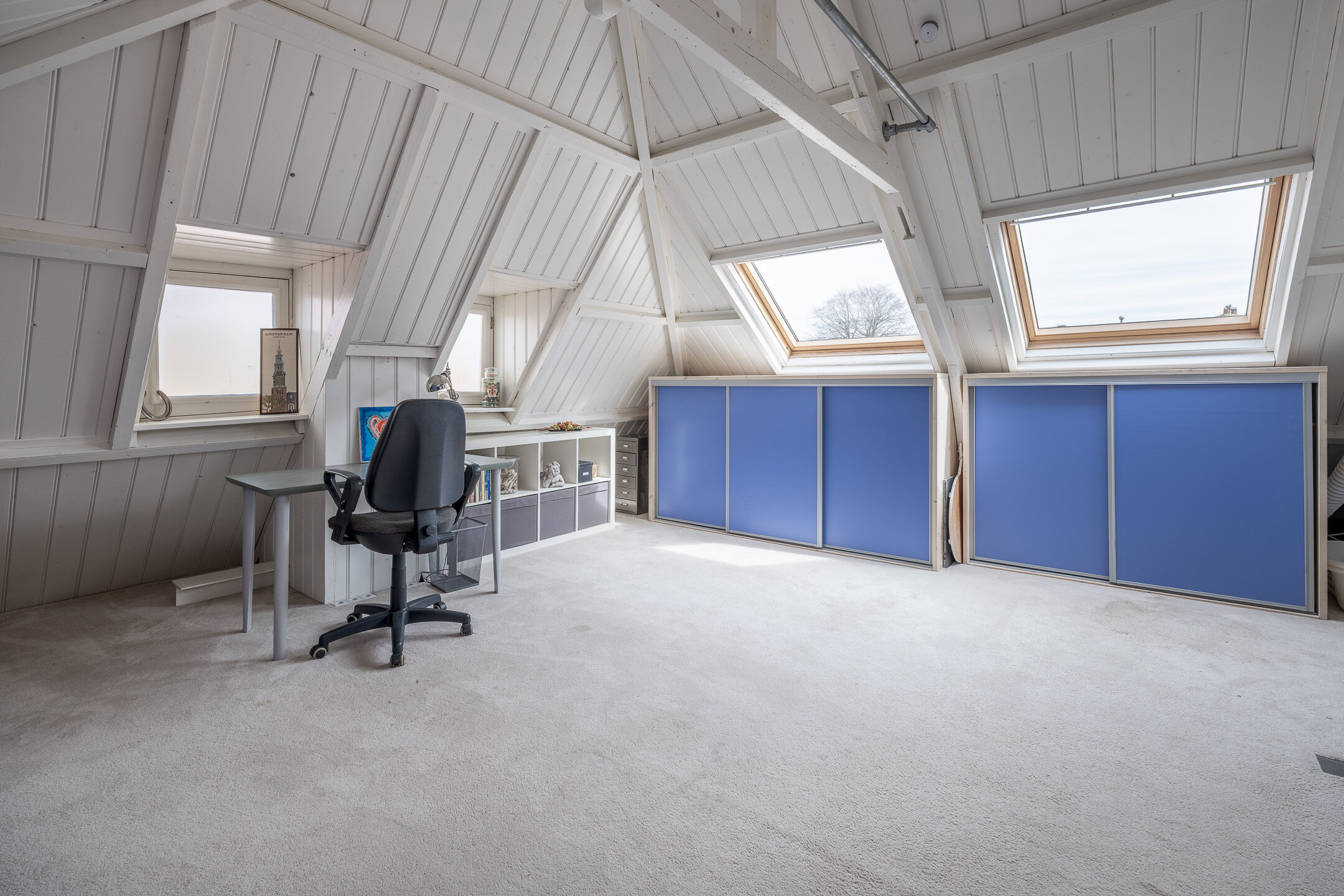 Tweede verdieping: via een vaste trap kom je op de ruime open zolderverdieping. Deze is voorzien van twee kleinere dakkapellen en dakramen, wat zorgt voor prettige lichtinval. Hier bevinden zich ook de aansluiting voor de wasmachine en droger en de stookruimte. De ruimte biedt mogelijkheden voor een andere indeling en kan eventueel nog worden vergroot door het plaatsen van een dakkapel aan de achterzijde.