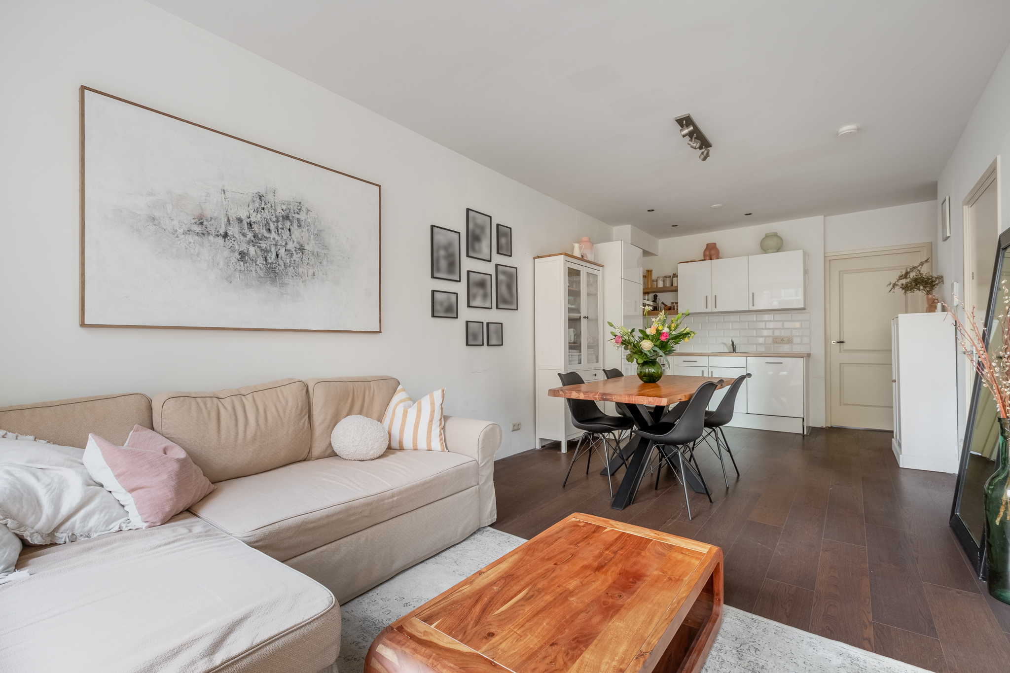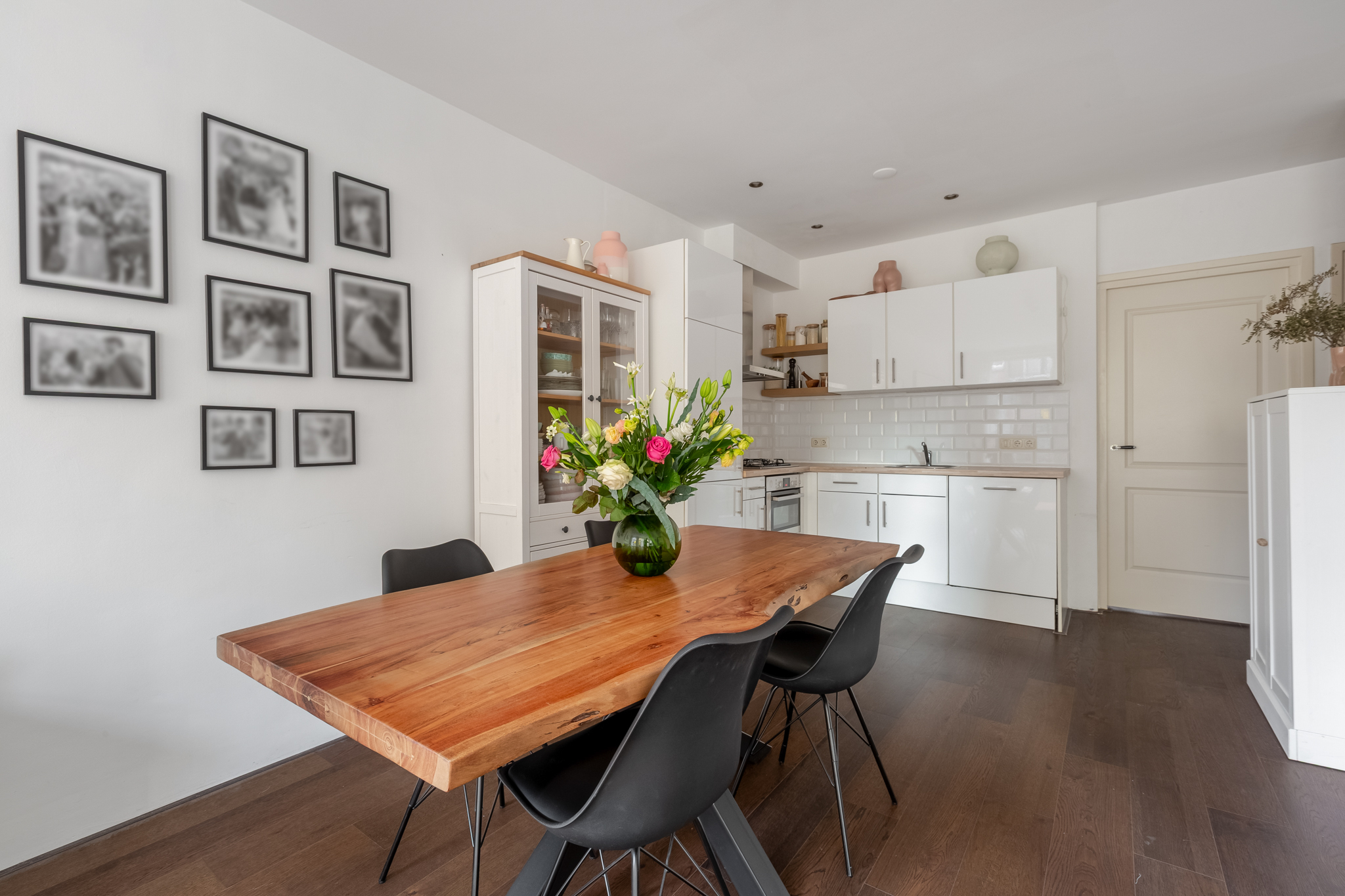Aan de voorzijde bevindt zich de lichte en ruime living met open keuken met drie grote ramen met Frans balkon, waar je heerlijk van de ochtendzon kunt genieten. De keuken is praktisch ingericht en voorzien van diverse inbouwapparatuur, waaronder een nieuwe afzuigkap uit 2023.