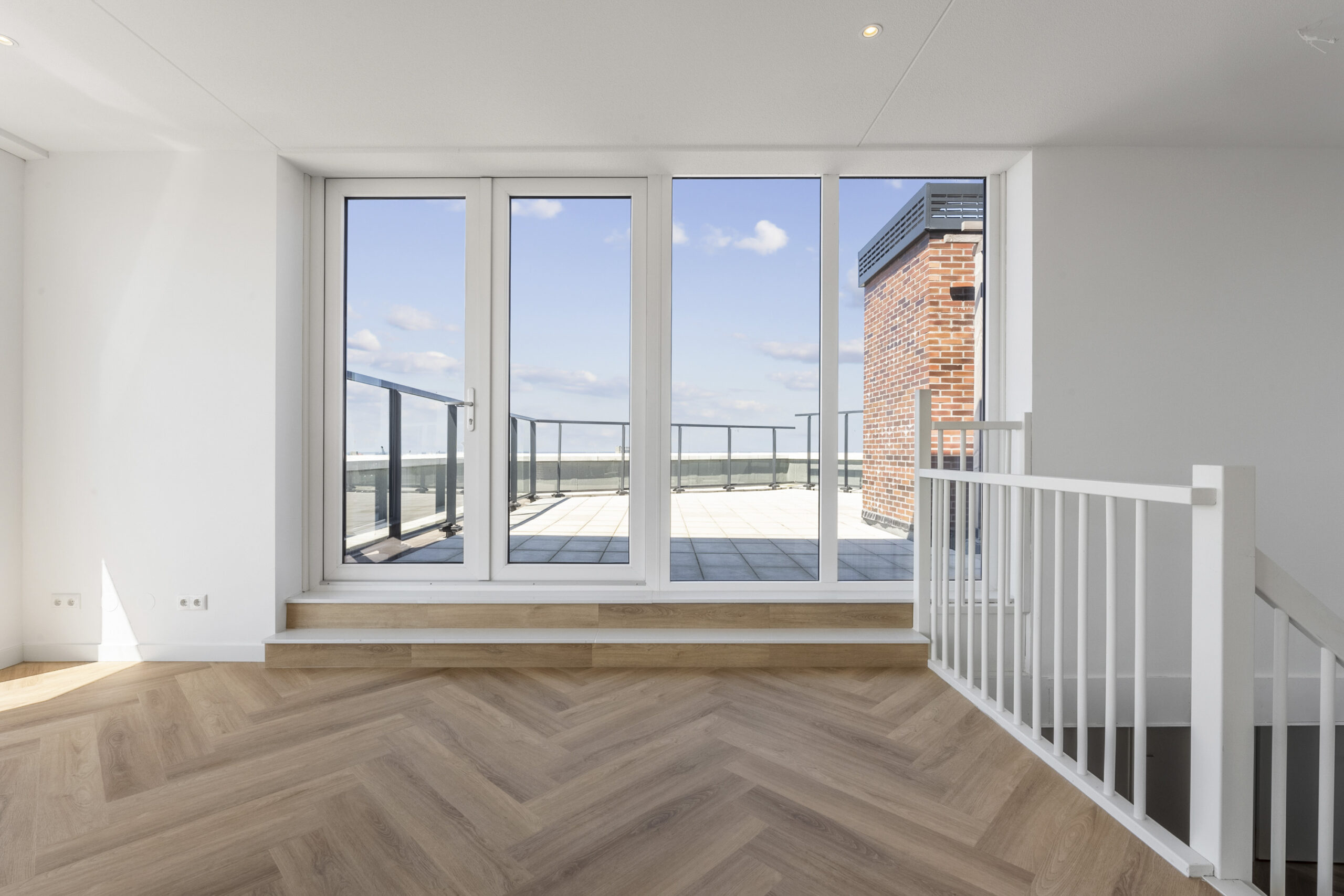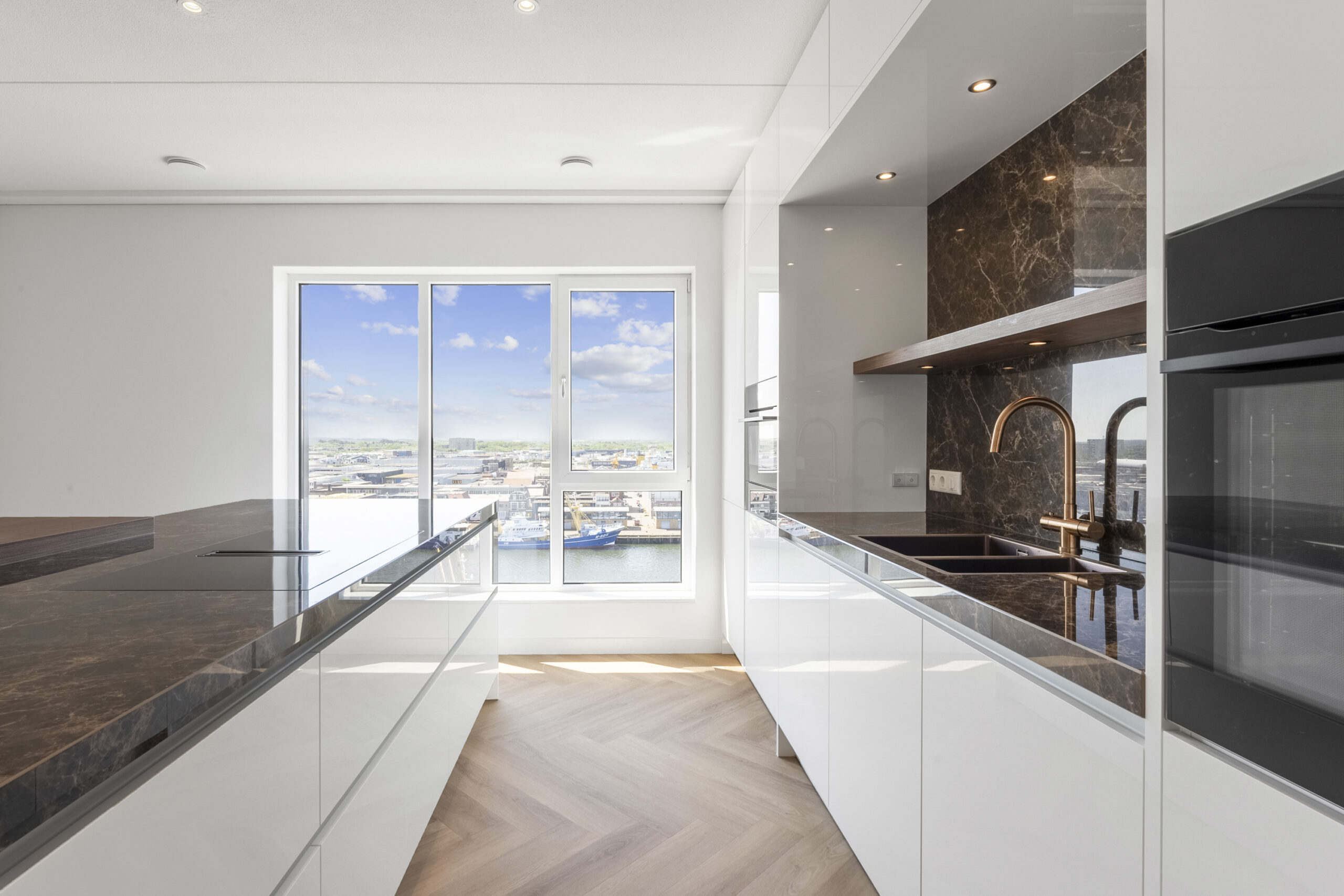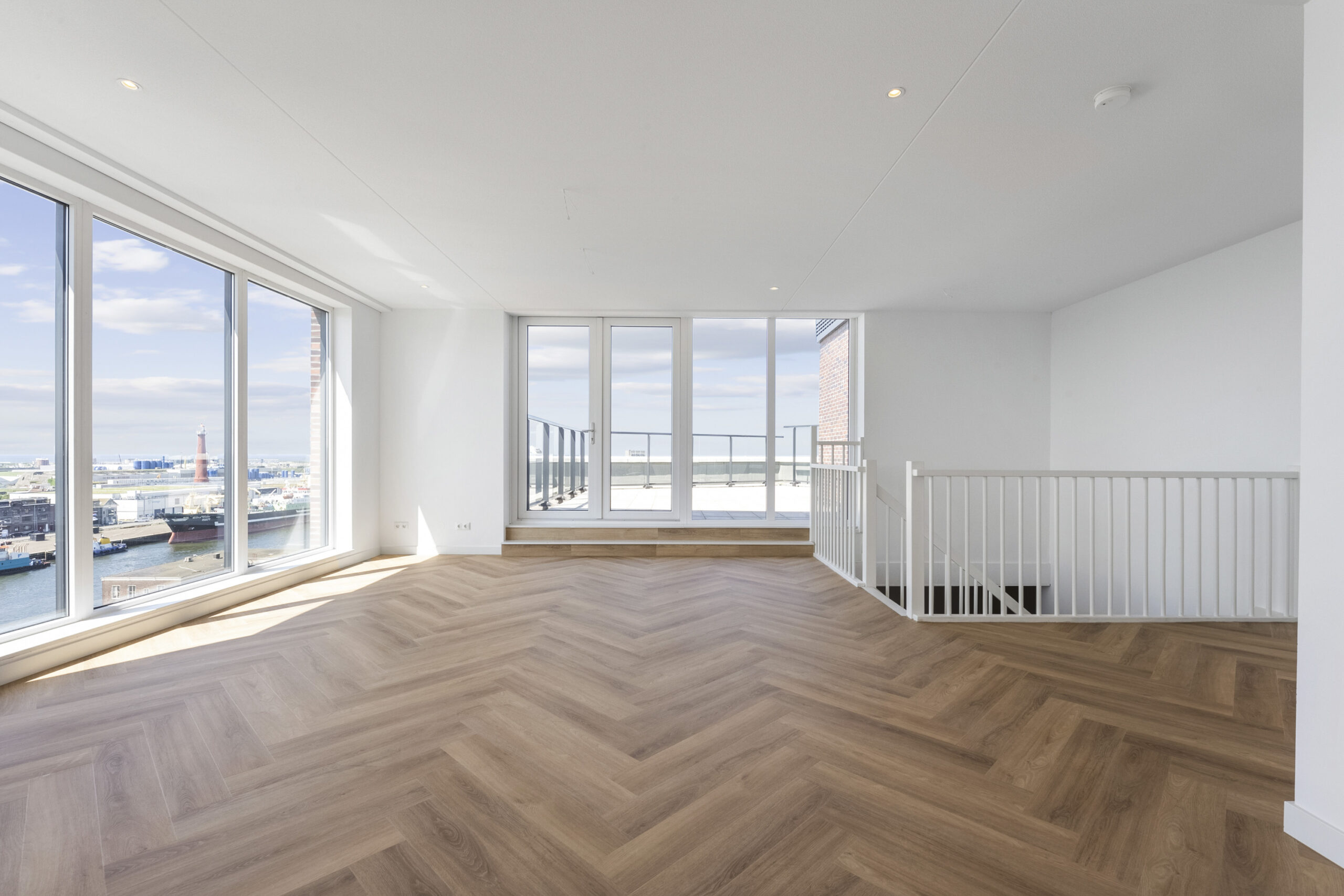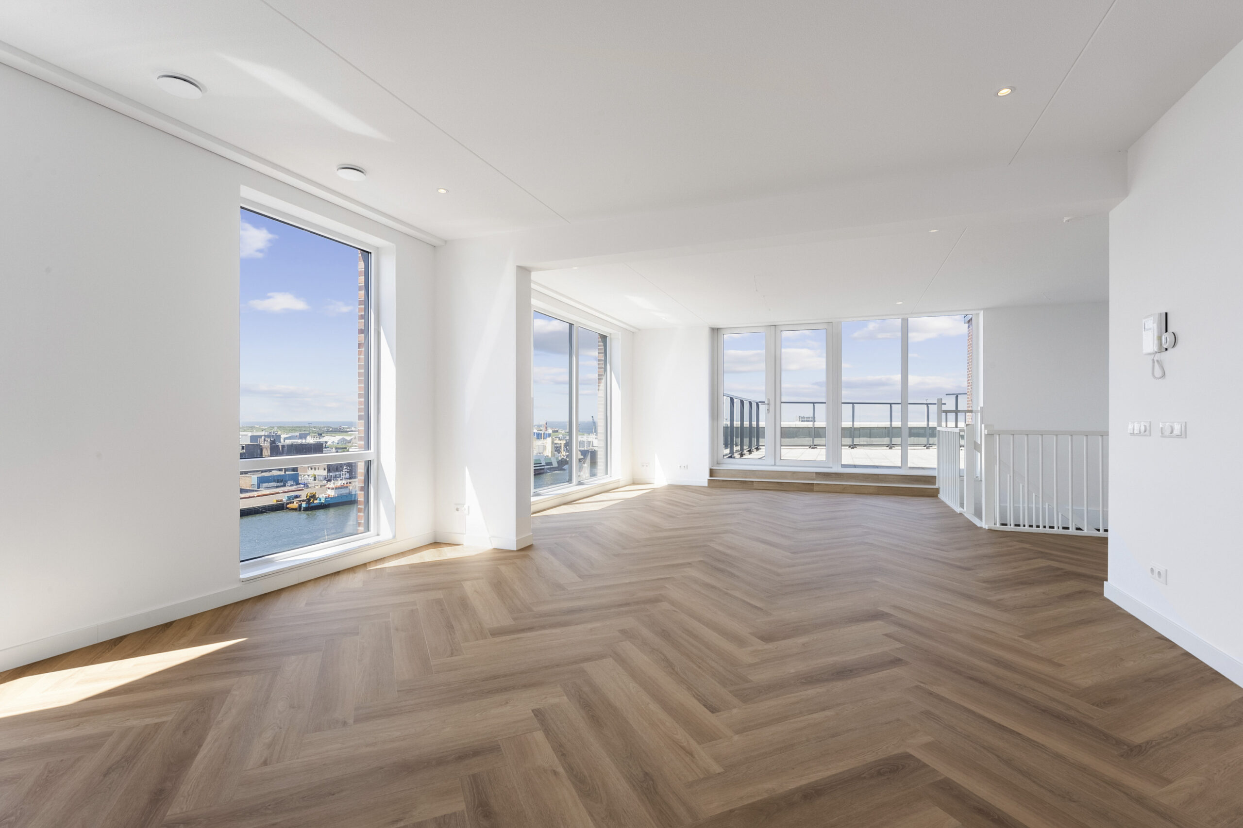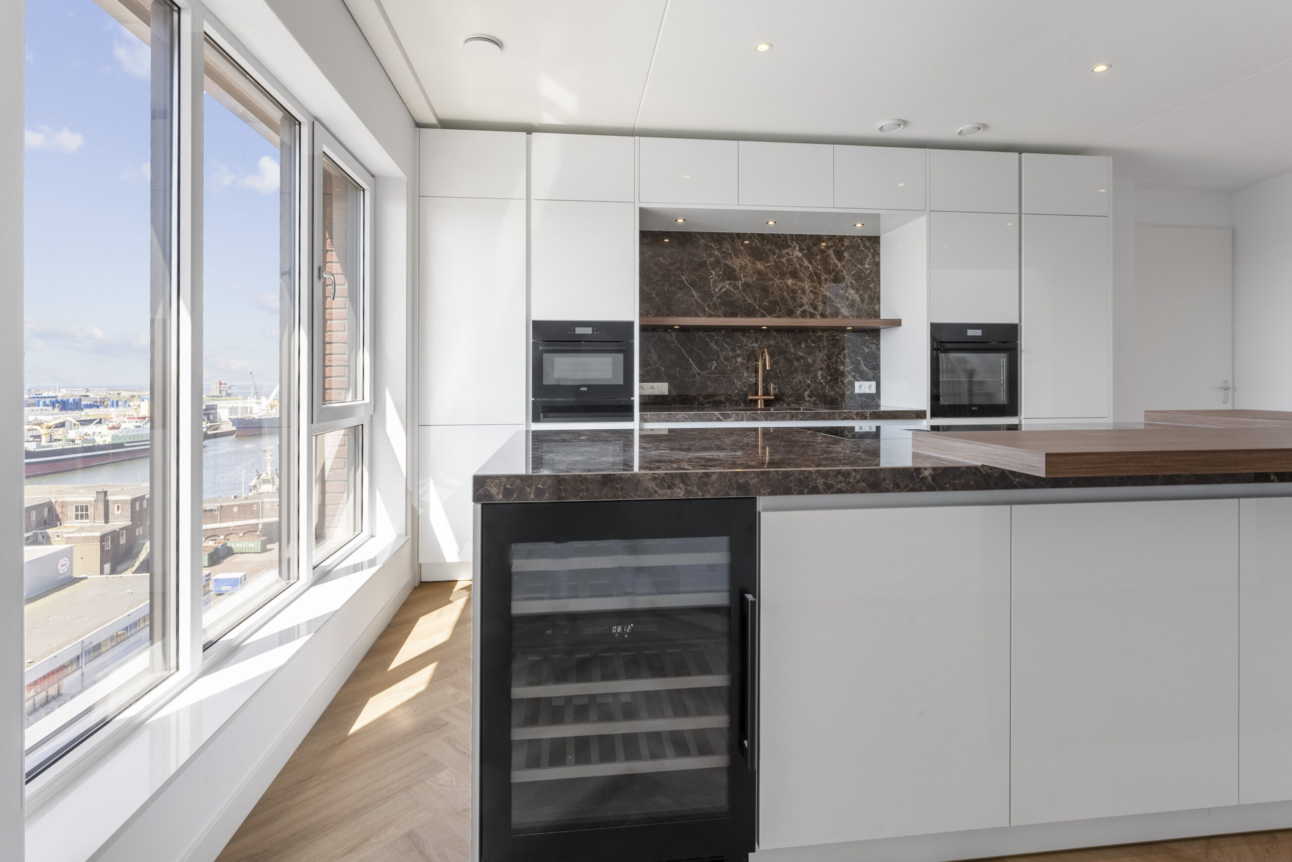 Met een magnifiek vrij uitzicht vind je in een zeer recent gebouwd appartementencomplex dit riante penthouse voorzien van een groot zonnig dakterras en 2 eigen parkeerplaatsen. Vanuit de vele en grote raampartijen heb je een geweldig uitzicht grotendeels over IJmuiden, de zee, de havens met vele vissersboten en o.a. de ferry naar Engeland, de sluizen met het Noordzeekanaal, de duinen naar Zandvoort en verder. Het appartement verdeeld over 2 woonlagen heeft een woonoppervlakte van maar liefst 186 m2 en is voorzien van grote raampartijen waardoor het binnen heerlijk licht is en je vanuit elk vertrek een uniek uitzicht hebt. Het bestaat o.a. uit een riante living met toegang naar het terras, een spiksplinternieuwe woonkeuken, 3 slaapkamers, 2 badkamers en 2 separate toiletten. Indien gewenst is er de ruimte om eventueel een interne lift in het appartement te plaatsen. Het grote zonnige dakterras (ca. 57 m2) met eveneens een geweldig panoramisch uitzicht is voorzien van elektra en een buitenkraan zodat er een buitenkeuken geplaatst kan worden. Het terras is op het noordwesten gesitueerd waardoor je volop kan genieten van de middag- en avondzon totdat hij onder gaat.