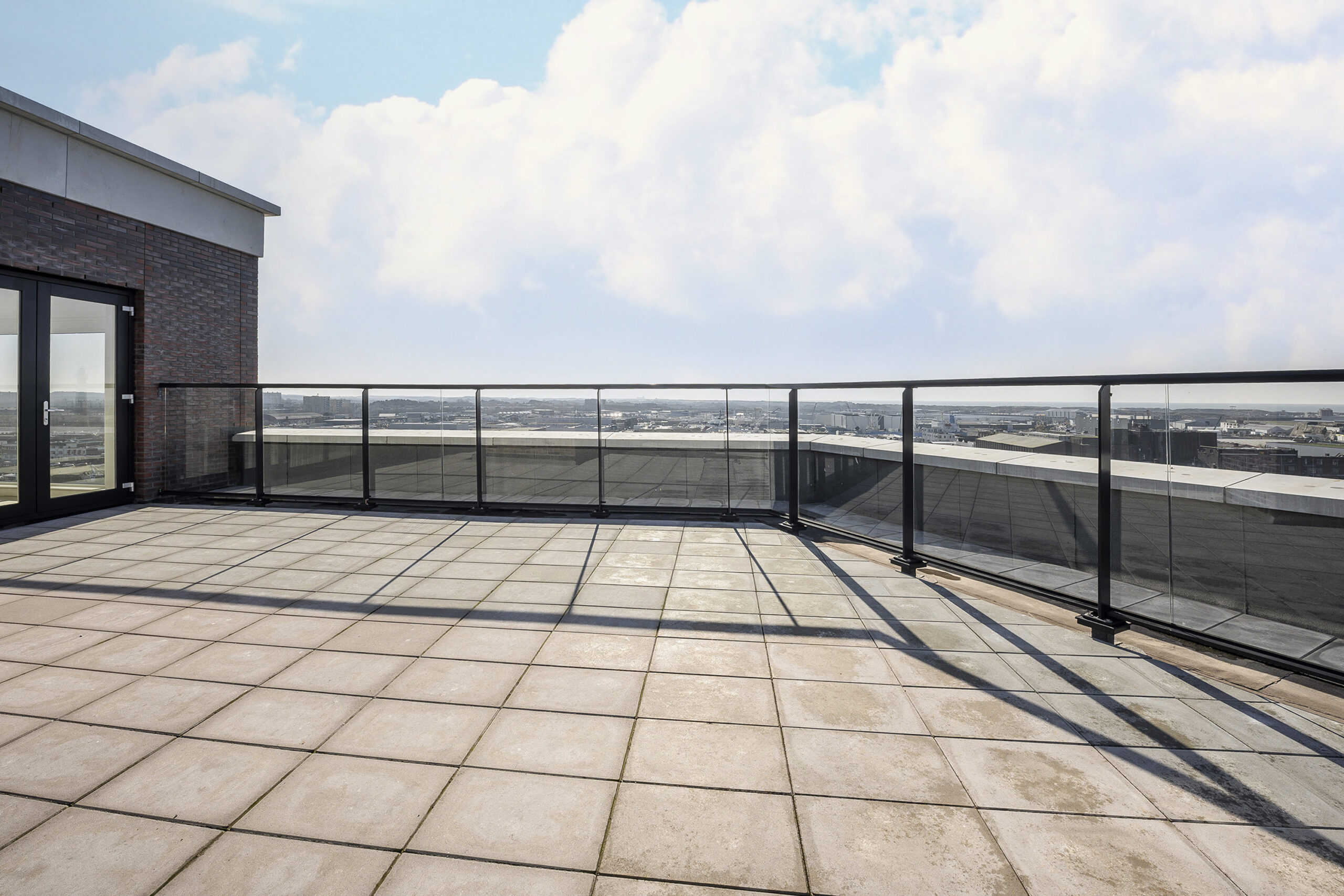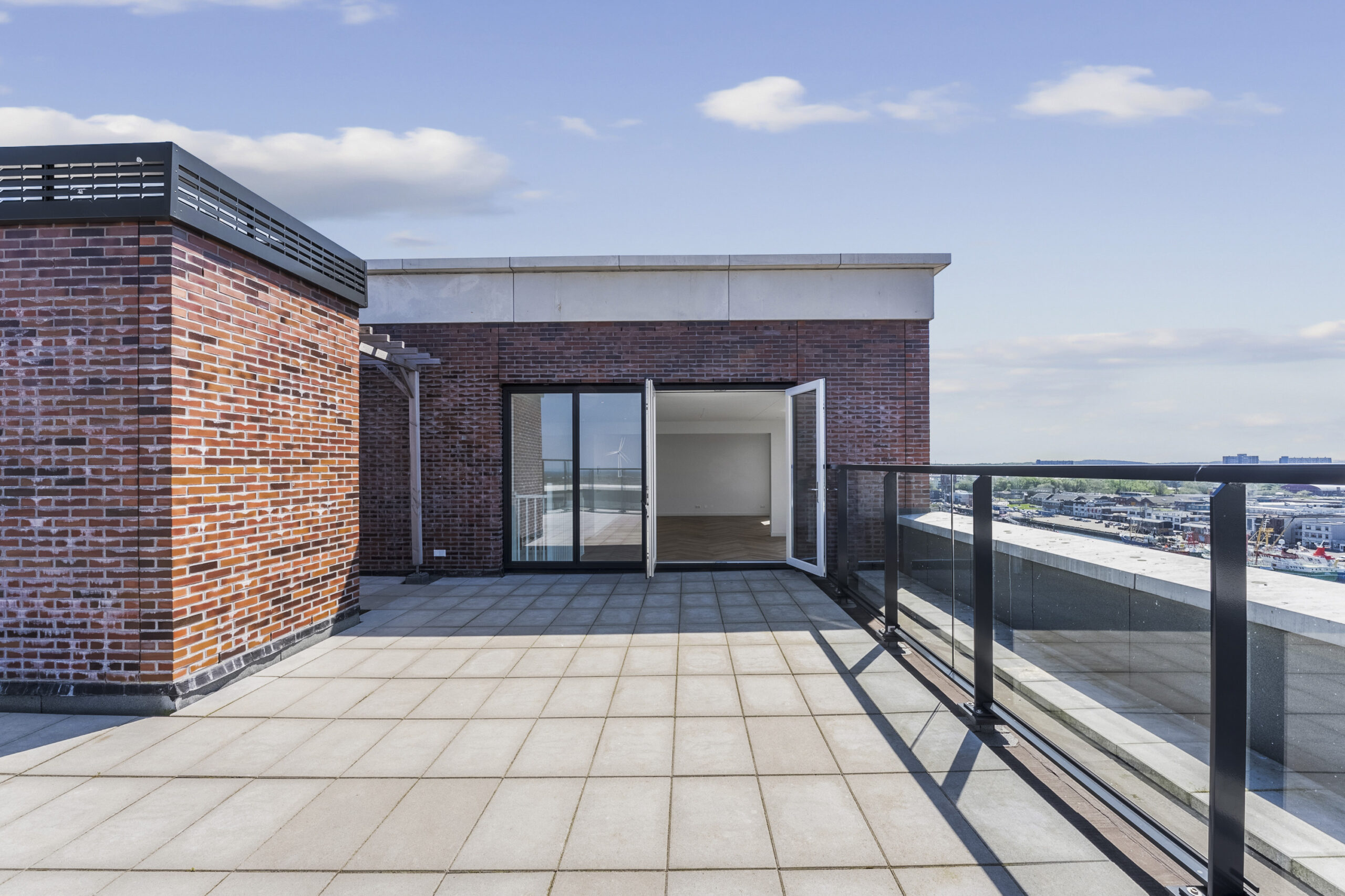 10e Woonlaag: zeer riante living met grote raampartijen en openslaande deuren naar dakterras, tussenhal met toegang naar modern zwevend toilet met fontein en inpandige berging/technische ruimte met wasmachine aansluiting