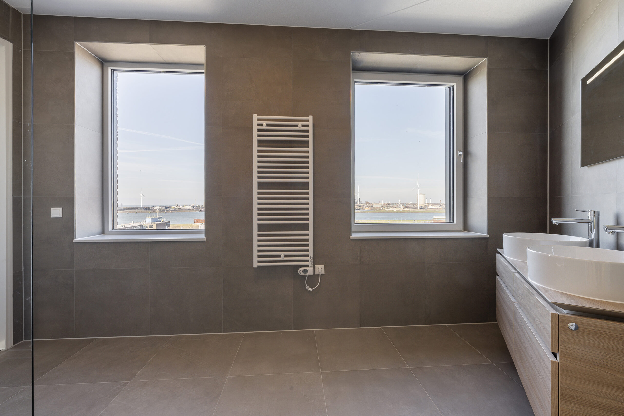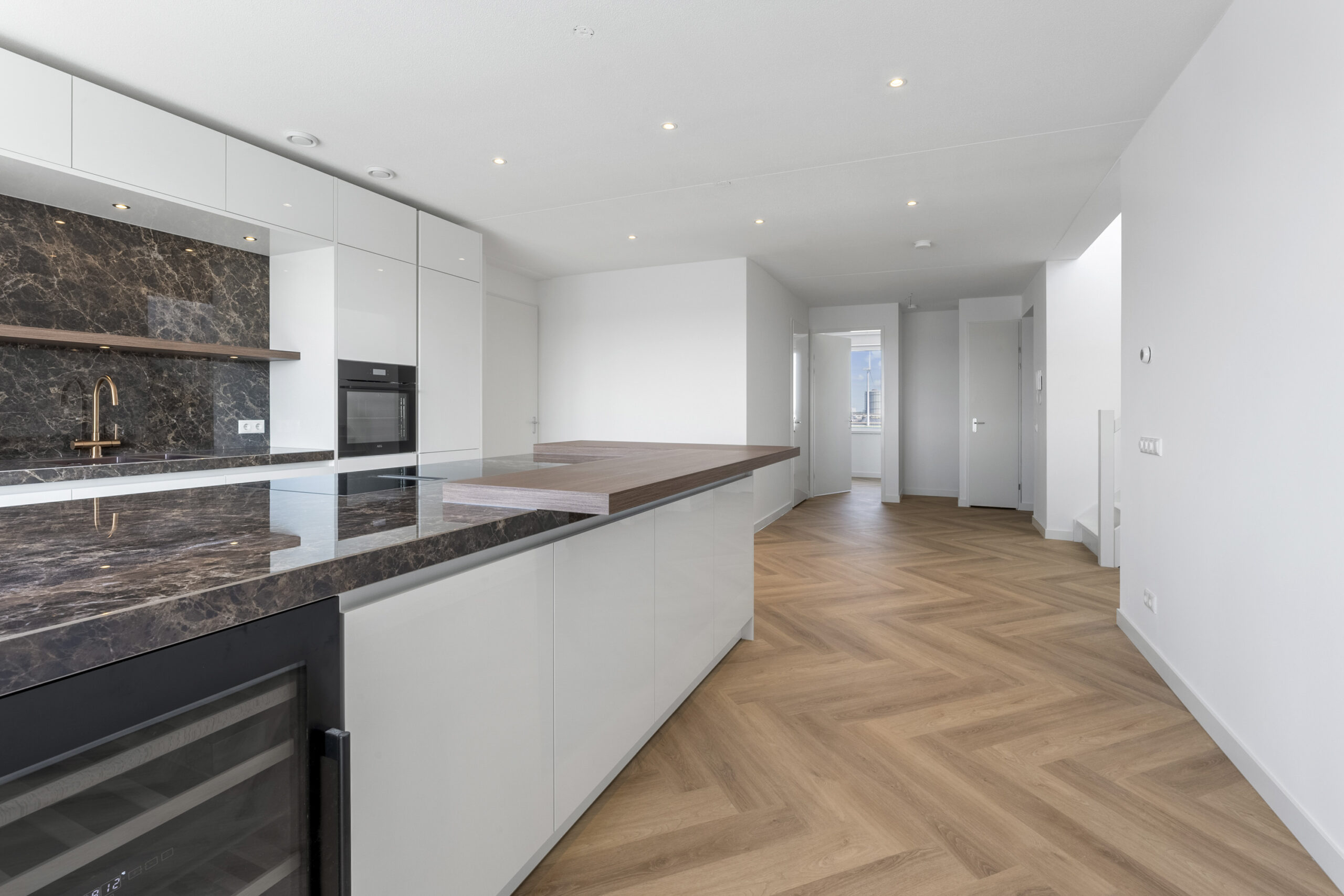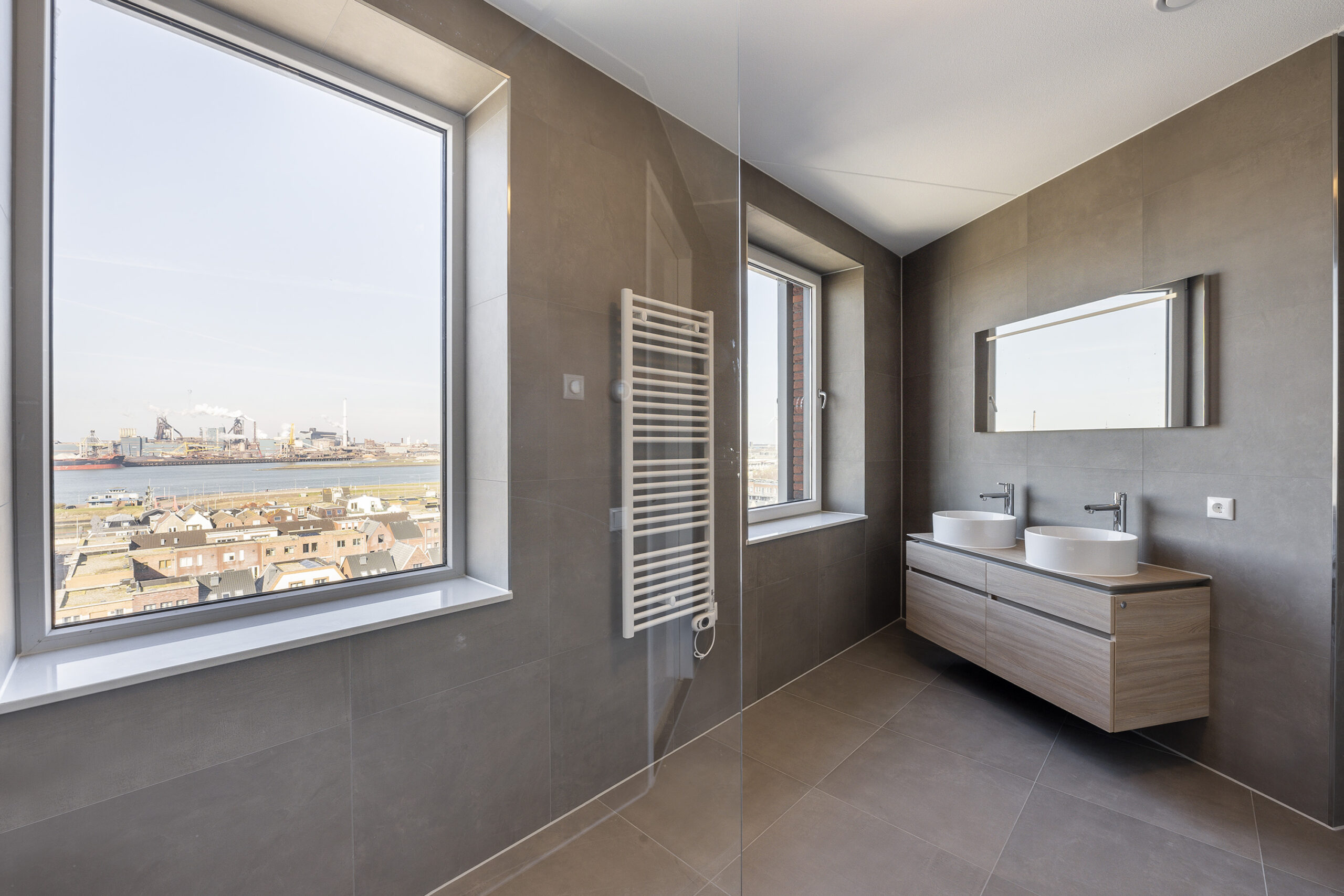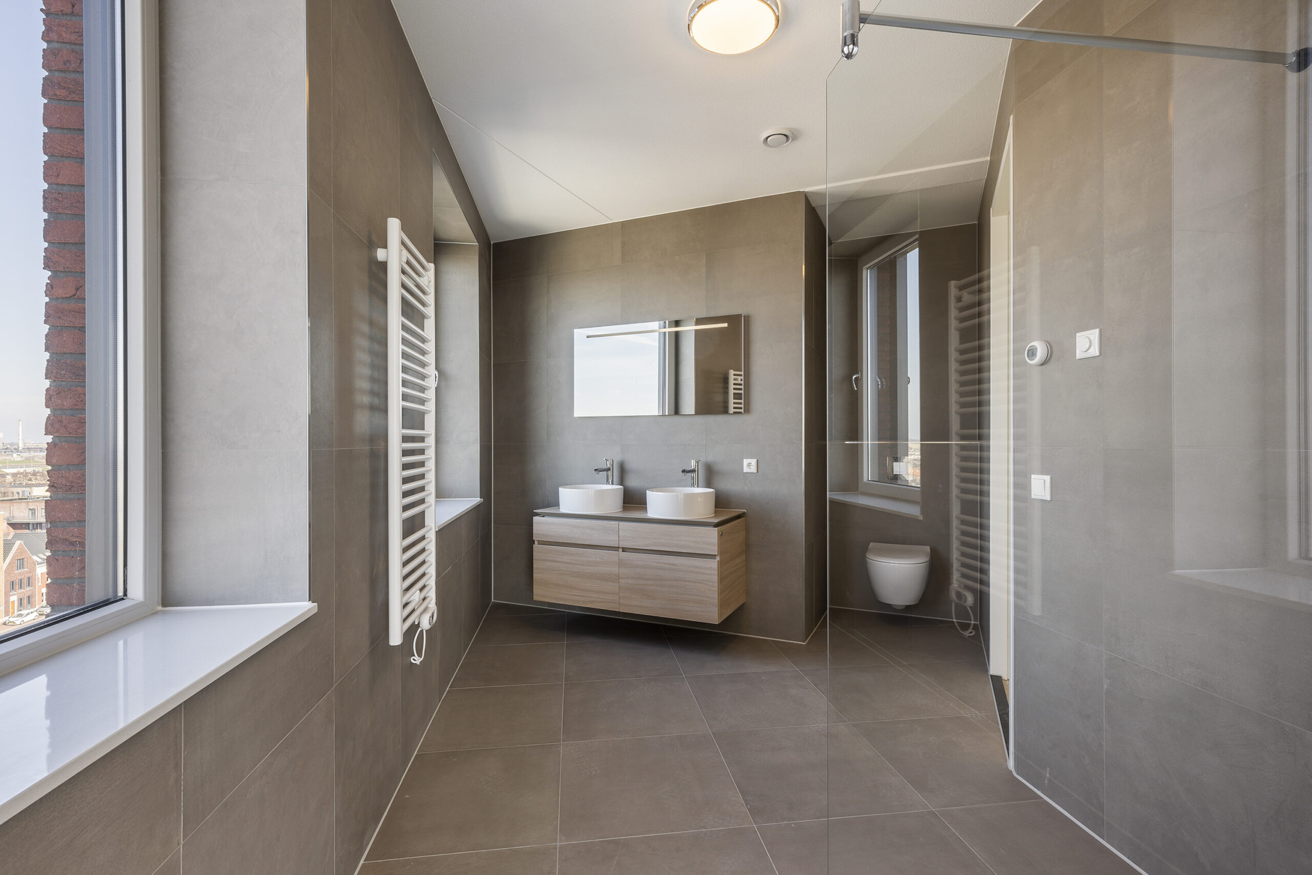 9e Woonlaag: entree appartement, hal met garderobenis en modern zwevend toilet met fontein, ruime spiksplinternieuwe woonkeuken en voorzien van grote raampartij, royale tussenhal voorzien van kast met technische installaties, ouderslaapkamer met groot raampartij, extra zijraam en tevens toegang naar moderne badkamer voorzien van inloopdouche met handdouche en rainshower, meubel met dubbele wastafel en zwevend toilet, 2e slaapkamer met grote raampartijen, 3e slaapkamer met toegang naar eigen moderne badkamer voorzien van wastafelmeubel en inloopdouche met handdouche en rainshower, via woonkeuken trap naar…..