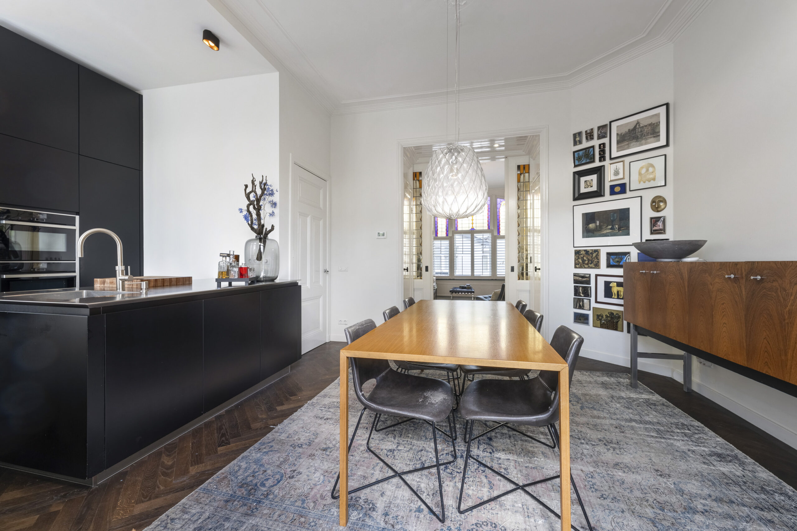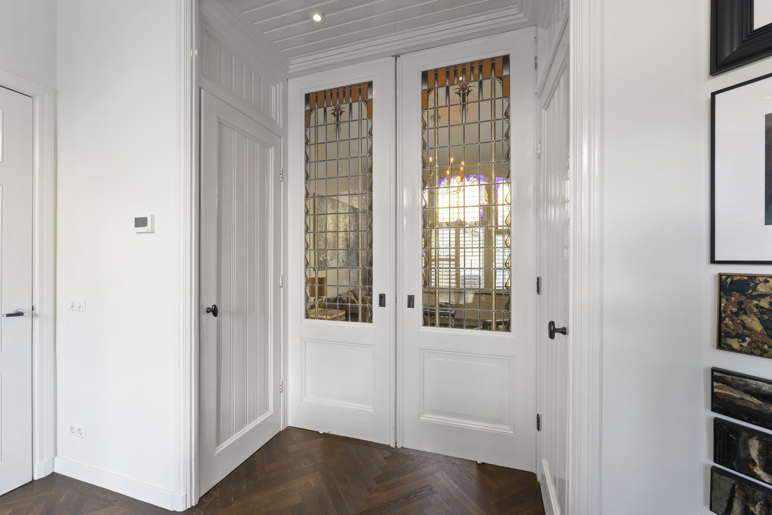 1e Verdieping: overloop met bergkast en modern zwevend toilet met fontein, zeer lichte woonkamer en suite voorzien van suitestel met glas-in-lood ramen, hoge ornamenten plafonds, glas-in-lood raampartijen, granieten vensterbank, gashaard, servieskasten en openslaande deuren naar dakterras, moderne open keuken voorzien van spoeleiland, diverse inbouwapparatuur en deur naar dakterras, zijkamer aan voorzijde en via overloop trap naar…