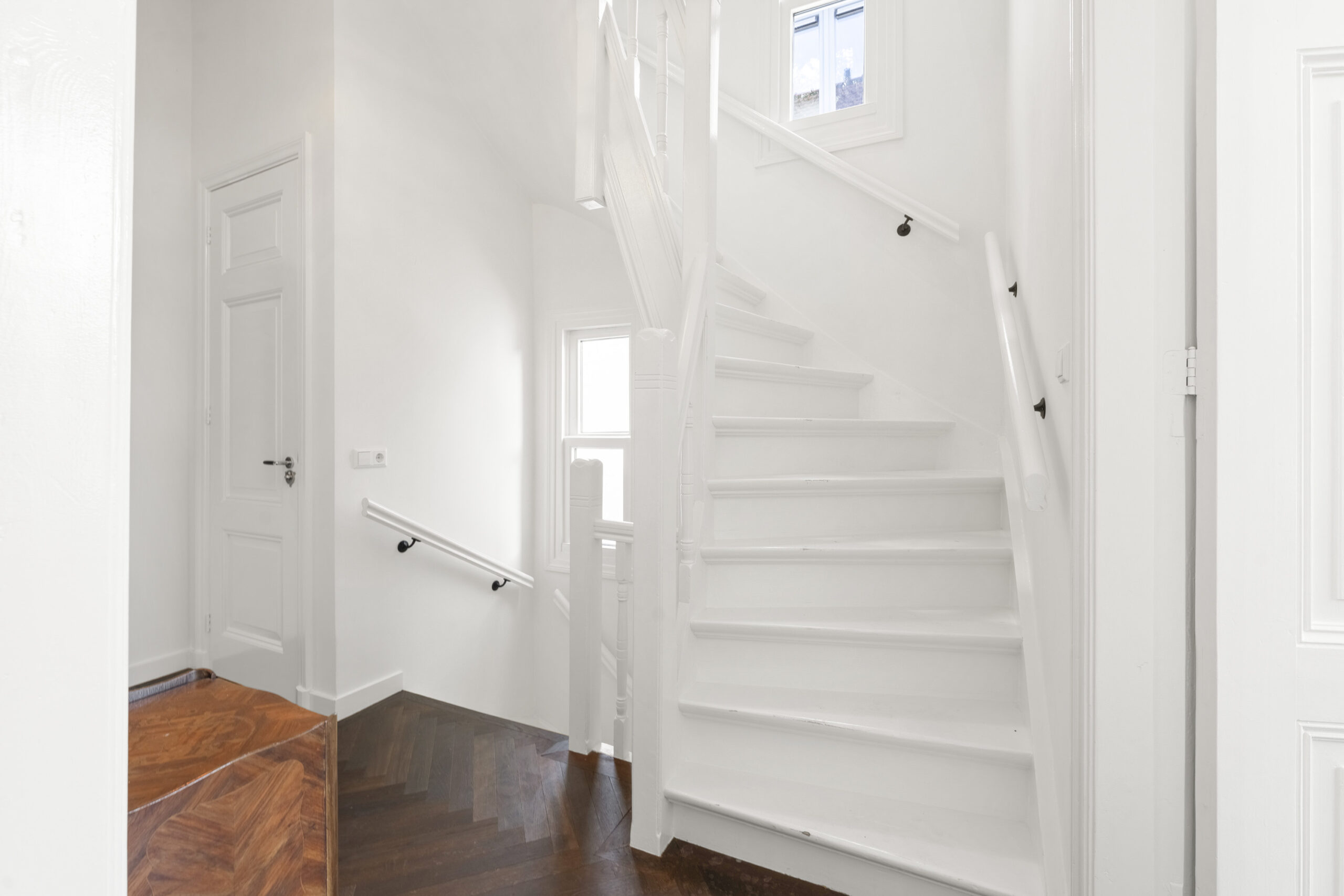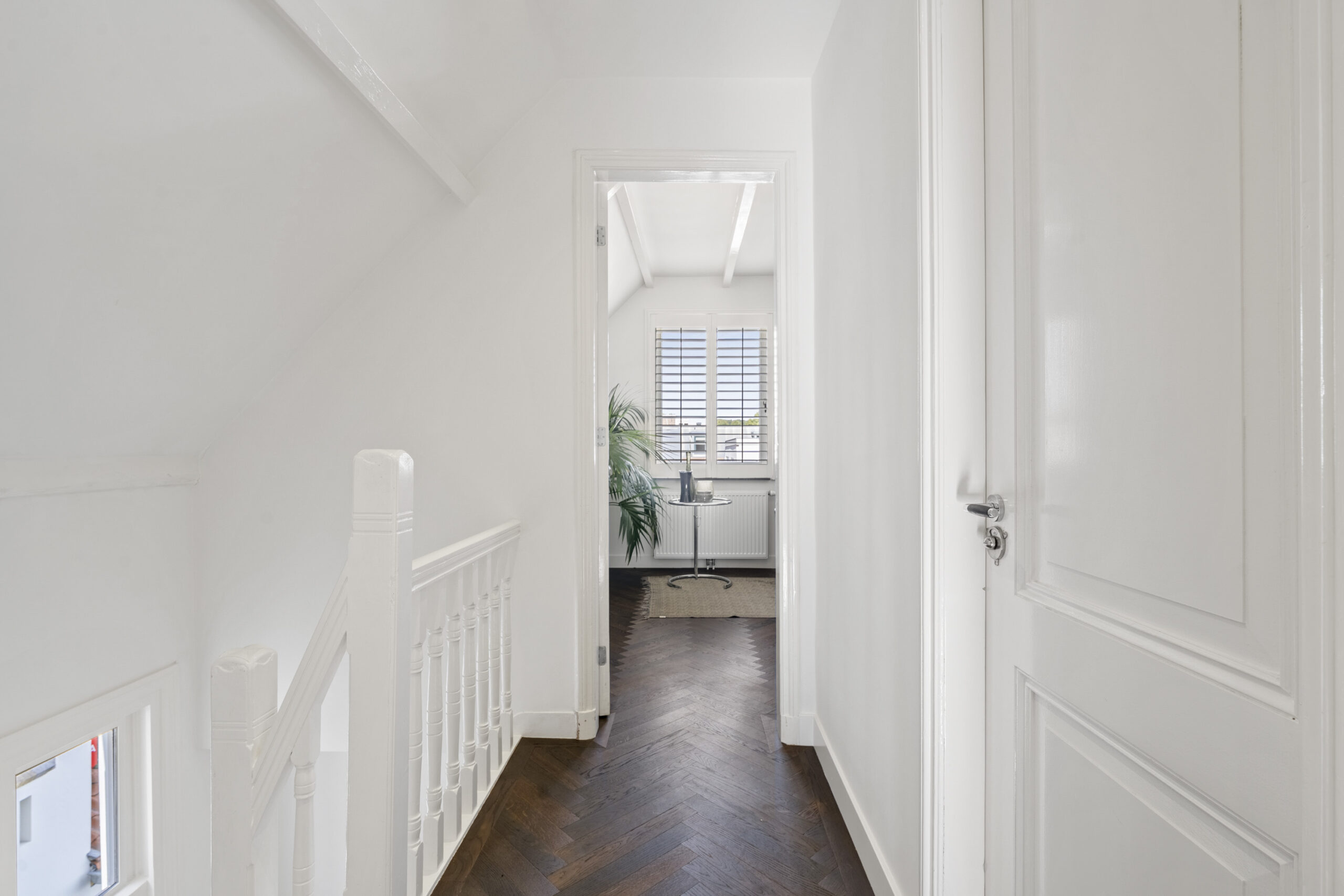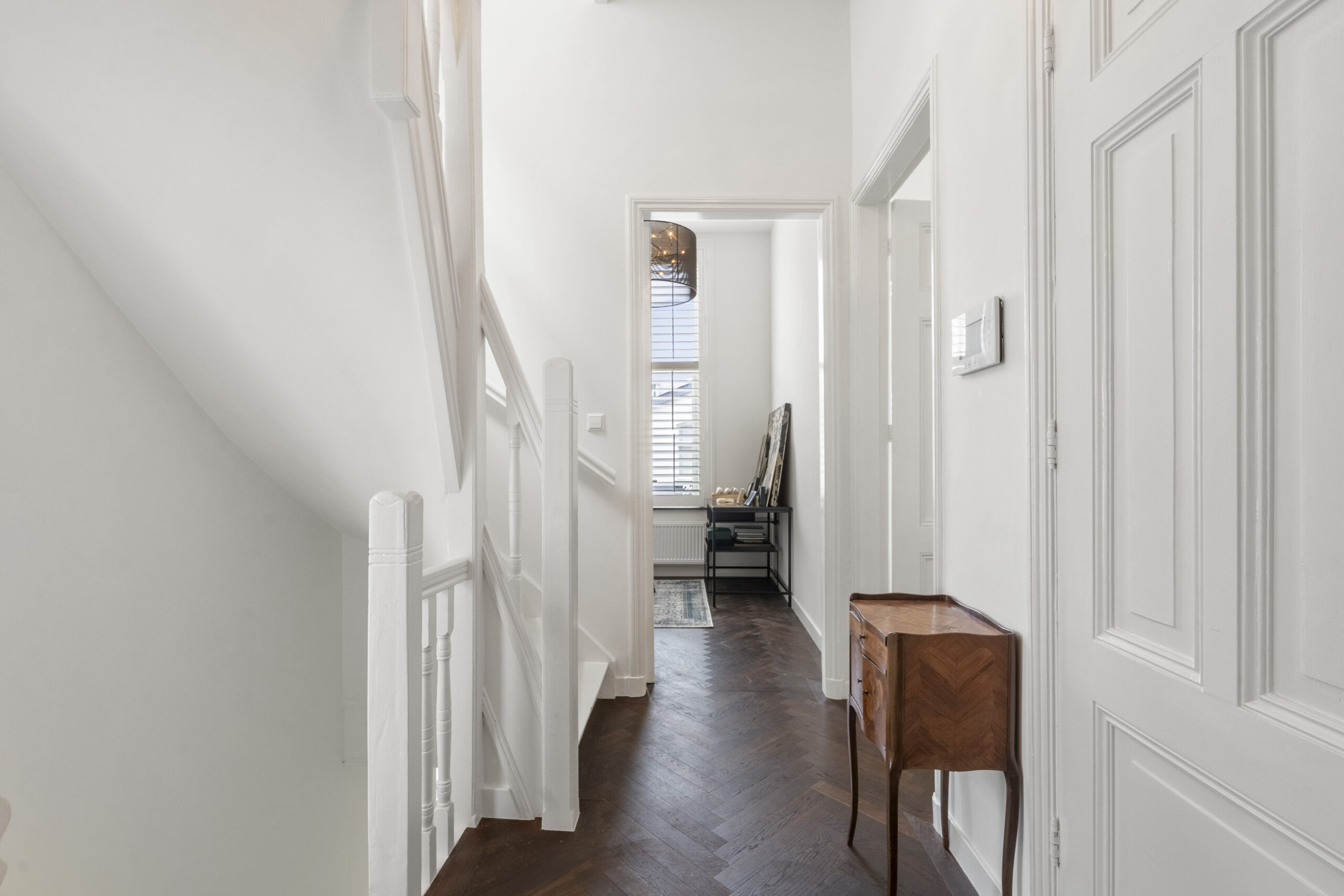 Op de 1e verdieping vind je een royale woonkamer en suite met hoge ornamenten plafonds, een moderne open keuken en een zonnig dakterras op het zuidoosten. Aan de voorzijde ligt een extra kamer, ideaal als werkplek of hobbyruimte. Op de 2e verdieping zijn 3 slaapkamers en een moderne badkamer te vinden. Op de vliering heb je meer dan genoeg bergruimte.