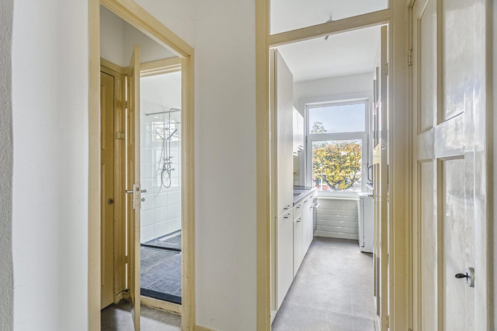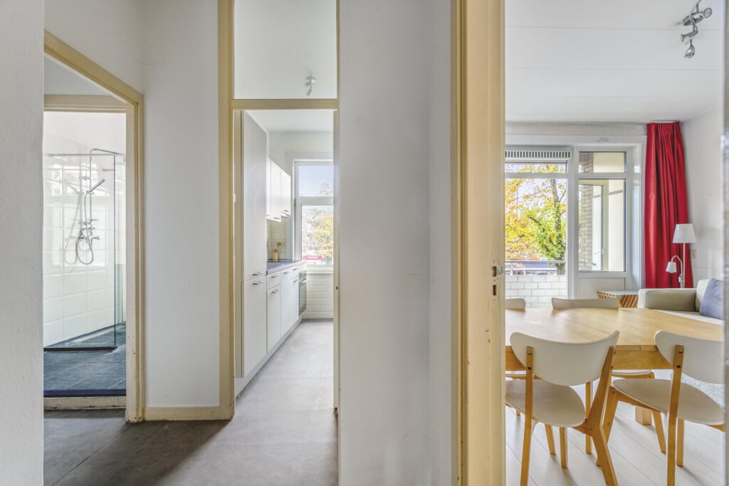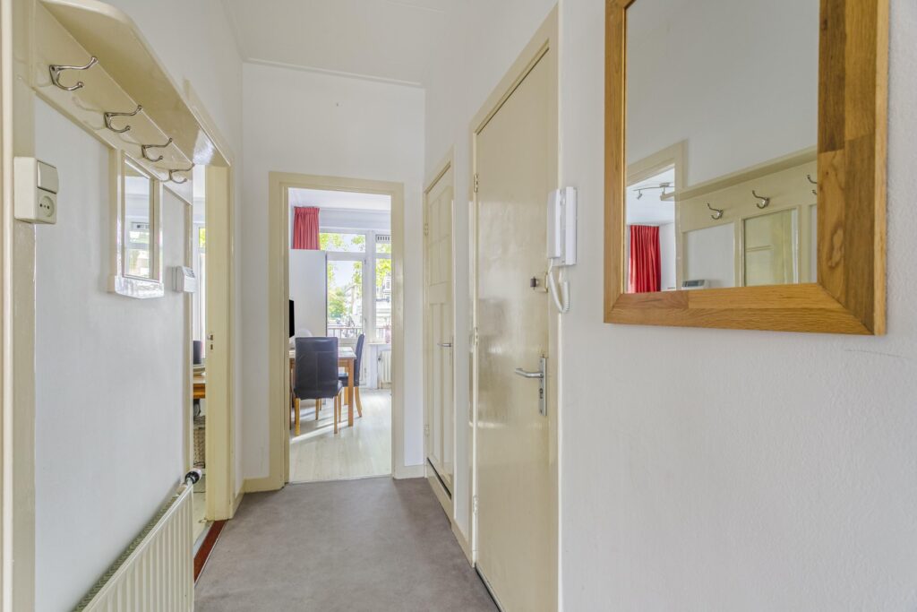 Via de gezamenlijke entree bereik je het appartement op de eerste verdieping. Je komt binnen in de hal, die toegang geeft tot alle vertrekken. In de hal vind je ook twee praktische inbouwkasten, handig en ruimtebesparend.