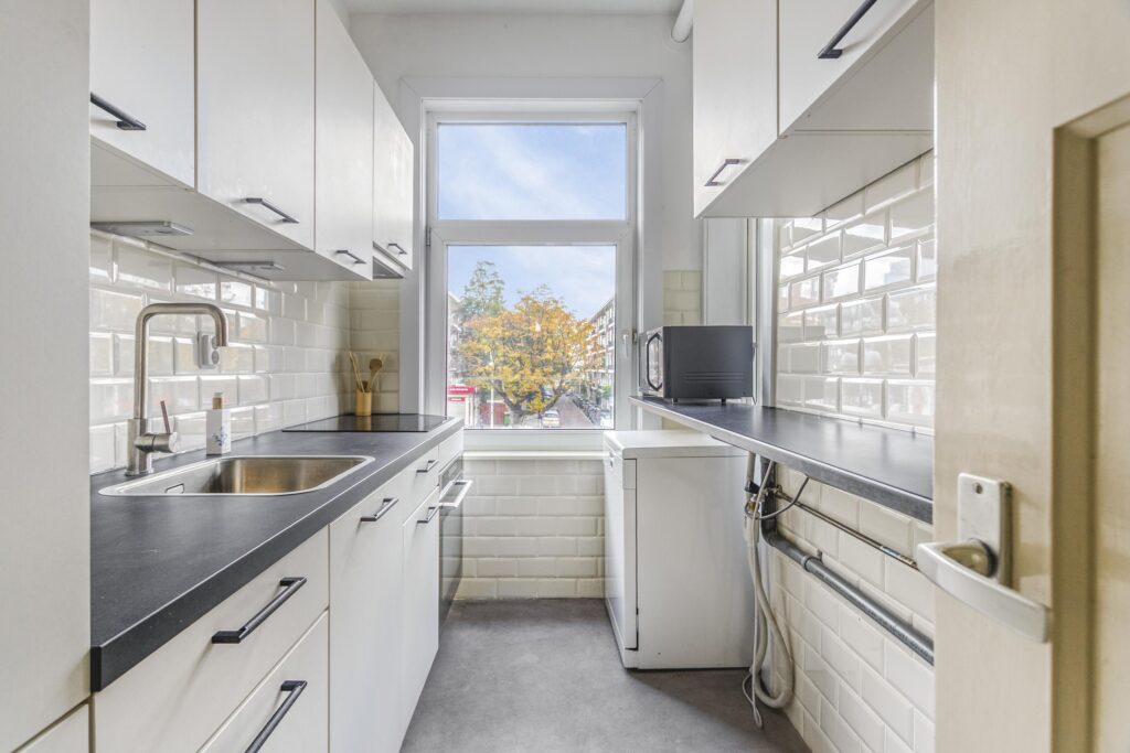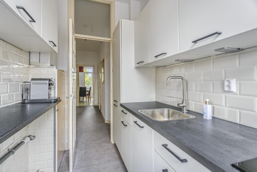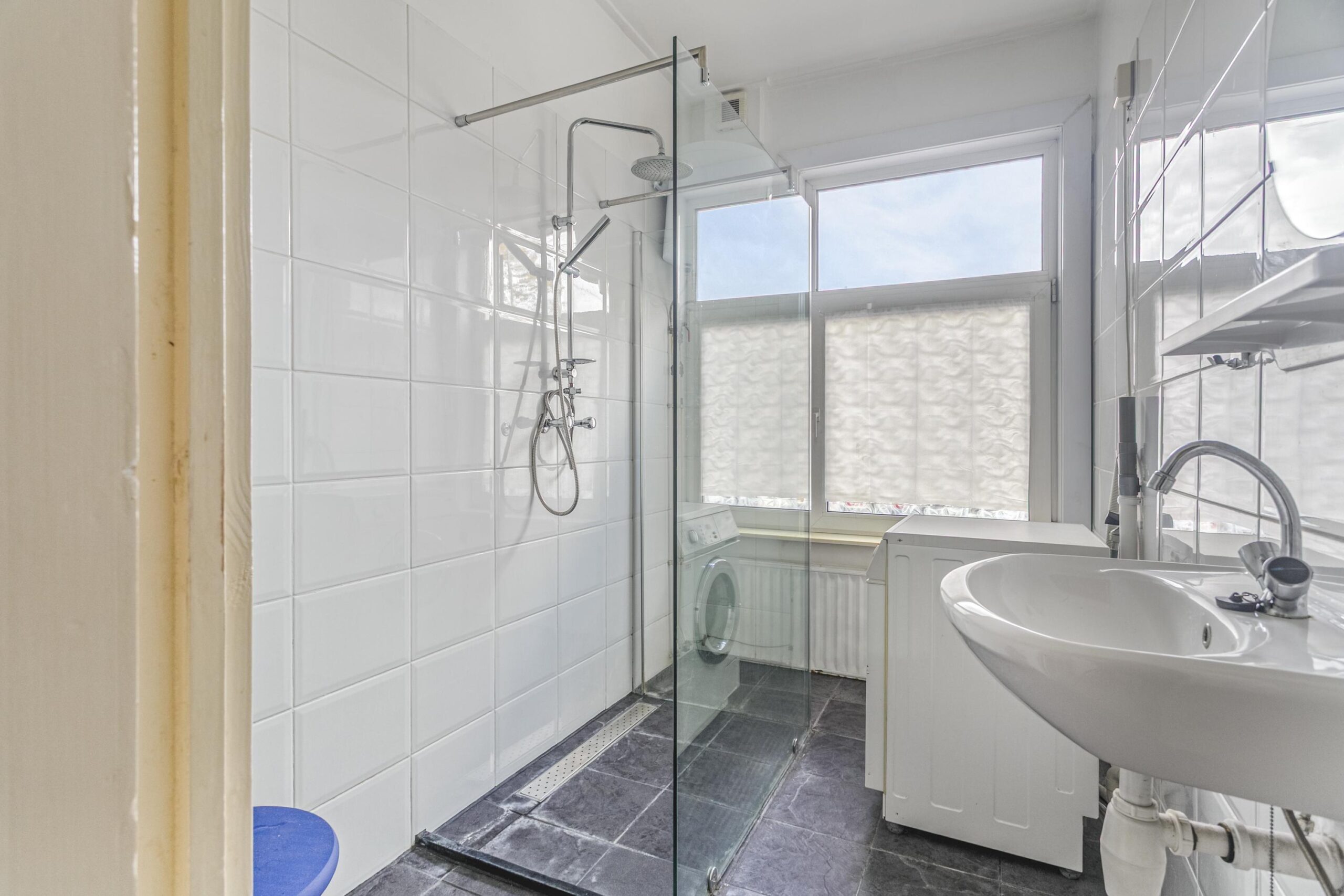Aan de voorzijde van de woning ligt de lichte woonkamer met voldoende ruimte voor een zit- en eetgedeelte. Ook hier is een handige inbouwkast aanwezig, ideaal voor extra bergruimte. Aansluitend vind je de moderne keuken, die is uitgerust met een vaatwasser en inbouwapparatuur zoals een elektrische kookplaat, oven en koelkast. De keuken is strak afgewerkt en biedt veel opbergruimte. De badkamer aan de voorkant is zeer ruim en recent geschilderd. Deze badkamer zou eventueel omgebouwd kunnen worden tot slaap-, kinder-, werk- of logeerkamer.