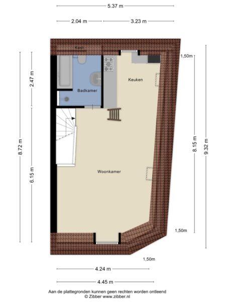 Second floor; living room with on the left the bathroom with bath/shower, toilet, washing machine connection, sink, storage cupboard and towel radiator. Open kitchen with fridge, combi-oven, extractor and 4-burner gas hob. Fixed stairs to the loft (sleeping area).