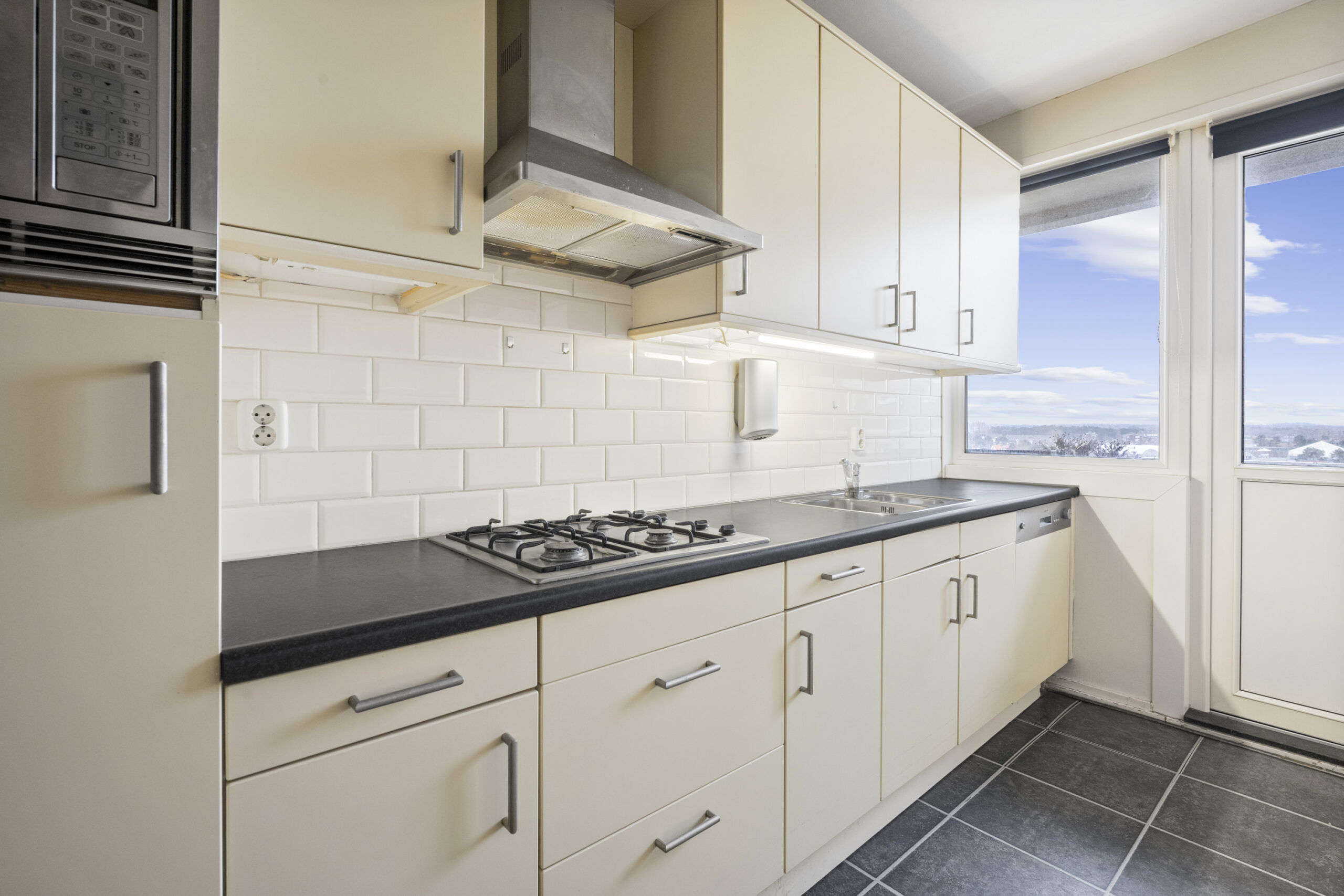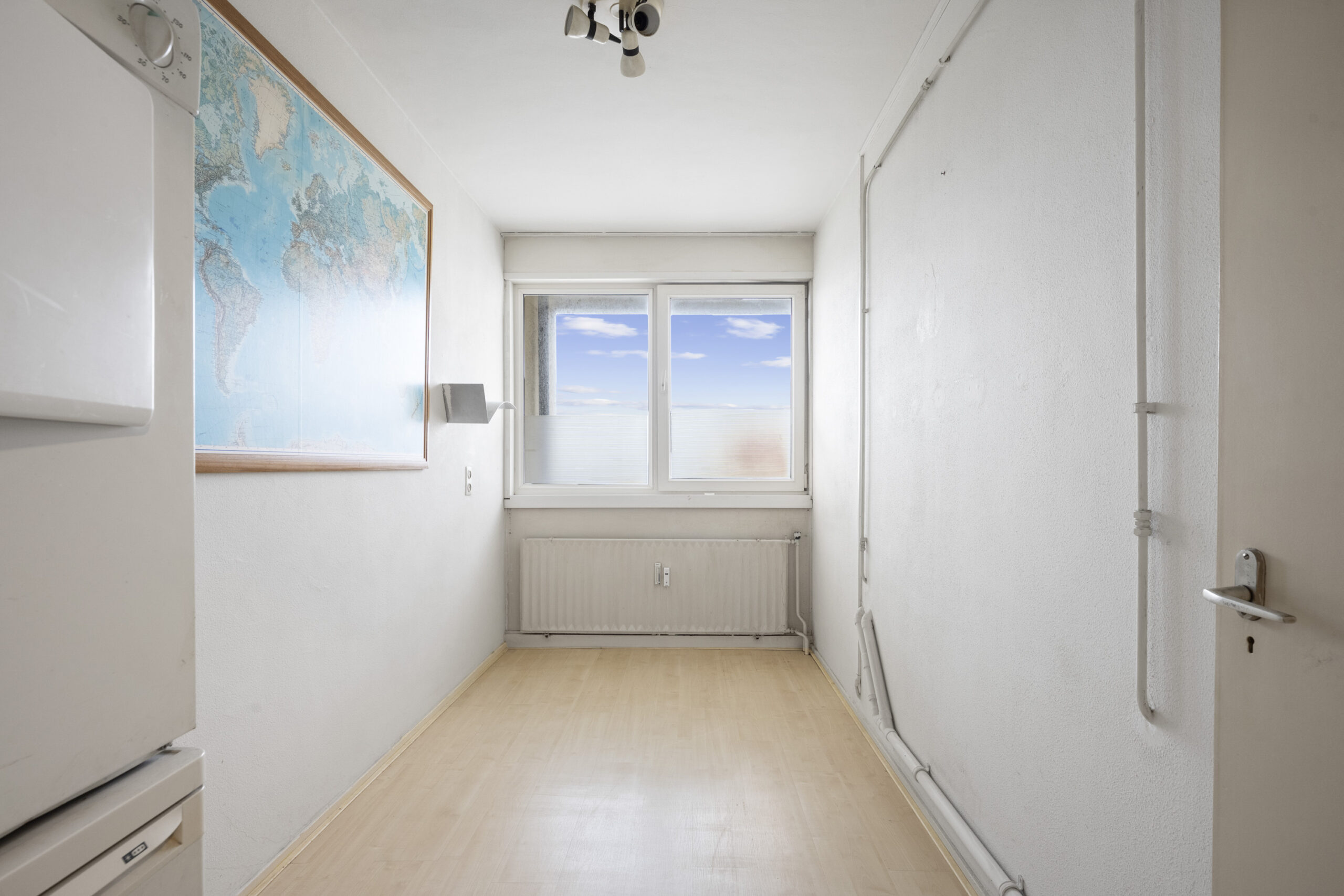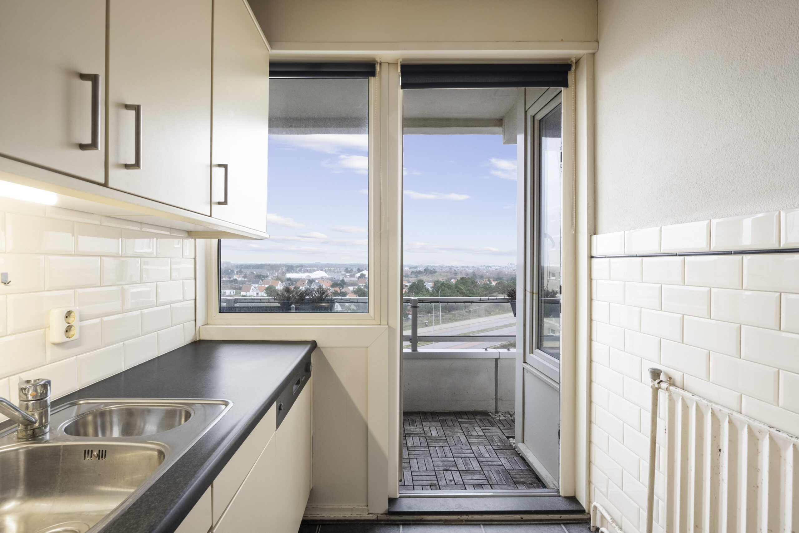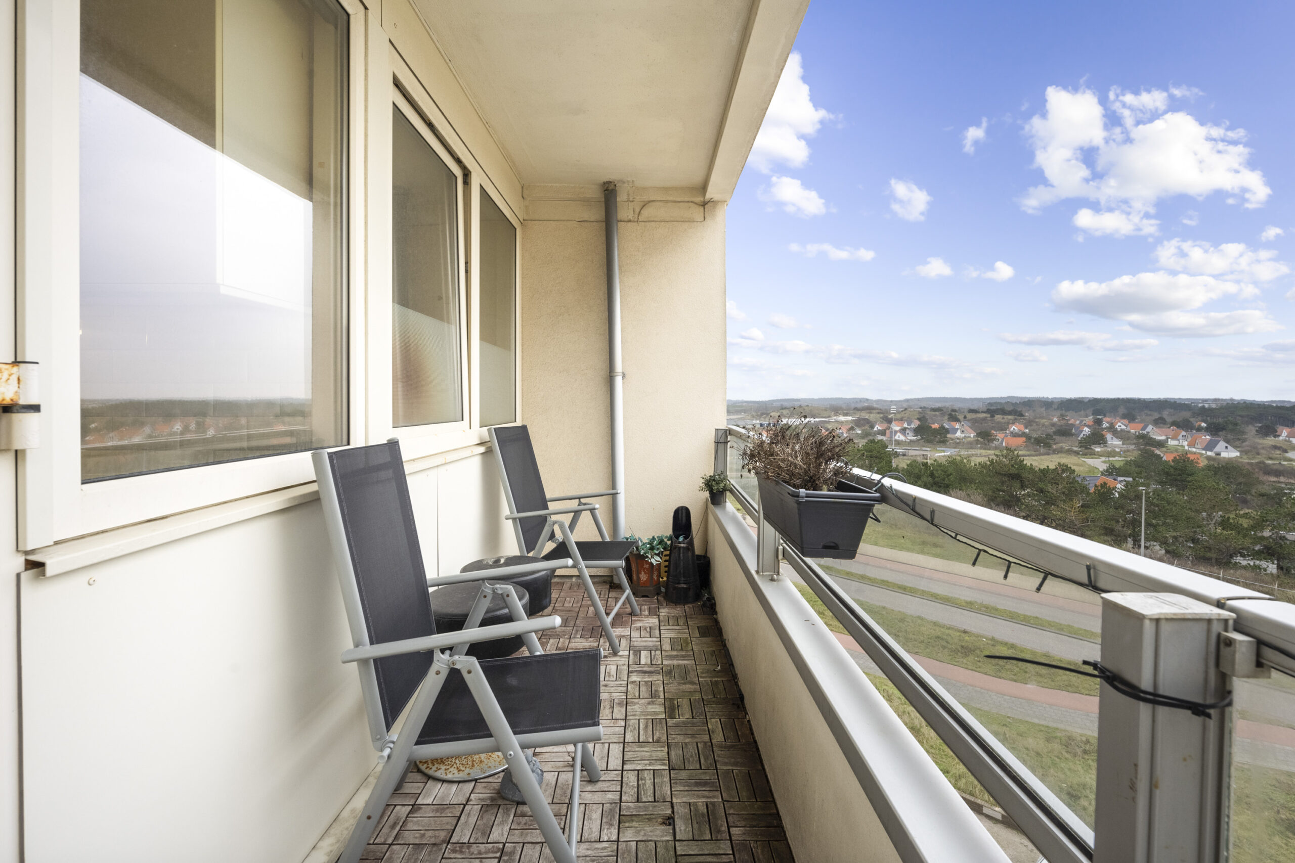 4e Verdieping: gemeenschappelijke hal, entree appartement, hal met houten vloer en toilet, lichte woonkamer met uniek vrij uitzicht, extra zijraam en houten vloer, dichte nette keuken met diverse inbouwapparatuur en deur naar zonnig balkon op het zuidoosten, 2 slaapkamers, eenvoudige nette badkamer met douche, wastafel, wasmachine aansluiting en handdoekradiator