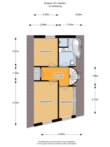 1e Verdieping: ruime overloop met aparte inloopkast, één slaapkamer aan de achterzijde, twee slaapkamers aan de voorzijde waarvan één met vaste kast. Badkamer met ligbad, inloopdouche, tweede toilet, wastafel en dakraam.