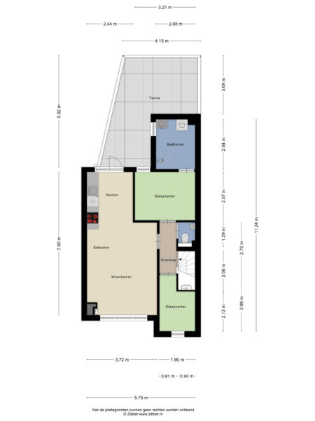 Private entrance with meter cupboard and stairs to the flat. The hall connects all rooms. The bright living room/kitchen has access to the spacious south-facing roof terrace.