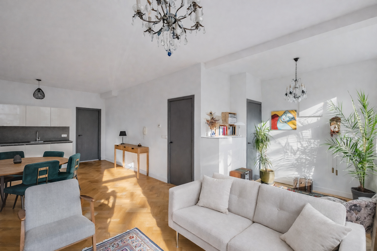 On the left side of the living room is a versatile and attractive space, ideal as an additional seating area and easily separable into a second bedroom or a comfortable home office.