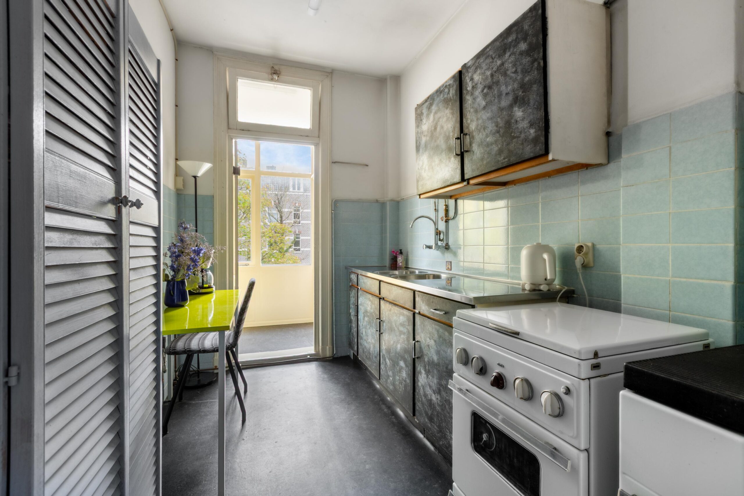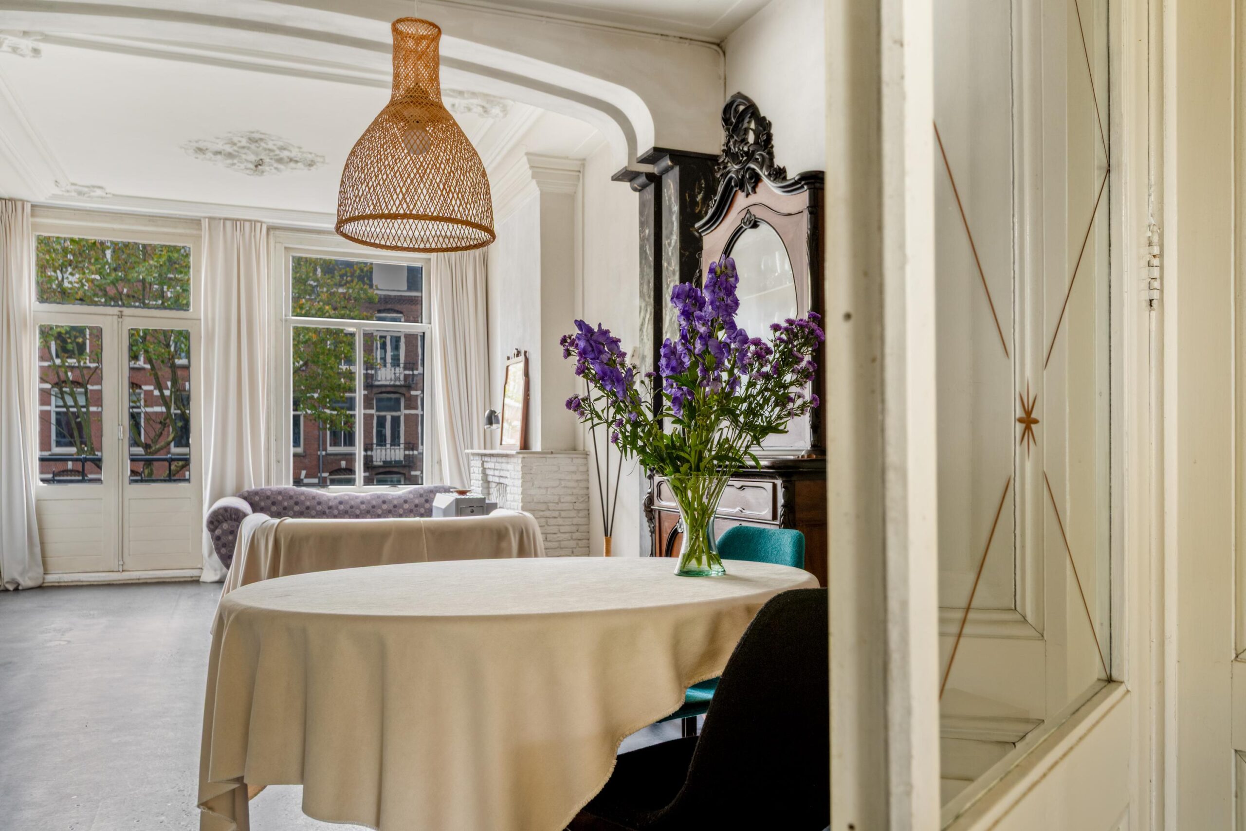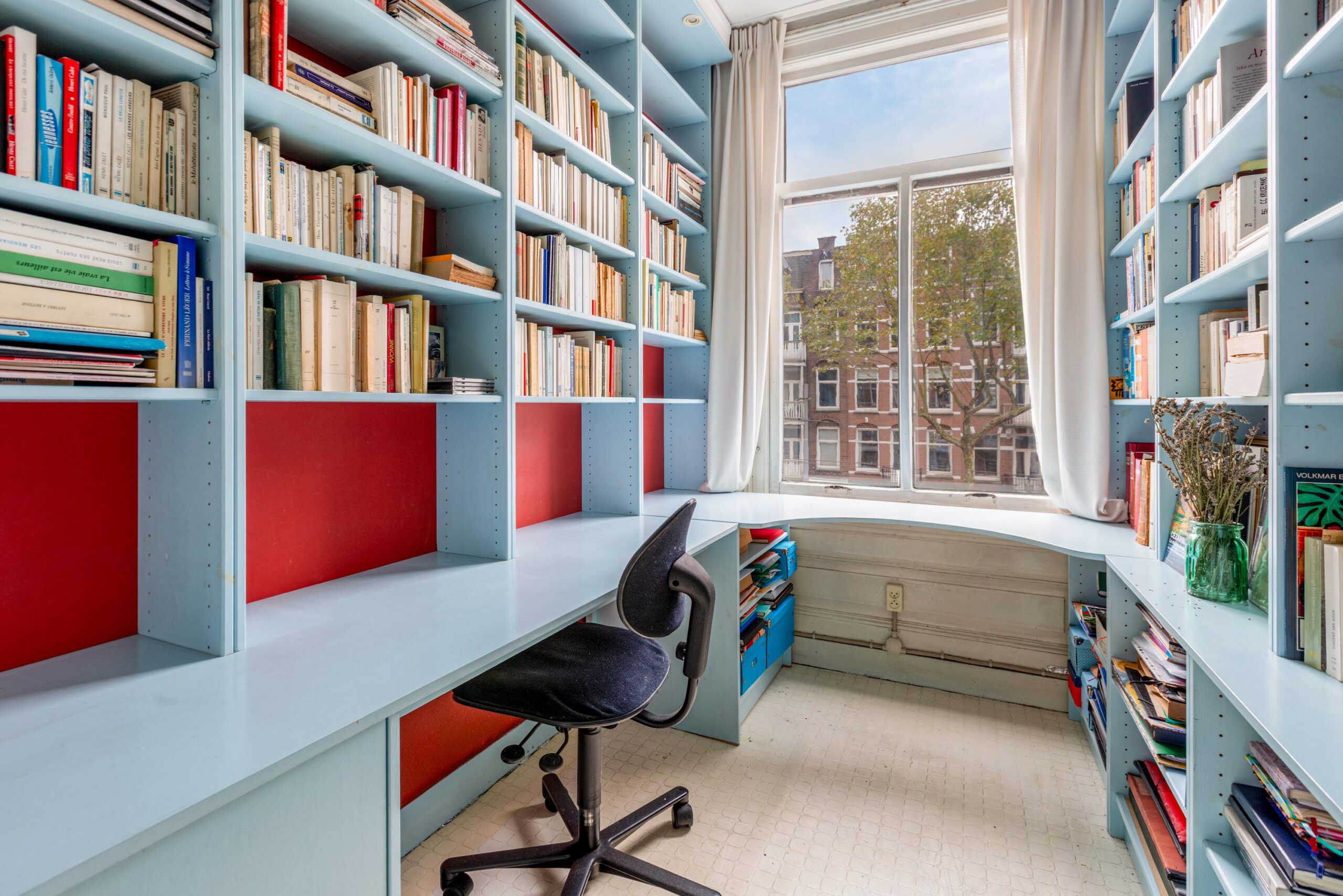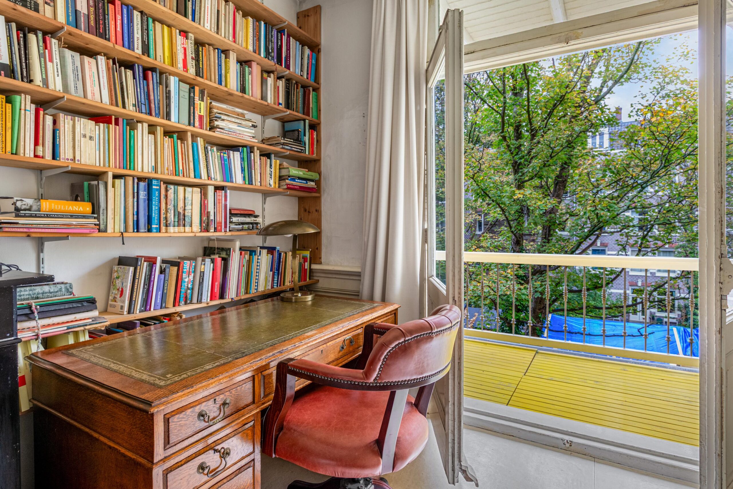 The apartment also includes an additional (work/bed)room, offering flexible layout options, ideal for anyone needing a home office or guest room. From the living room, French doors also open onto the front balcony, where you can enjoy the lively atmosphere of the Ceintuurbaan.