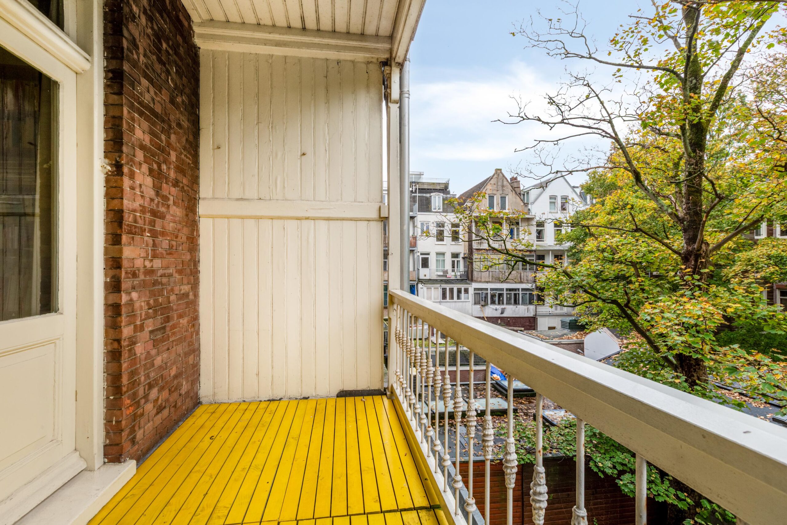 Aan de linkerzijde bevindt zich de lichte woonkamer met originele ornamentenplafonds en fraaie glas-in-looddetails. Via Franse openslaande deuren is er directe doorgang naar de slaapkamer, die op zijn beurt toegang biedt tot het 1,5 meter diepe balkon aan de achterzijde. Nu is de helft van het balkon dicht gezet, maar deze m2 zijn niet in het meetrapport meegenomen.