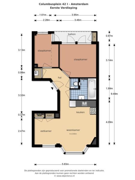 Bij binnenkomst arriveert u in de hal welke toegang geeft tot alle vertrekken. Aan de voorzijde is de ruime woonkamer met leefkeuken. De erker zorgt voor veel lichtinval en geeft vrij uitzicht over het Columbusplein. De moderne leefkeuken is voorzien van diverse inbouwapparatuur zoals een 4-pits gasfornuis, afzuigkap, vaatwasser, oven/magnetron combinatie en koel/vriescombinatie. Aan de achterzijde zijn de twee slaapkamers gelegen welke beide toegang bieden tot het balkon gelegen op het zuid/westen. De master bedroom is 3,46m x 3,14m. De tweede slaapkamer is 3,13m x 2,28m. De moderne badkamer is voorzien van een douche, bad en wastafel. Op de gang heeft u toegang tot het separaat toilet met fontein.