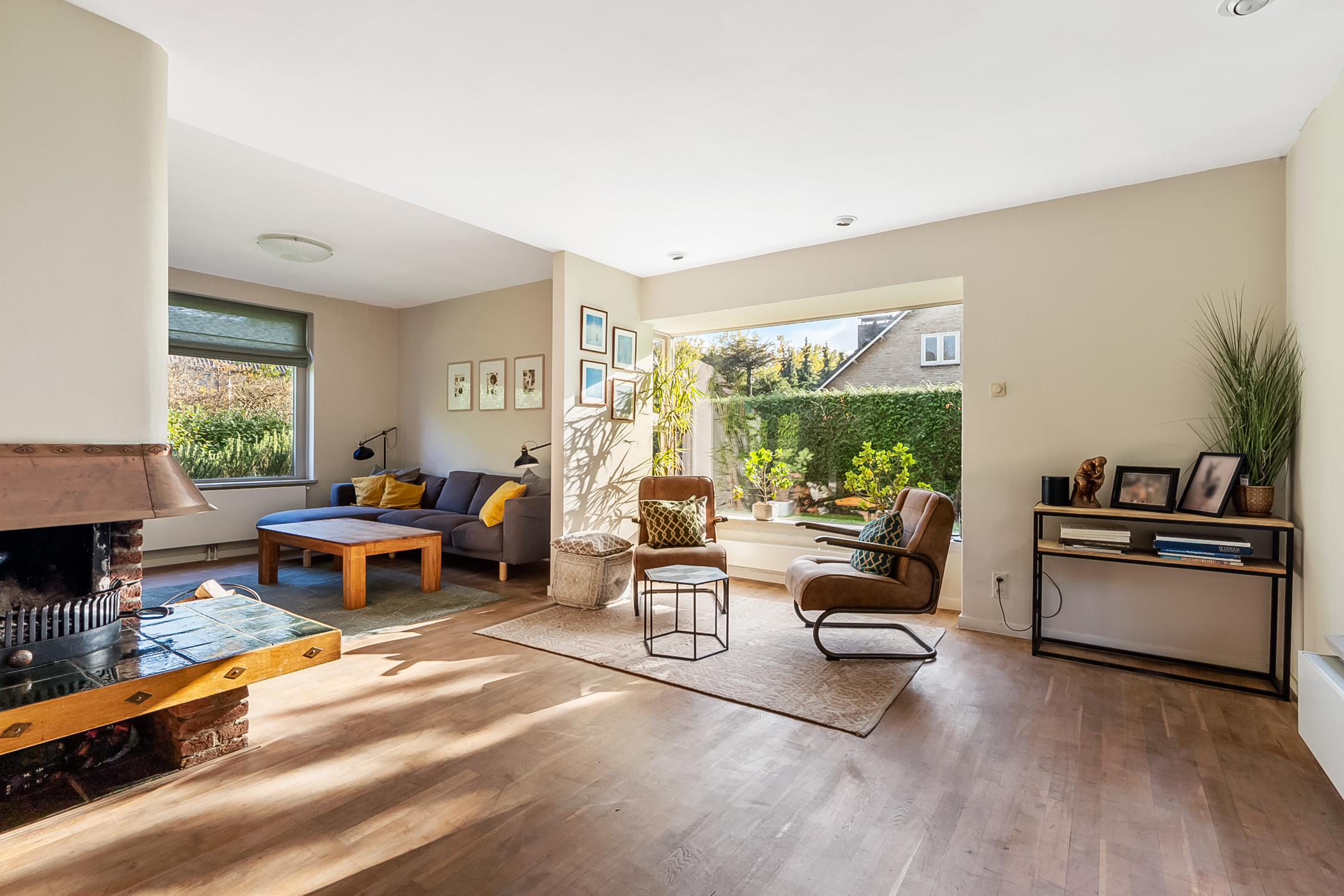 De L-vormige woonkamer (46 m²) heeft een parketvloer, open haard en grote raampartijen met zicht op de tuin. De woonkeuken (2028) is modern uitgevoerd en voorzien van diverse inbouwapparatuur.