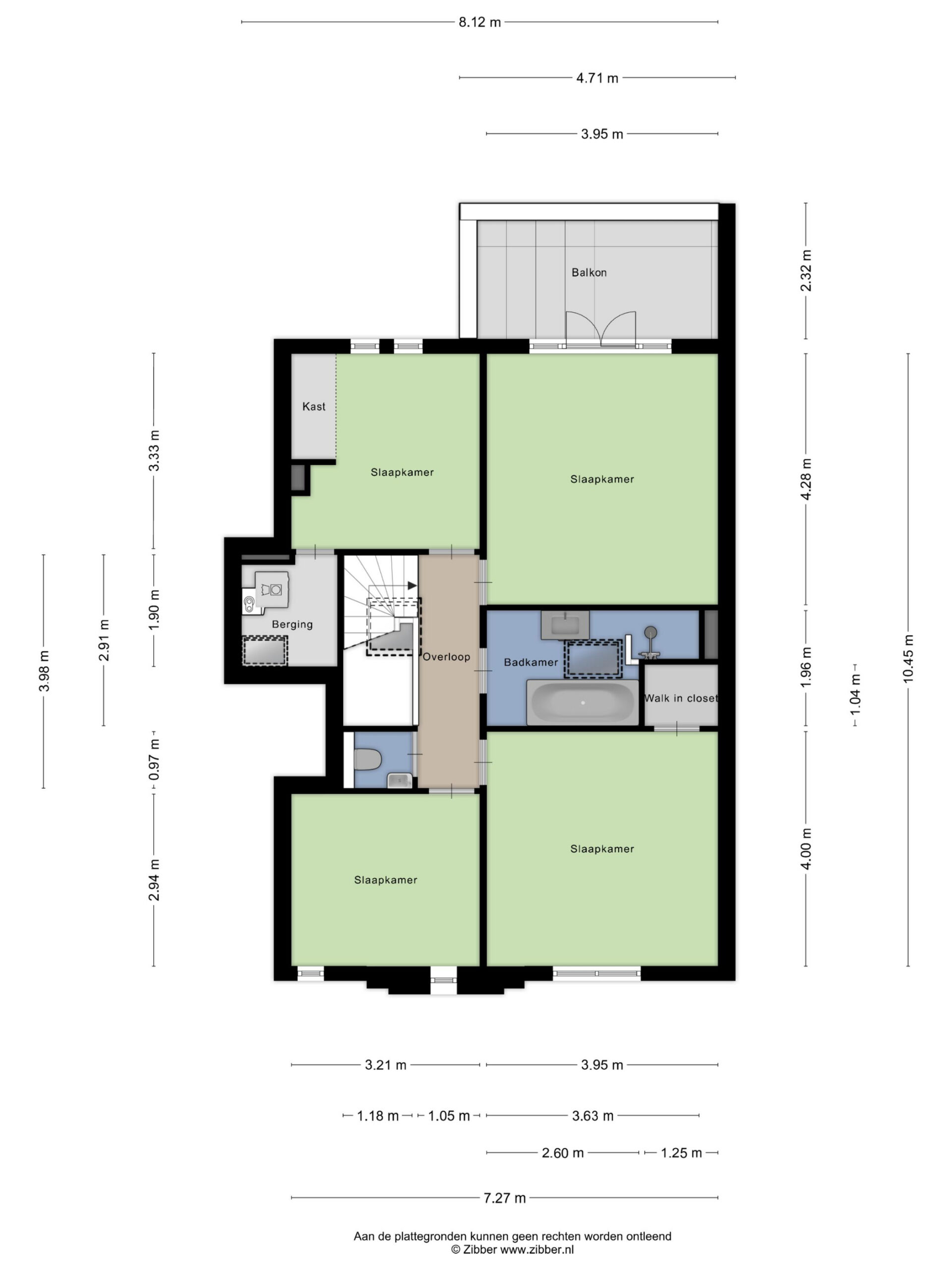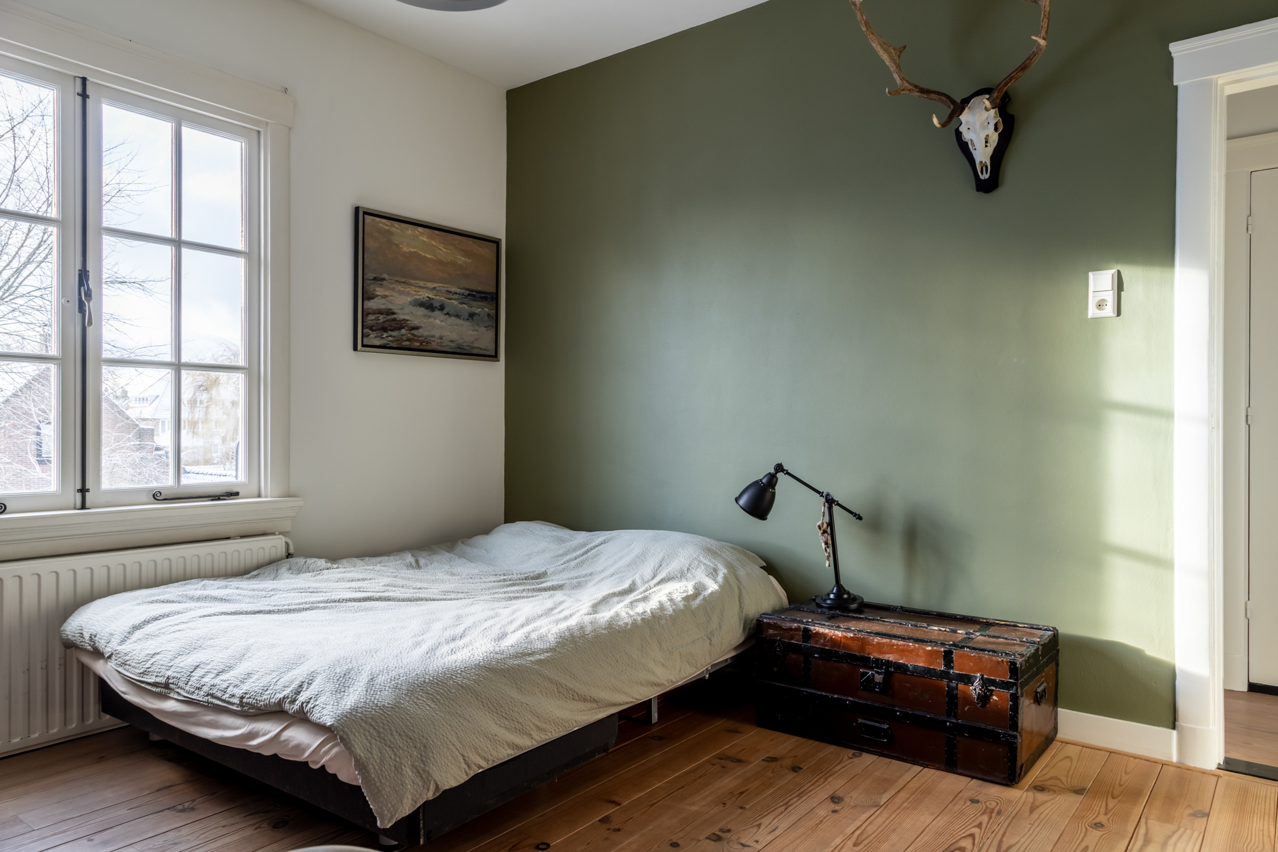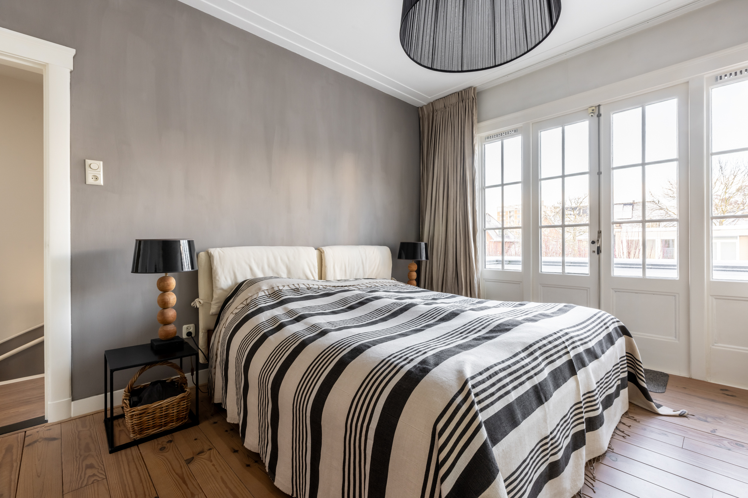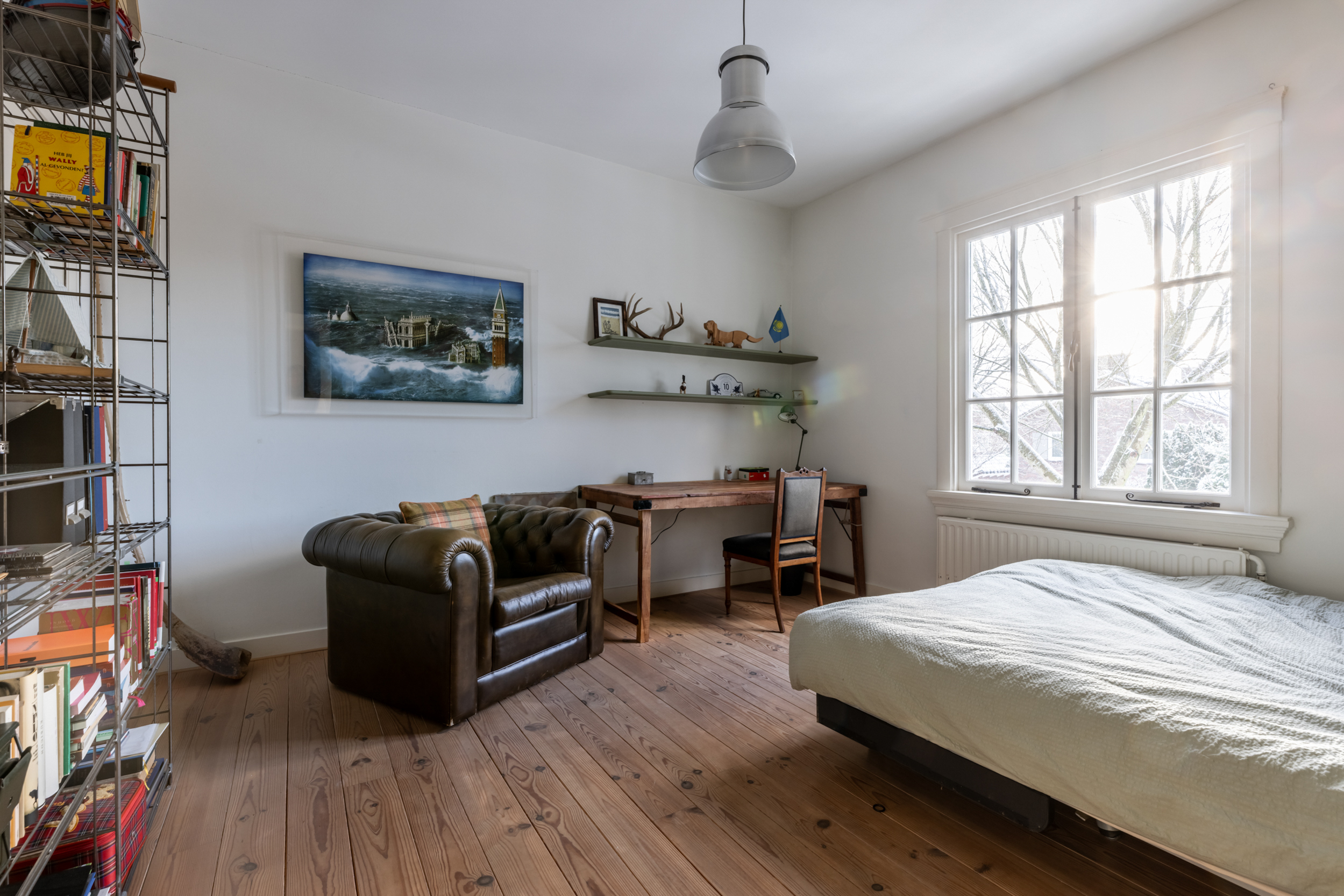 A beautiful wooden staircase leads to the first floor. Here you will find four bedrooms, a bathroom, and a separate toilet. The master bedroom has French doors that open onto the balcony, offering a view of the garden. Immediately upon arrival, there is a slightly smaller bedroom, perfect as a study or children’s room. From this room, there is access to the storage/boiler room. Between the master bedroom and a second spacious bedroom is the stylish bathroom, which has a bathtub, a walk-in shower, a sink, and a skylight that provides plenty of light. The fourth bedroom is located at the front of the house.