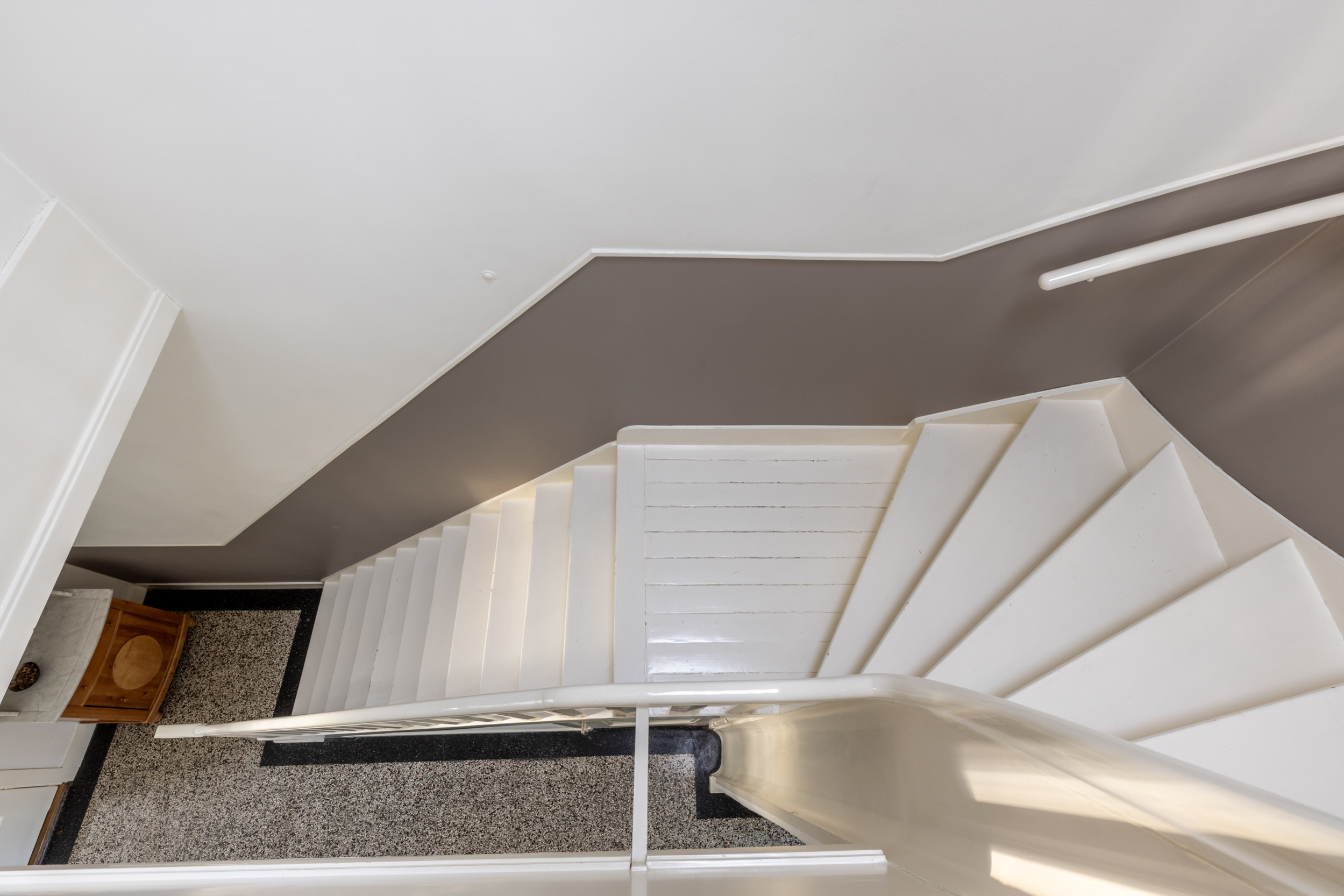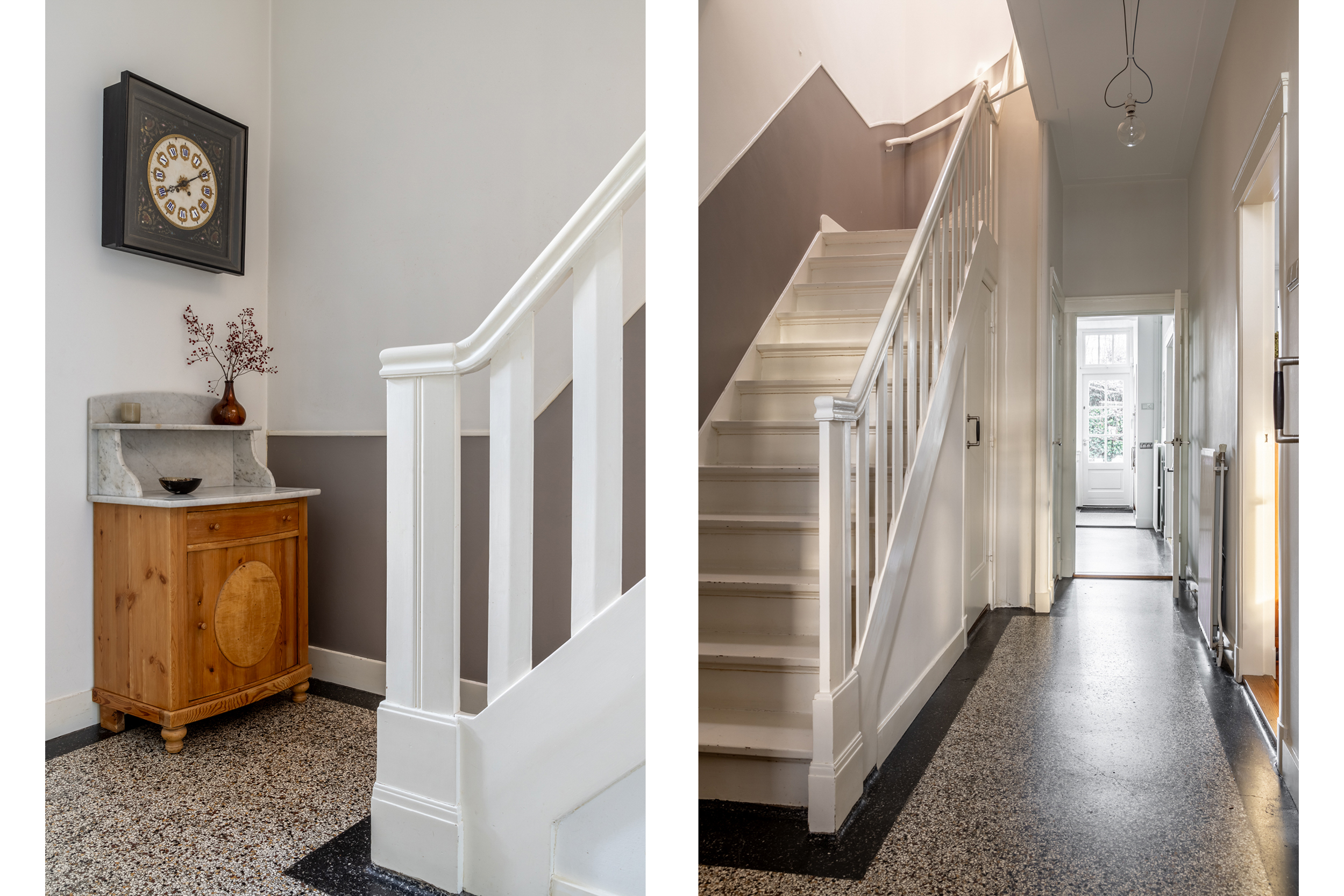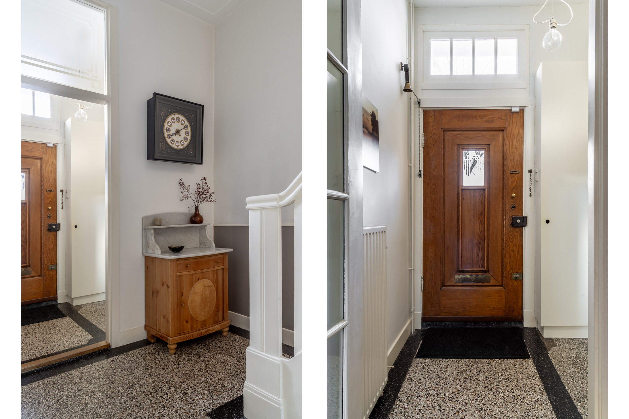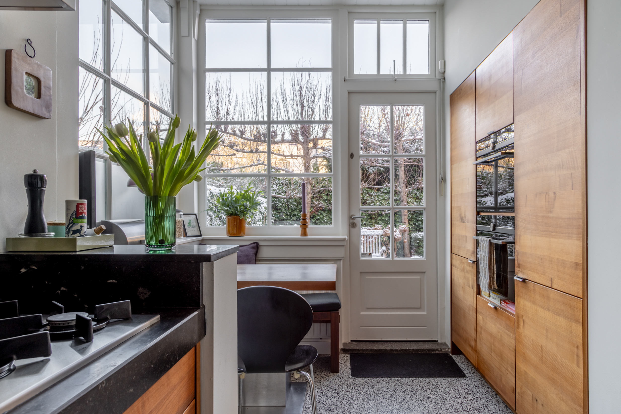 Via de entree betreed je de vestibule, waar direct de originele monumentale granito vloer in het oog springt. Deze vloer loopt door in de hal en vormt een stijlvolle overgang naar de keuken. De keuken is uitgevoerd in hout, passend bij de sfeer van de woning, en voorzien van een robuust natuurstenen werkblad. De gezellige ontbijtcorner maakt dit tot een fijne plek om de dag te beginnen.