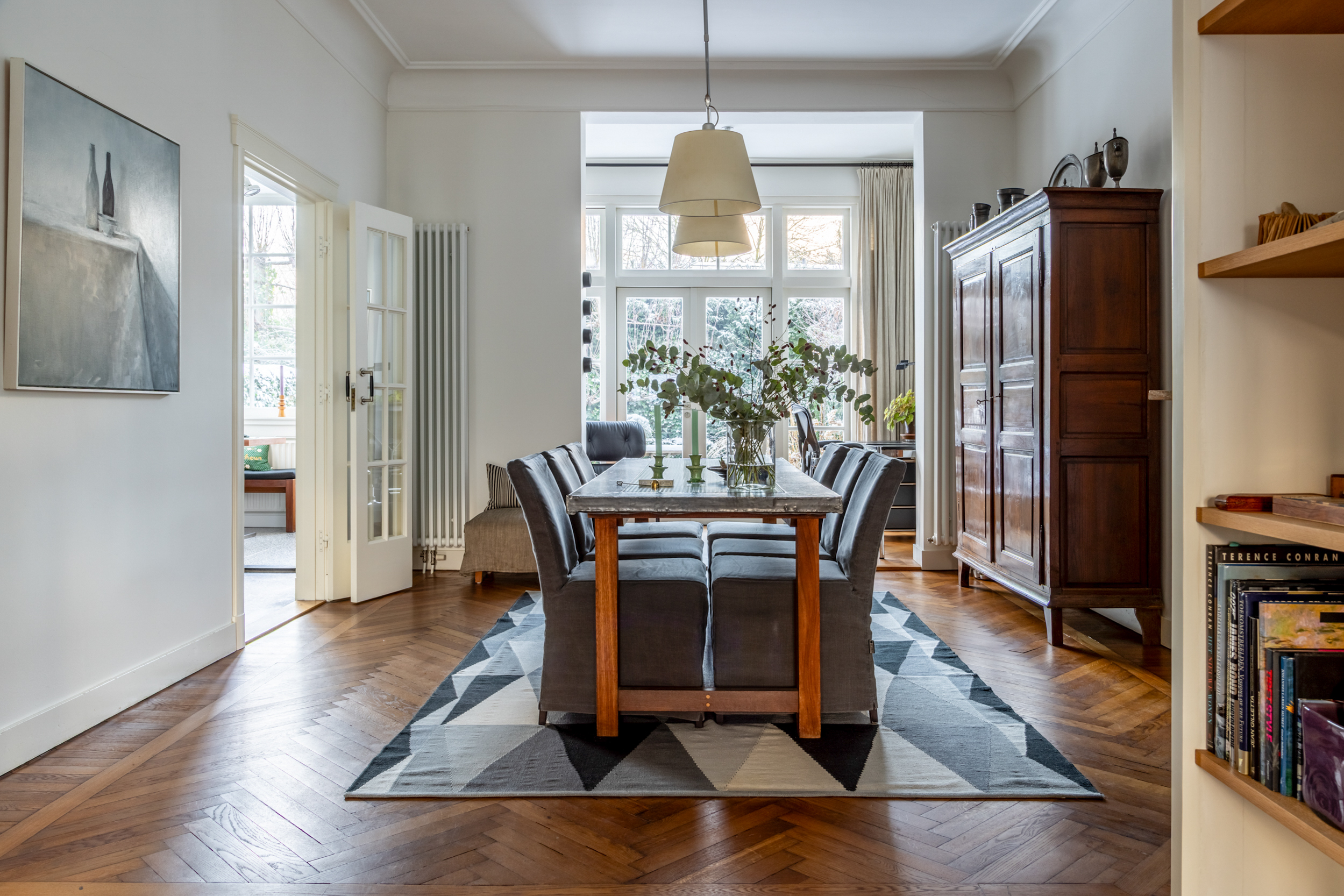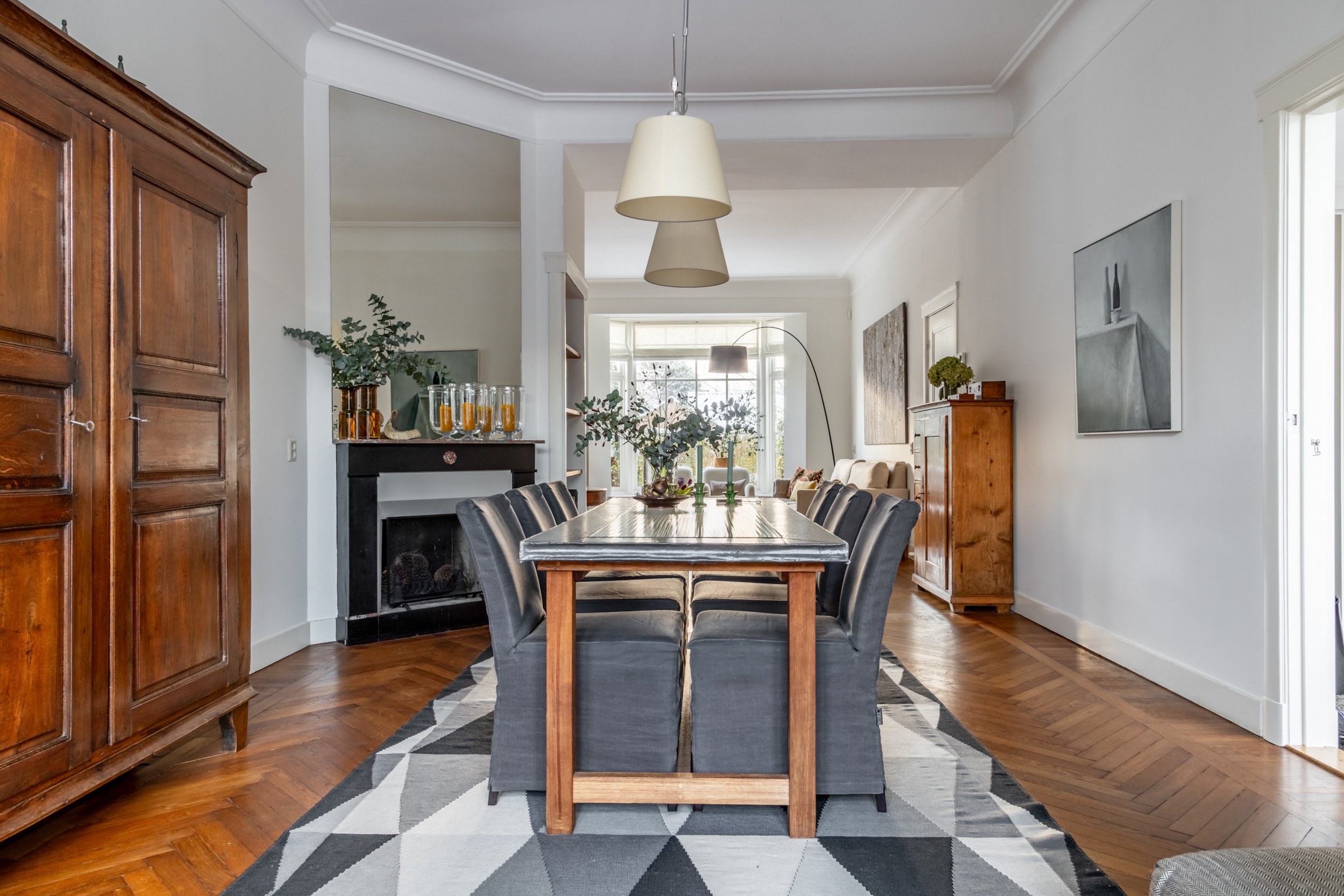 The living room and dining room feature the original solid herringbone parquet flooring. The front of the house has monumental double glazing, which contributes to comfort and energy efficiency without detracting from the character of the house.