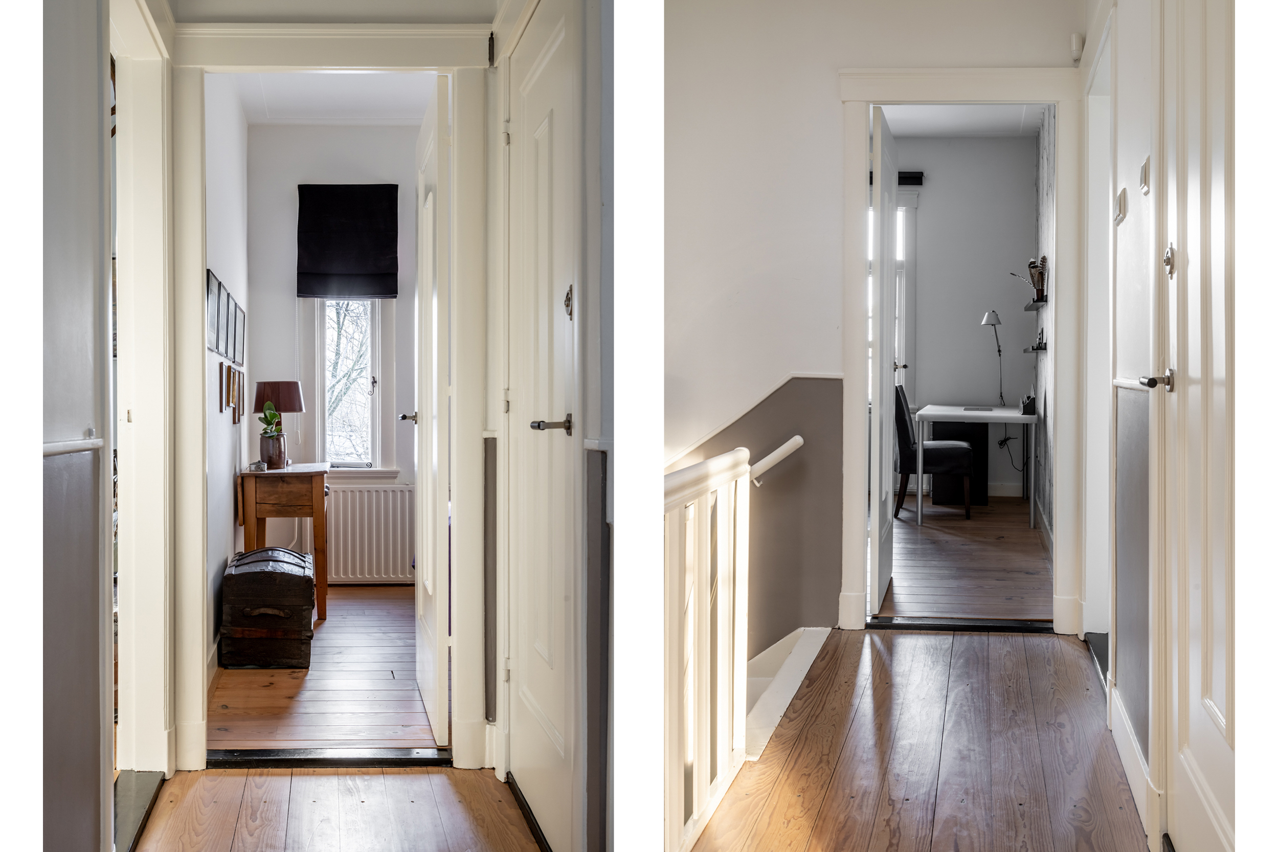 In de woonkamer en eetkamer ligt de originele massieve visgraat parketvloer. Aan de voorzijde is de woning voorzien van monumentaal dubbel glas, wat bijdraagt aan comfort en energiezuinigheid, zonder afbreuk te doen aan het karakter van het huis.