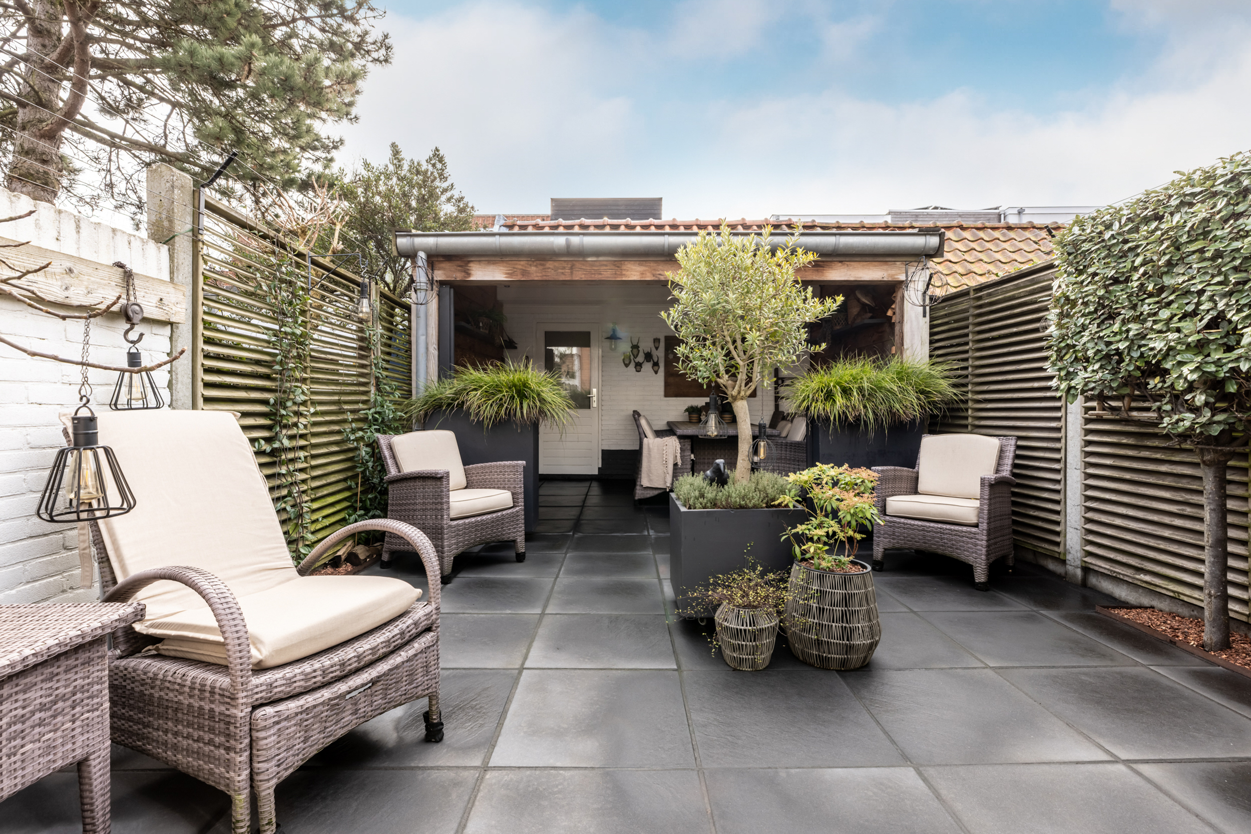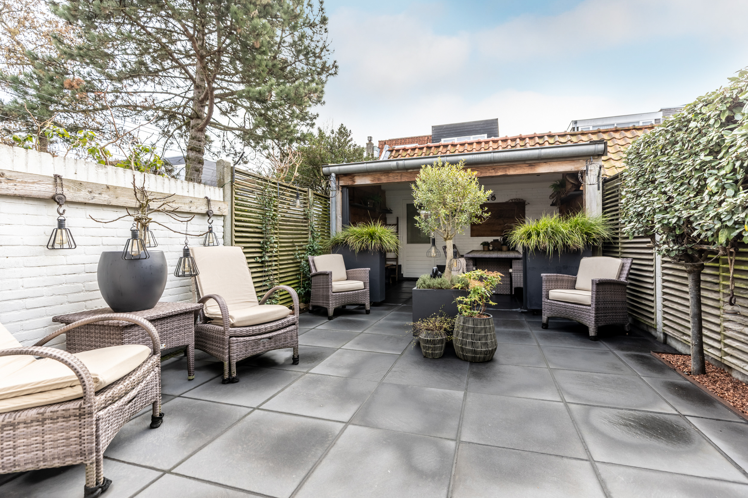 * Zeer zonnige achtertuin (zuid) met veranda, berging en achterom