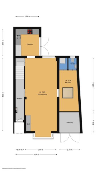 Entree, hal met garderobe, moderne meterkast en trapopgang. De lichte woonkamer beschikt over een karakteristieke erker en toegang tot een ruime kelder. Aan de achterzijde bevindt zich een luxe open keuken met diverse inbouwapparatuur en openslaande deuren naar de zonnige stadstuin. Aansluitend een multifunctionele werk-/speelkamer met dakkoepel voor extra lichtinval. Daarnaast is er een modern toilet met fonteintje, een separate wasruimte met aansluitingen voor wasmachine en droger, en toegang tot de kelder met volop bergruimte.