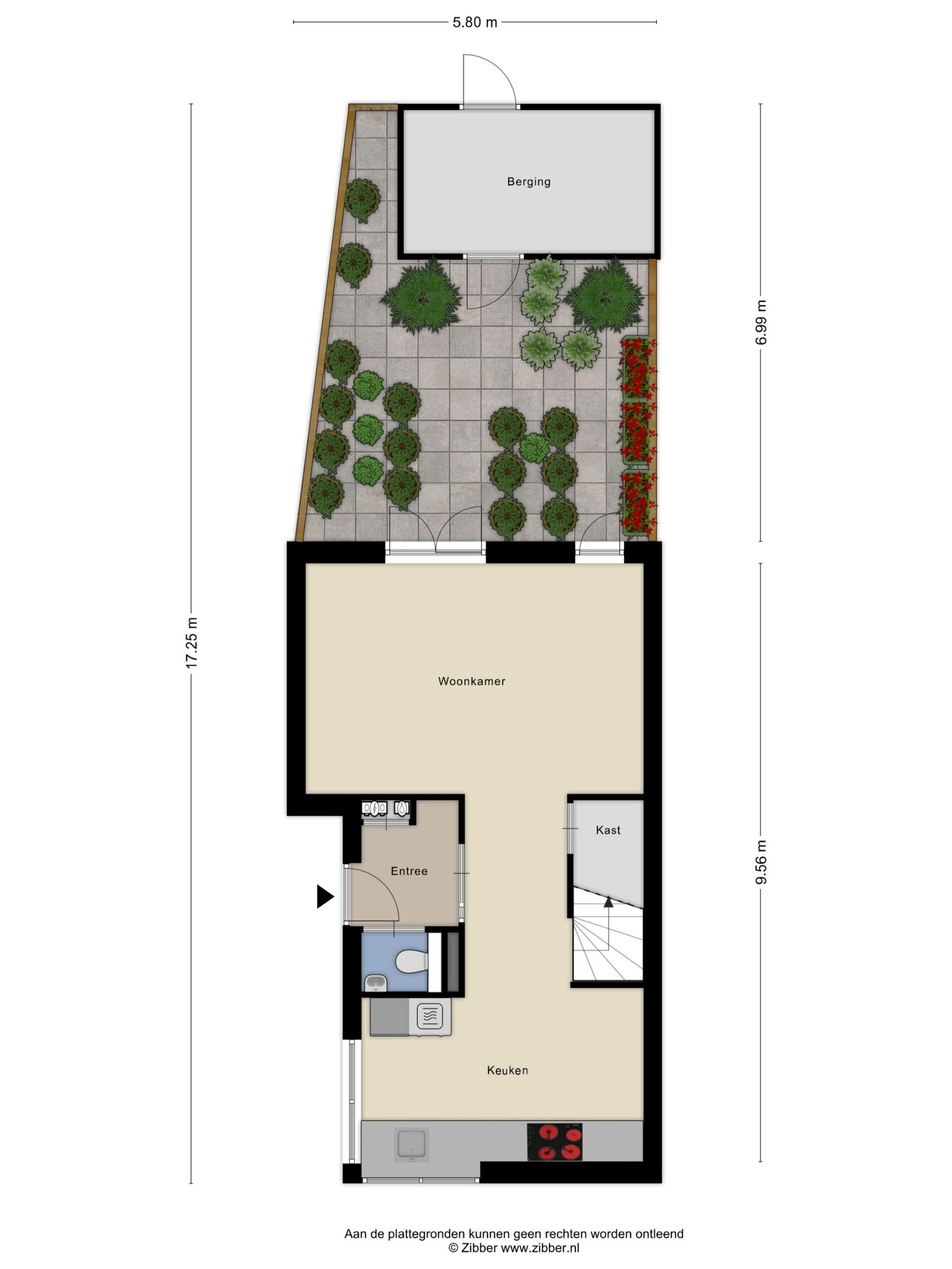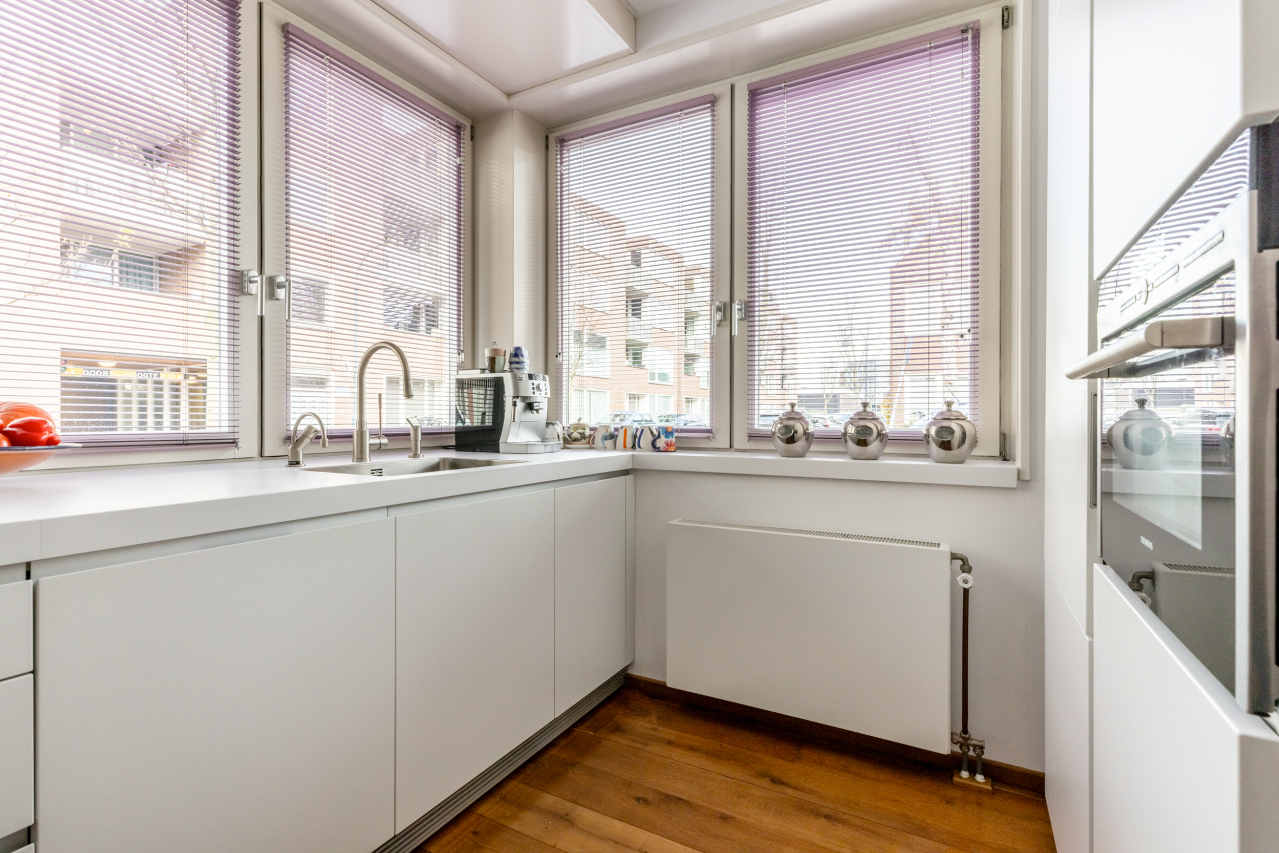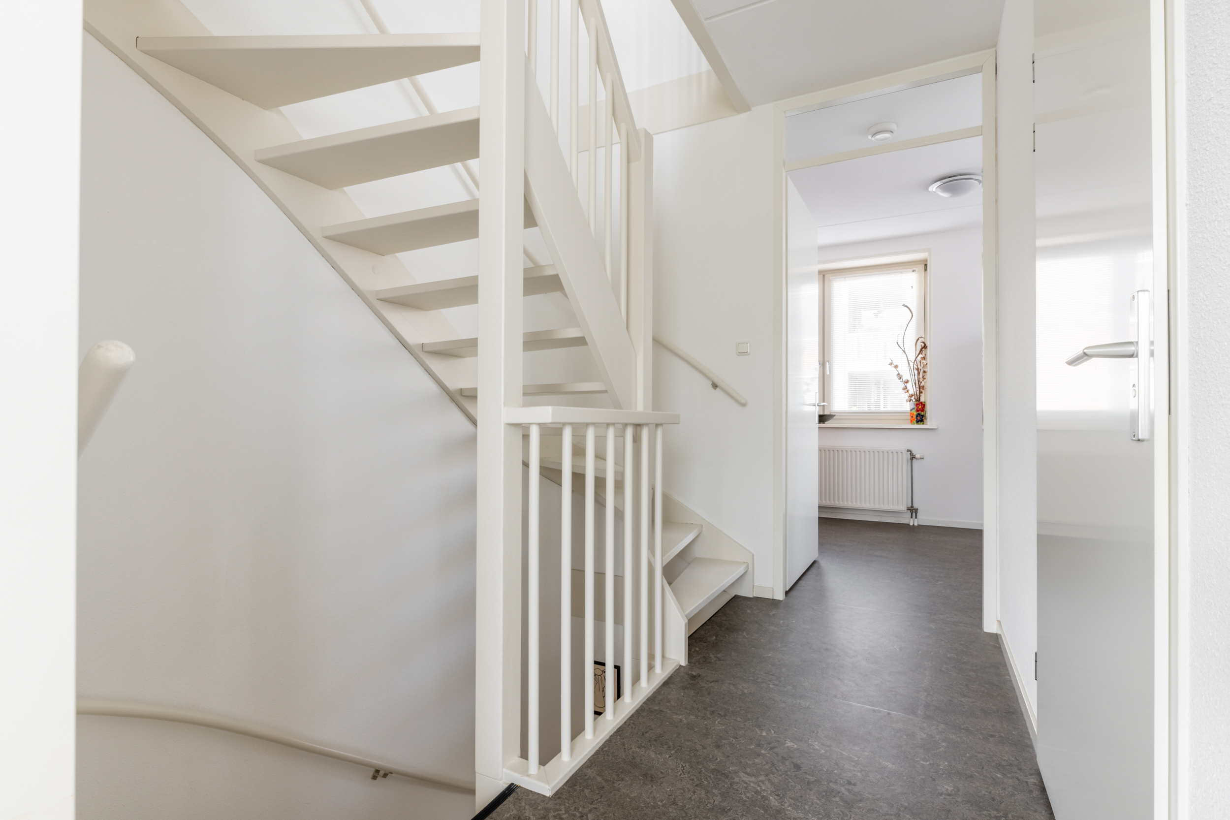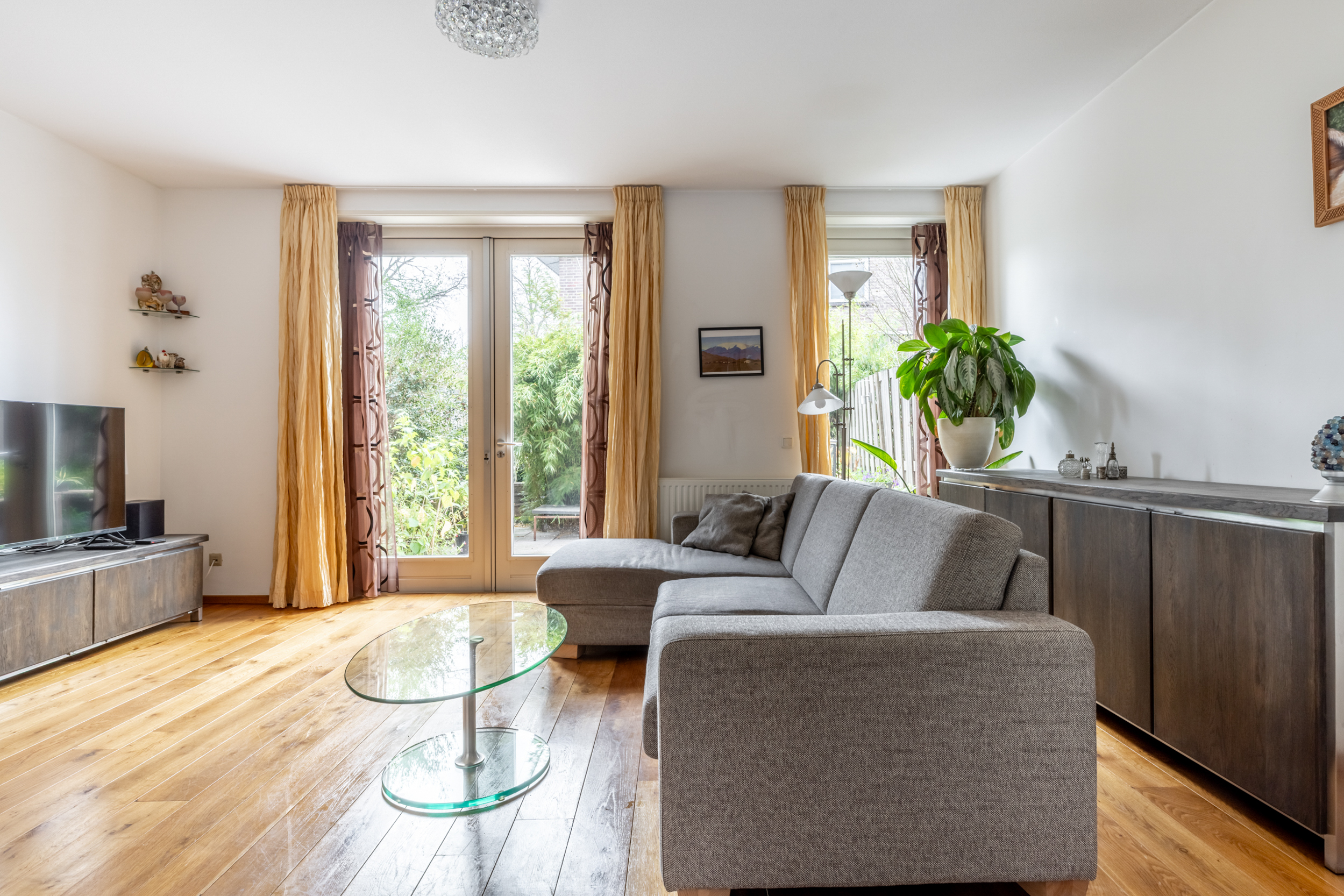 Ground floor: Entrance hall, modern toilet with washbasin and meter cupboard. Garden-facing living room with spacious sitting area, stair cupboard and French doors to the sunny, south-facing garden. At the front is the kitchen with built-in appliances: Quooker, combi-oven, large refrigerator, large freezer, dishwasher, and a 4-burner induction hob.