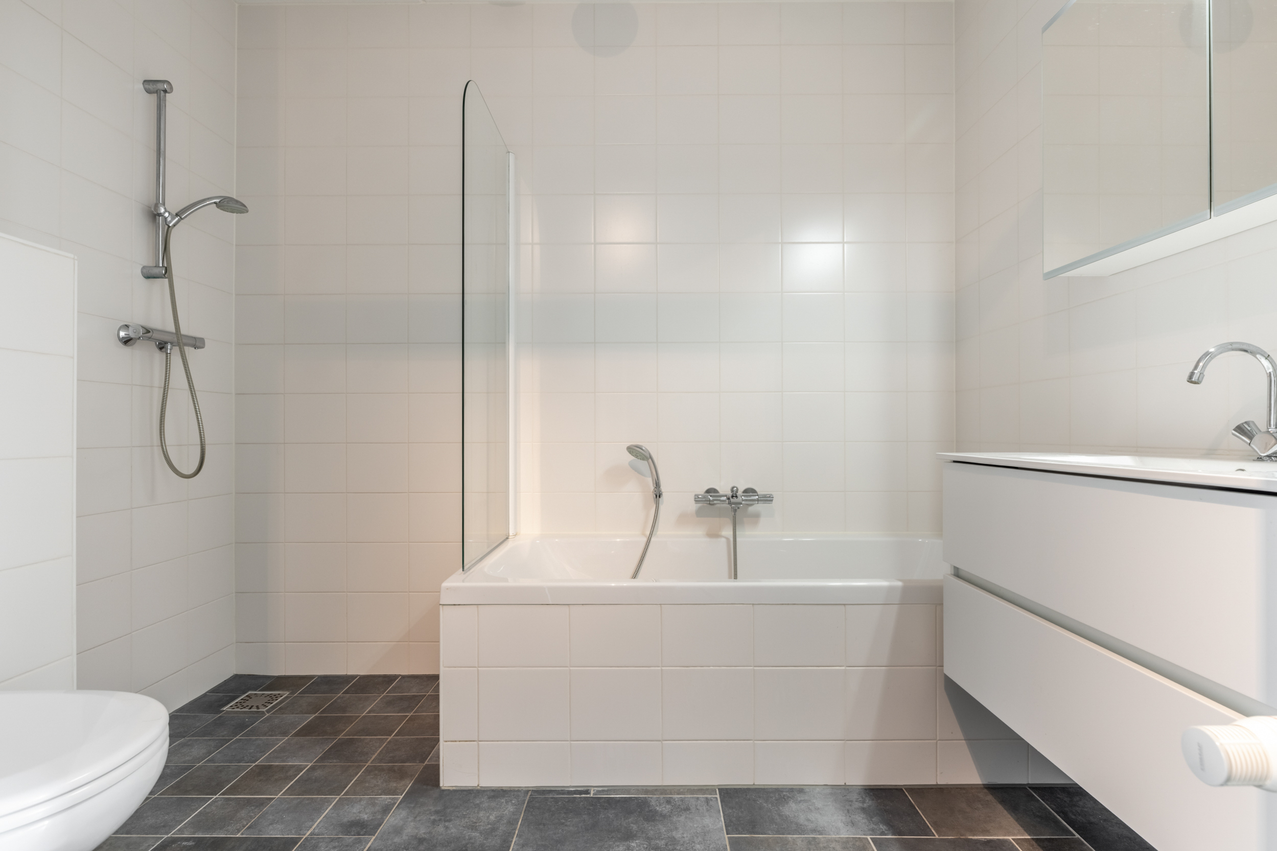 Overloop met twee ruime slaapkamers en een badkamer voorzien van ligbad, inloopdouche, tweede toilet en een wastafelmeubel.