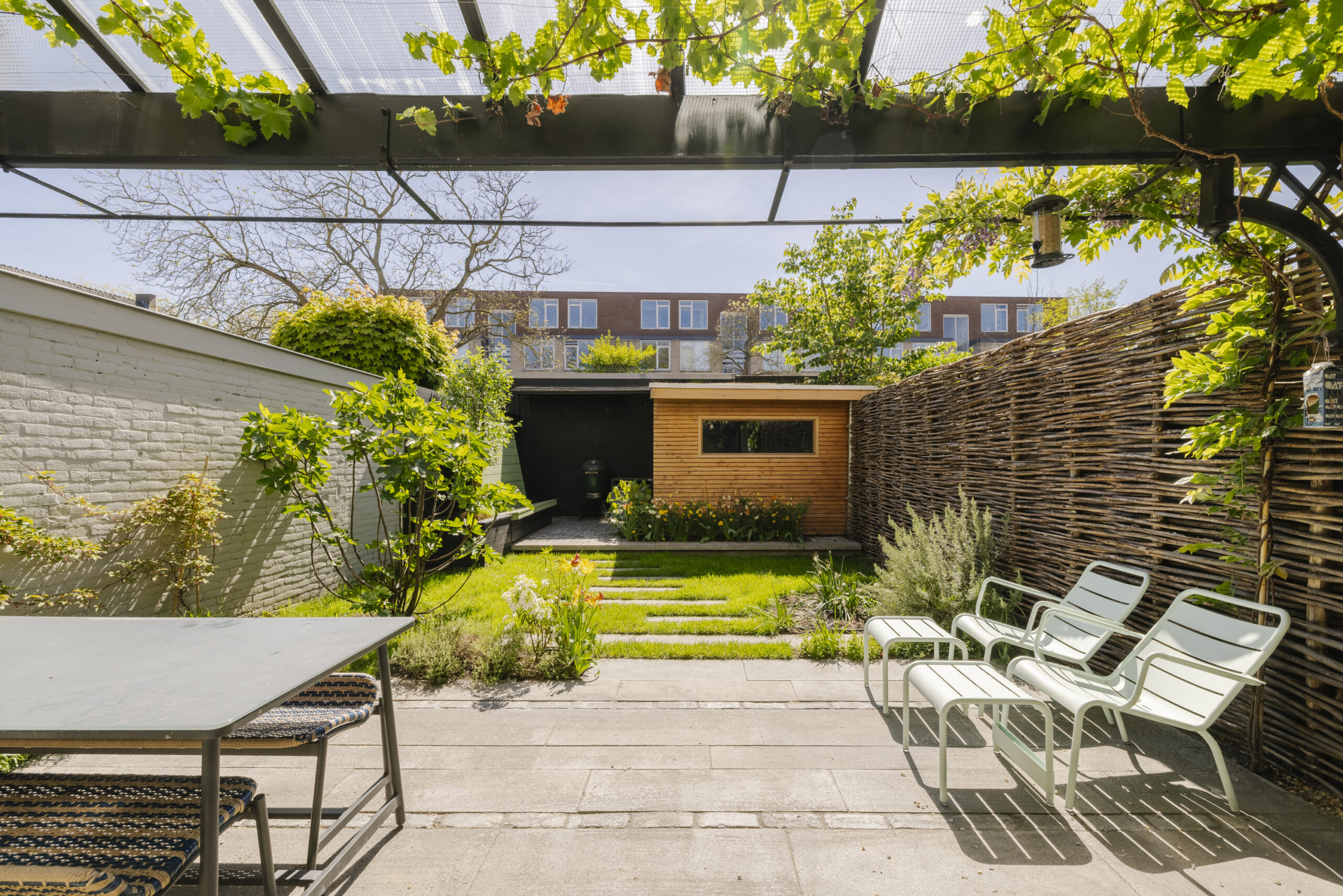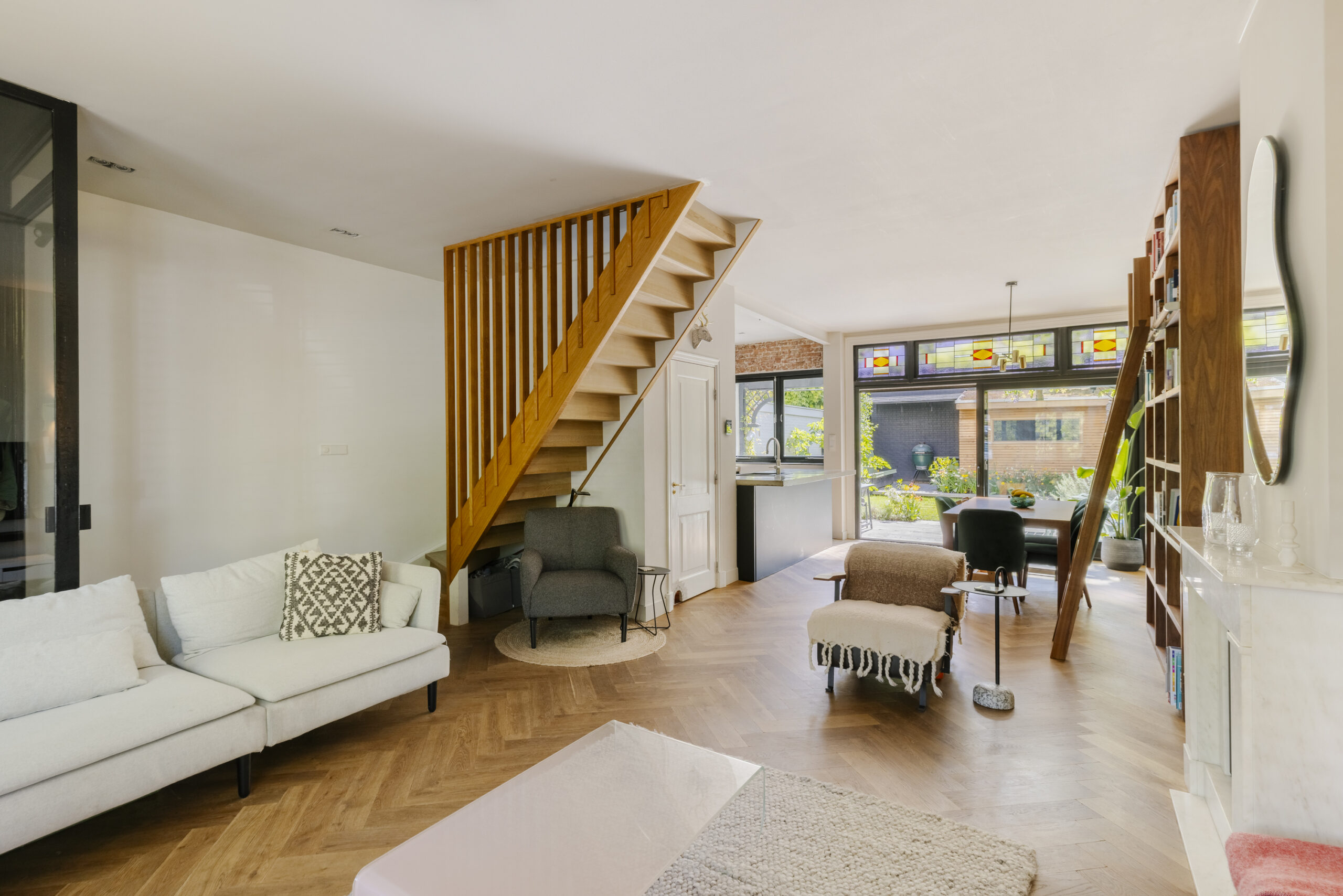 Ground floor: Entrance hall with meter cupboard, bright living room with original stained-glass windows, fireplace, herringbone floor with underfloor heating and sliding doors to the sunny south-facing back garden of about 10 metres deep with canopy and detached wooden shed. Modern, open kitchen with concrete countertop and all conveniences such as a Quooker, ATAG gas hob with wok burner, extractor hood, oven, microwave, dishwasher, fridge-freezer and wine cellar. Hall with cupboard and modern toilet with hand basin;