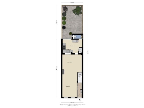 Begane grond: hal met meterkast en trap. Ruime woonkamer met hoogplafond, ruime bergkast onder de trap, keuken voorzien van inbouwapparatuur. Toilet, wasruimte met cv-ketel. Deur naar tuin op het westen.