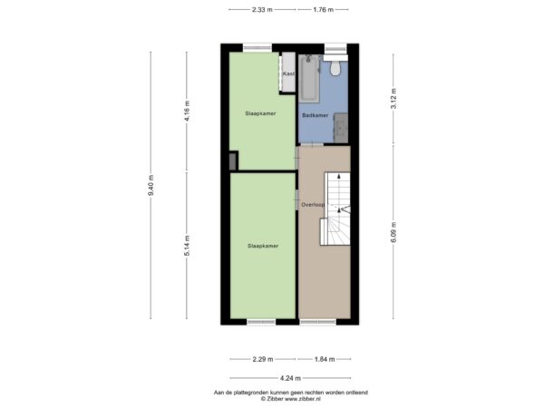 1e verdieping: overloop met werkplek, badkamer met bad, toilet en wastafel. 1 slaapkamer aan voorzijde en 1 slaapkamer aan de achterzijde van de woning.