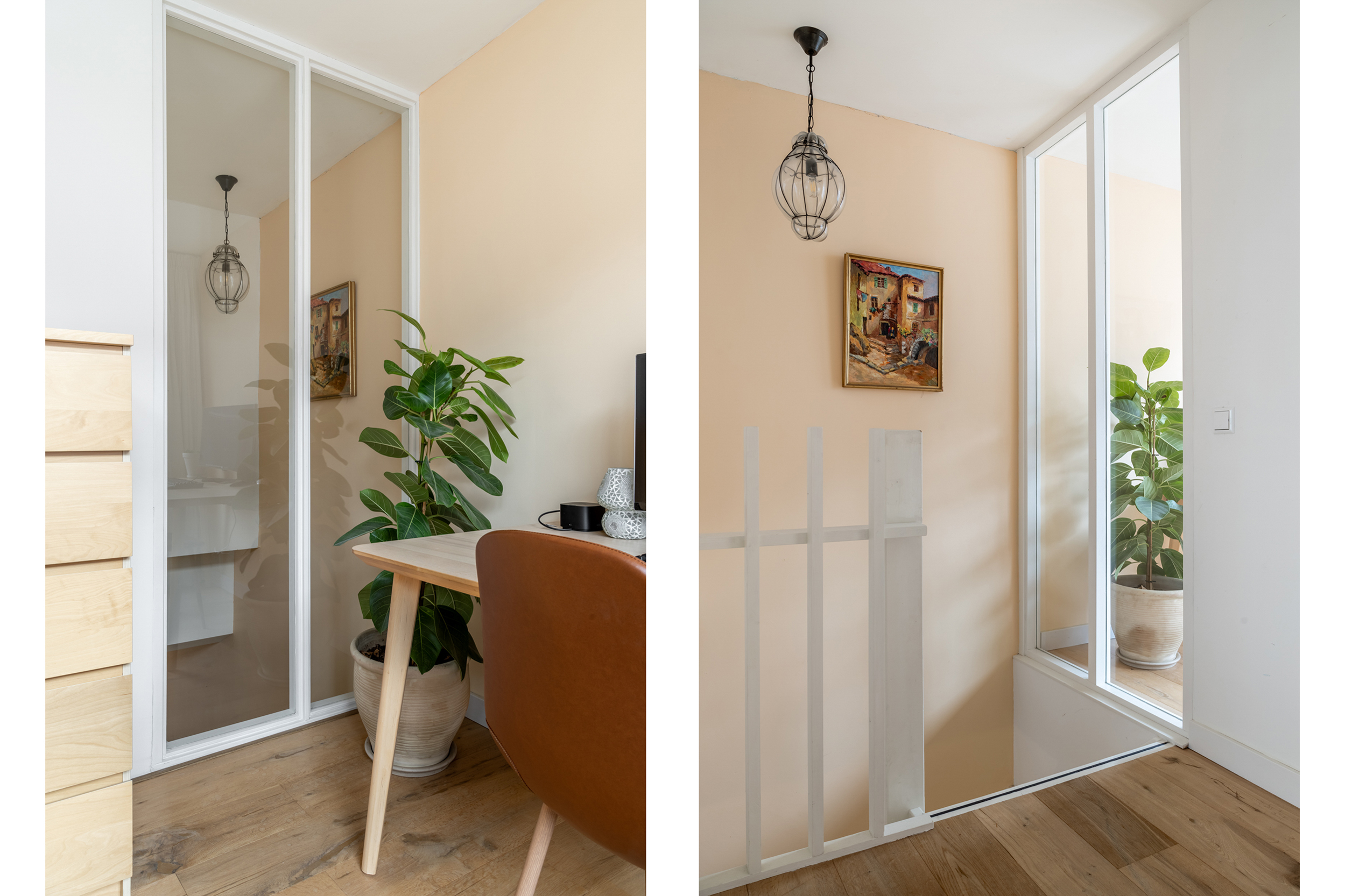 First floor: two bedrooms are accessible via the landing, both spanning the full width of the house. The bedroom at the rear provides access to the beautifully landscaped roof terrace. All windows on the first floor are fitted with fixed insect screens.