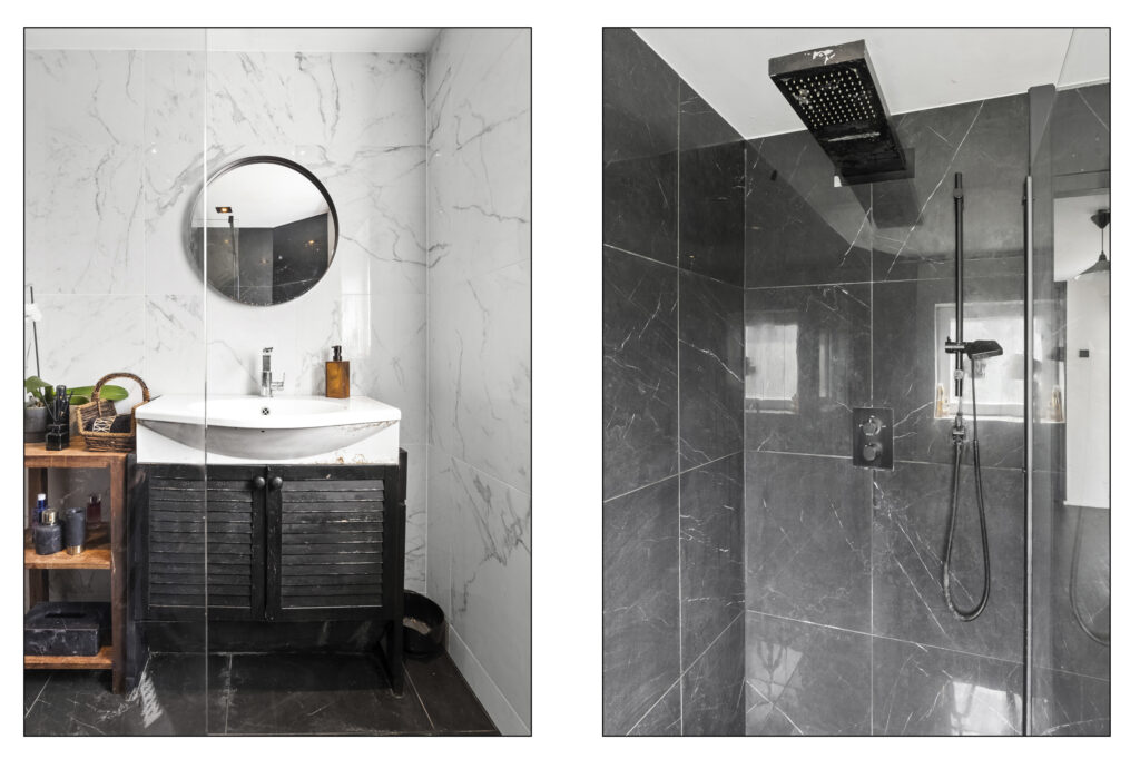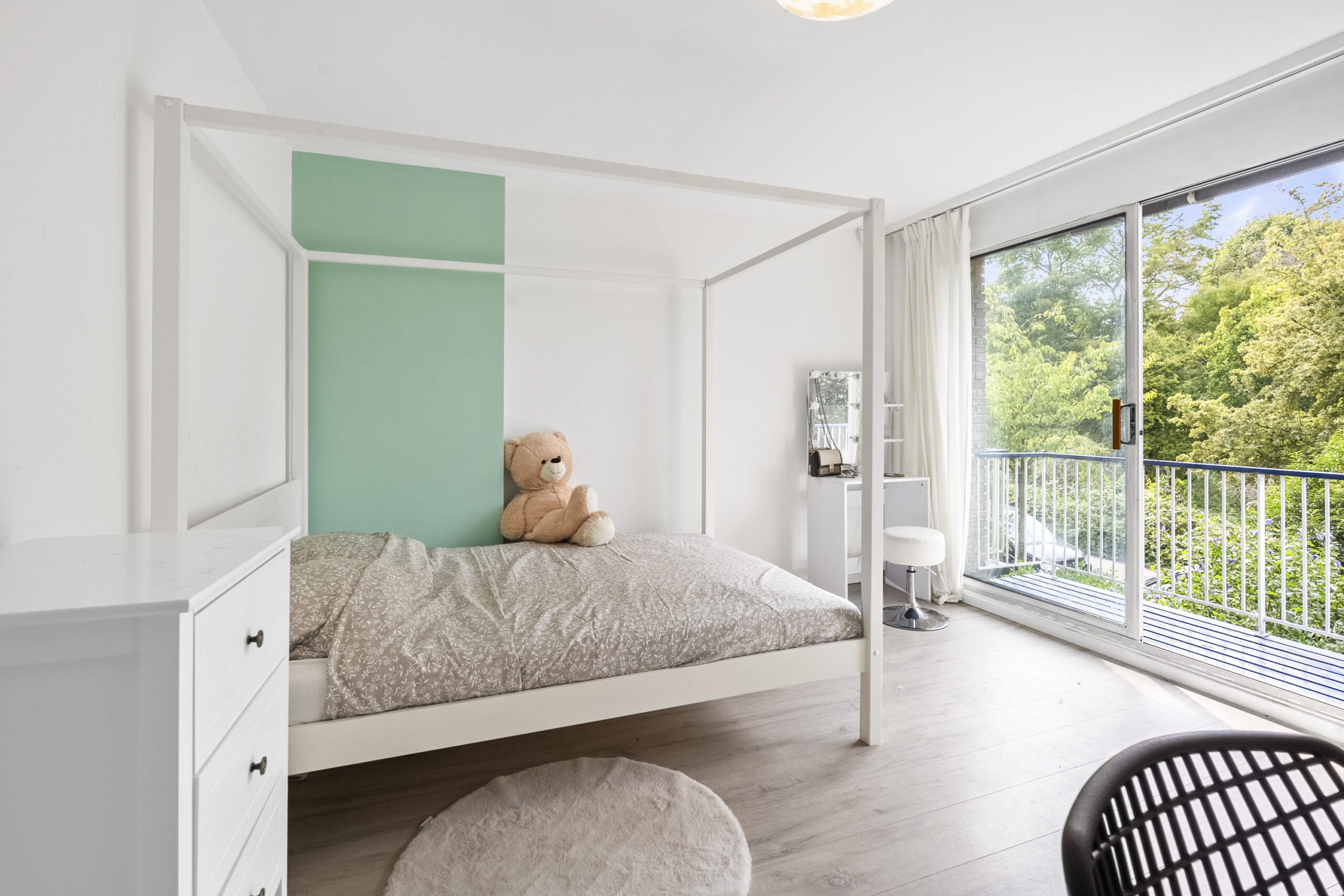 1e Verdieping: overloop met modern zwevend toilet, slaapkamer aan voorzijde met inbouwkast en deur naar balkon, slaapkamer aan achterzijde, zijkamer thans in gebruik als kleedkamer, moderne badkamer voorzien van wastafelmeubel en inloopdouche met handdouche en rainshower, via overloop trap naar…..