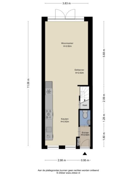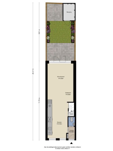 Begane grond: entree/hal met toiletruimte. Riante leefruimte met open keuken aan de voorzijde en lichte, uitgebouwde woonkamer met openslaande deuren naar de tuin aan de achterzijde. De moderne en sfeervolle keuken is v.v. diverse inbouwapparatuur. Er is extra bergruimte in de trapkast en in de zonnige tuin staat een houten berging.
