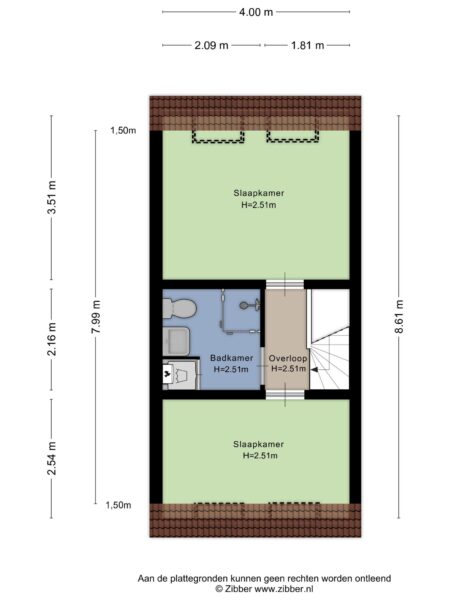 2e Verdieping: overloop, slaapkamer aan voorzijde met Velux dakramen, slaapkamer aan achterzijde met 2 Velux dakramen. Ook op deze verdieping ligt de badkamer tussen de slaapkamers in en heeft een douche / wastafelmeubel / toilet en inbouwkast v.v. aansluiting voor wasapparatuur en opstelling c.v.-ketel.