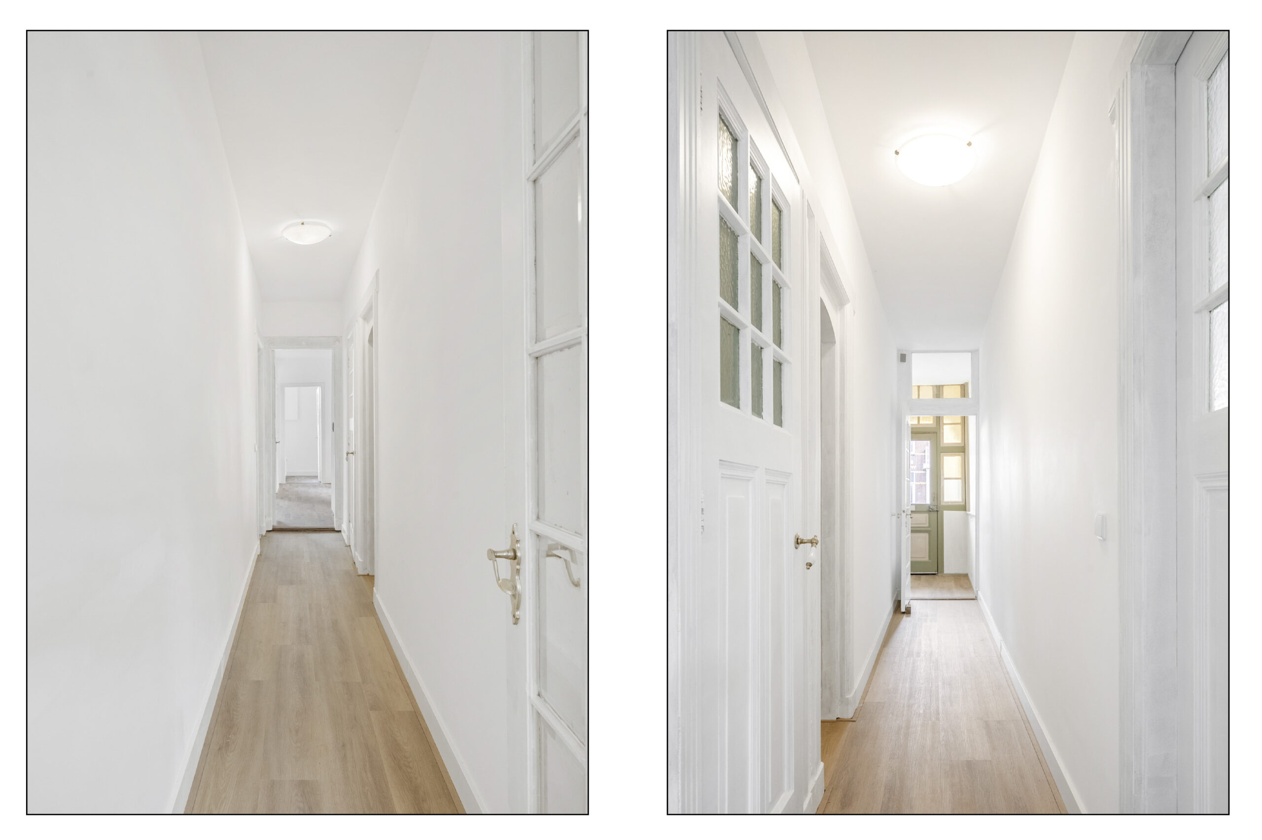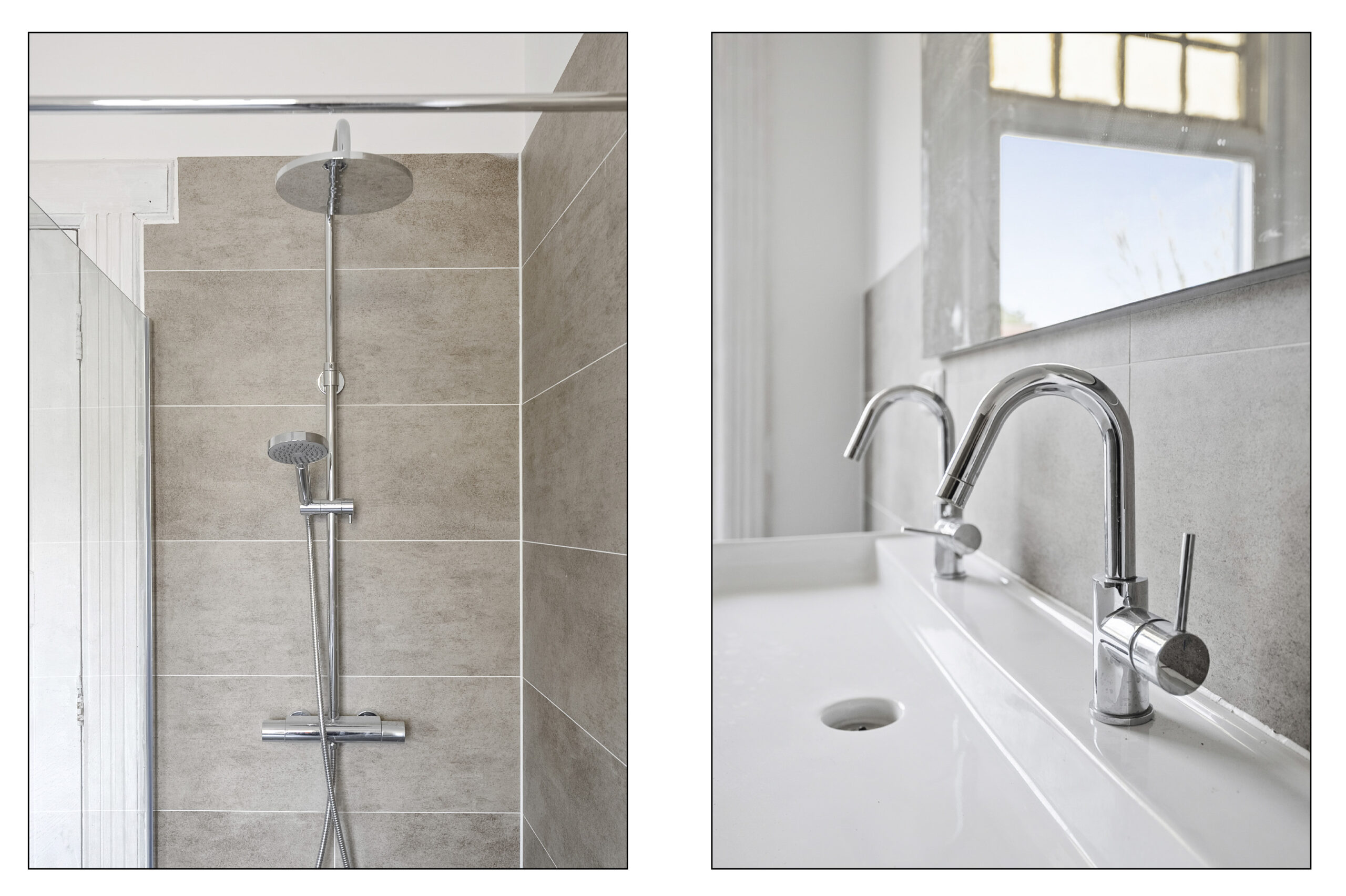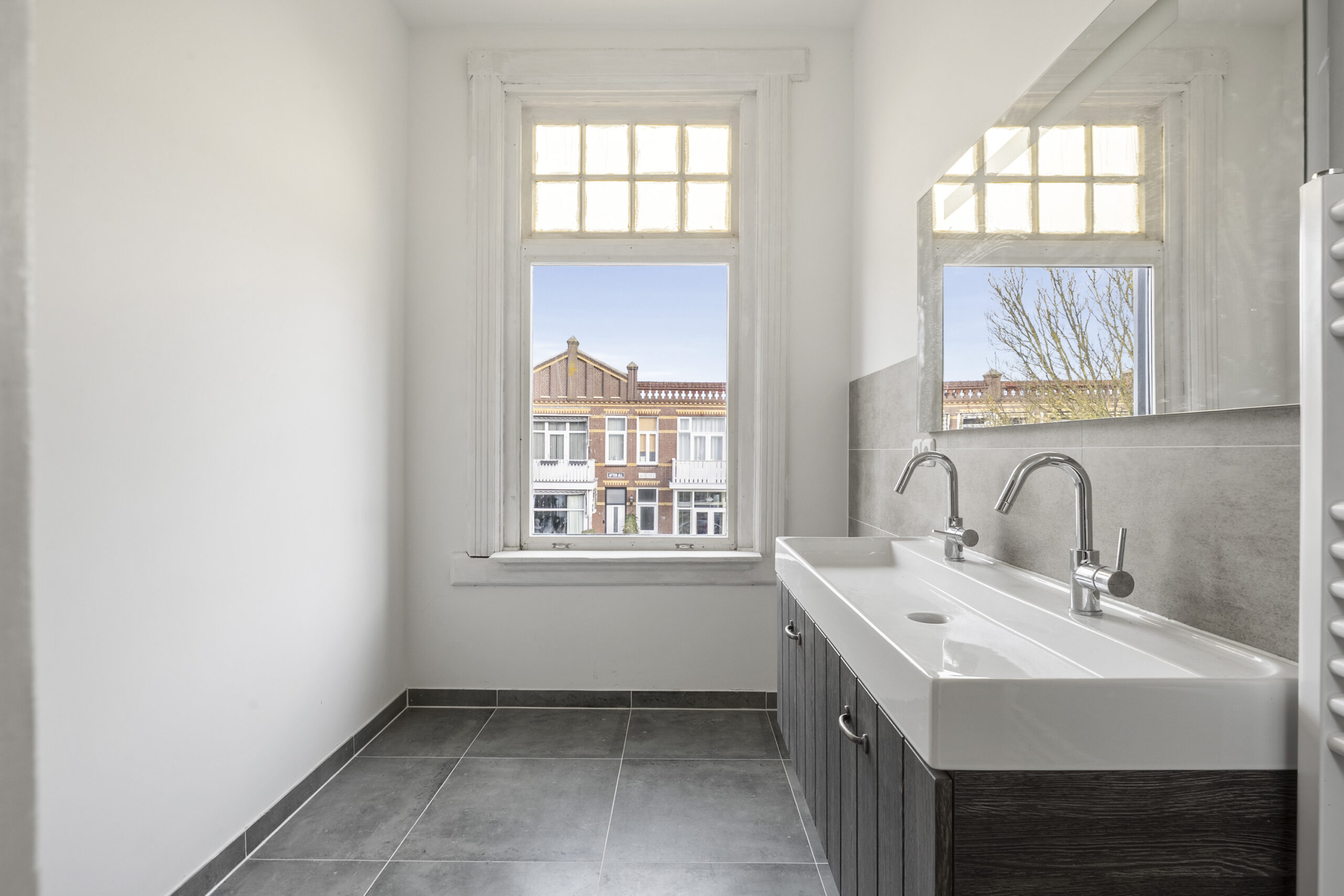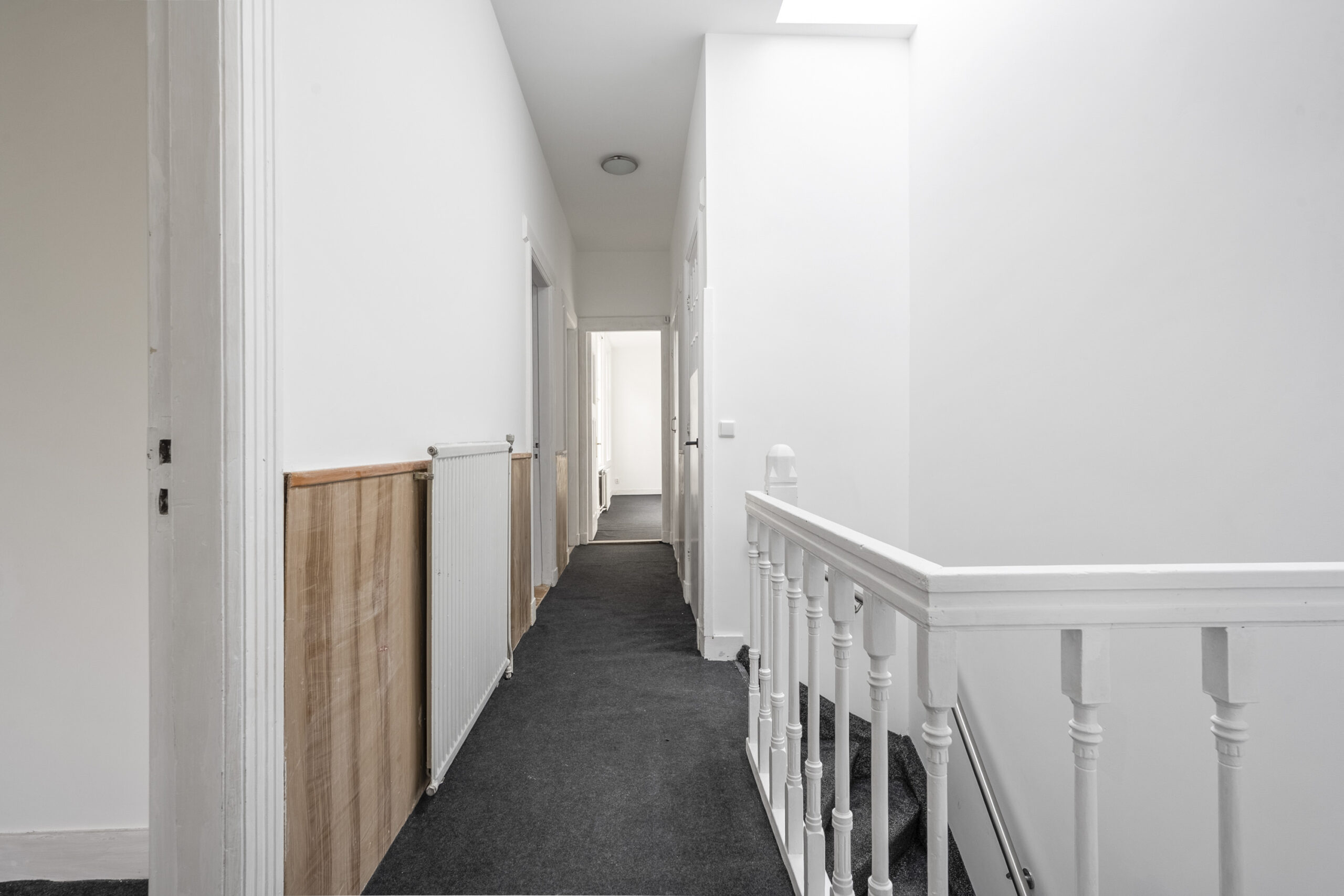 1e Verdieping: overloop met daklicht, modern zwevend toilet met fontein en 2 ruime bergkasten, slaapkamer aan voorzijde met originele raampartij en openslaande deuren naar nog eventueel aan te leggen balkon, moderne badkamer voorzien van inloopdouche met extra handdouche, meubel met dubbele wastafel en handdoekradiator, slaapkamer aan achterzijde, tussenkamer met suitedeuren naar slaapkamer aan achterzijde voorzien van vaste kasten en openslaande deuren naar balkon