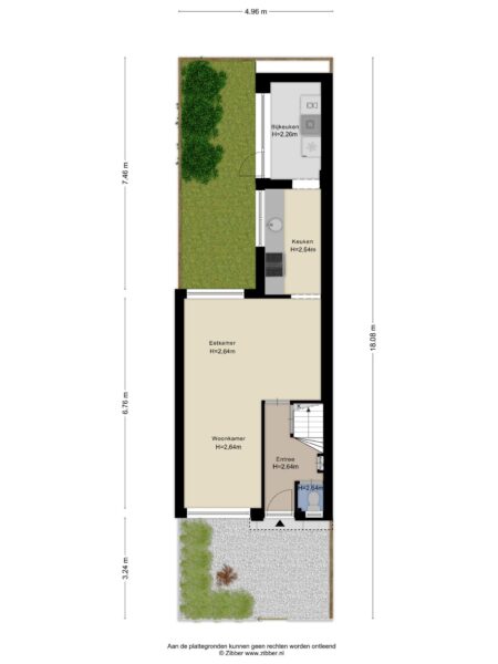 Begane grond: entree/hal met toiletruimte en trapkast. De lichte living heeft het zitgedeelte aan de voorzijde en het eetgedeelte aan de achterzijde. De halfopen keuken heeft een recht keukenblok en diverse keukenapparatuur staat in de naastgelegen bijkeuken waar ook ruimte is voor opslag en de wasapparatuur. Knusse tuin op het zuiden.
