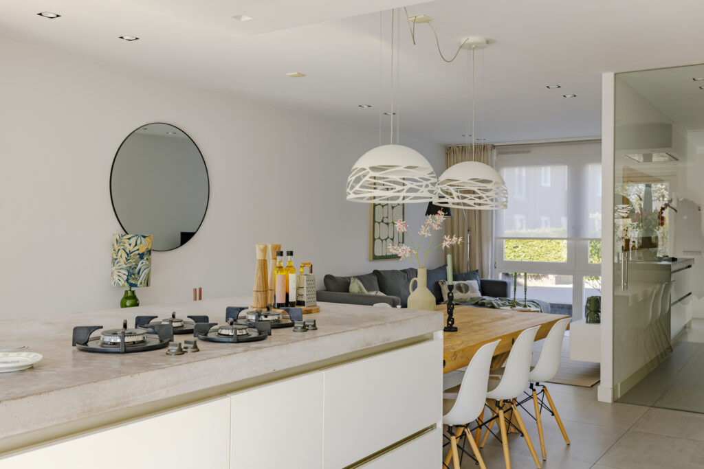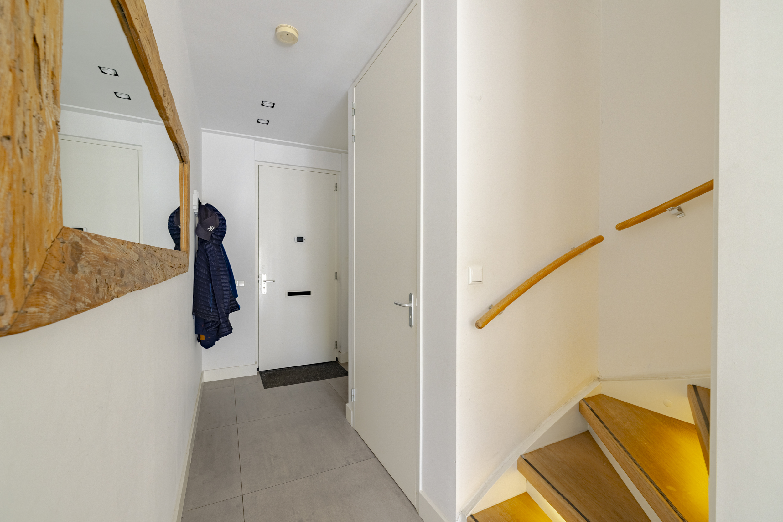 Begane grond: plantsoen, voortuin, voordeur, hal met meterkast, modern toilet met fontein, via de hoge glazen deur toegang naar de woonkamer met het zit gedeelte aan de voorzijde, centraal bevindt zich het eetgedeelte met een grote ingebouwde kasten wand waar je veel spullen in kwijt kan. Aan de achterzijde is de moderne open keuken met o.a. Miele inbouw apparatuur, een XL koelkast en XL vaatwasser en een Quooker, de strakke gashaard zorgt voor nog meer sfeer in deze mooie ruimte. De brede (2,5 meter) openslaande deuren geven toegang naar de fraai aangelegde tuin met vrij zicht op het zuiden, de stenen schuur is voorzien van elektra en biedt genoeg ruimte voor diverse fietsen en de privé parkeerplaats maakt het comfort helemaal af.