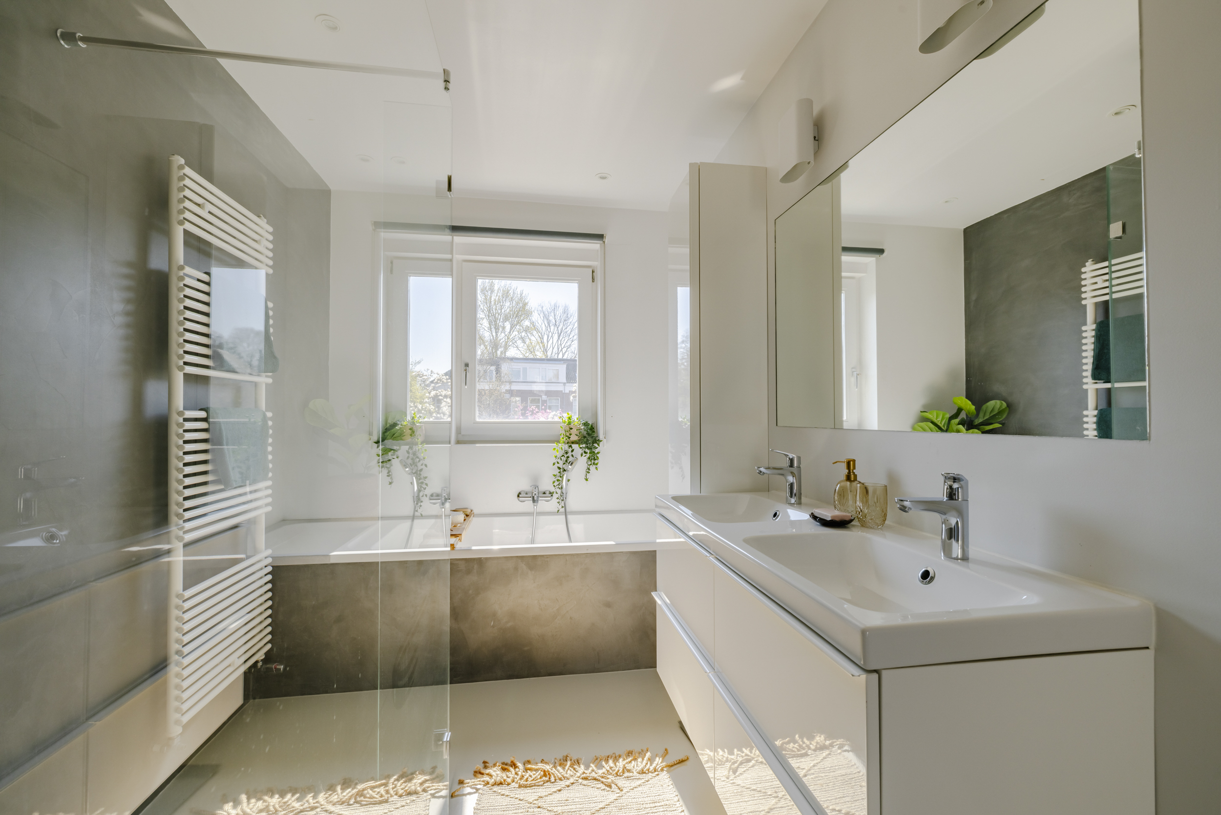 Eerste Verdieping: volledig voorzien van gietvloer met vloerverwarming, overloop, moderne badkamer met bad, douche, toilet en dubbel wastafelmeubel, grote slaapkamer achterzijde, ruime slaapkamer voorzijde, tweede slaapkamer voorzijde, beide met zicht over plantsoen