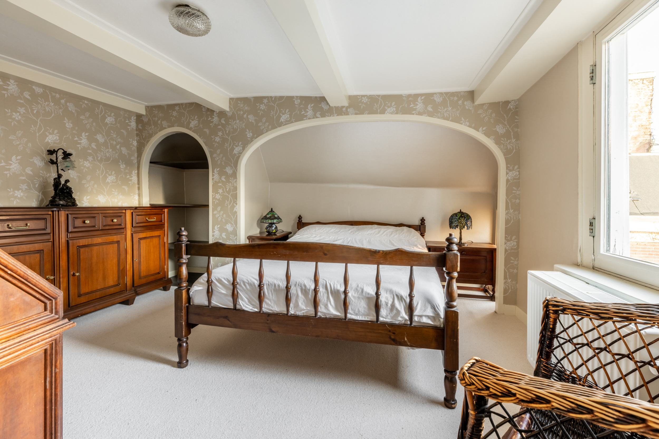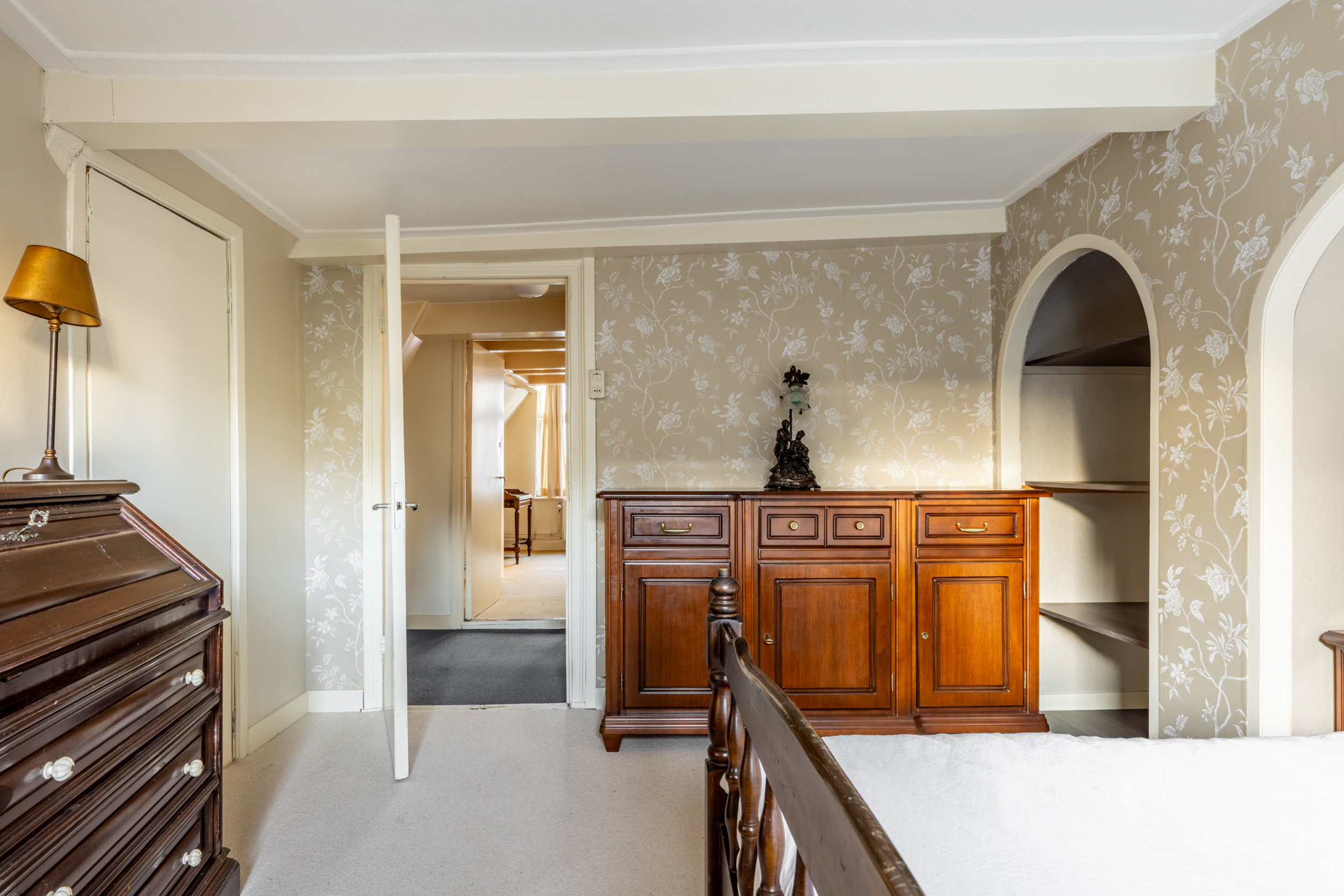 The entrance at the front provides access to the living room, which has wooden floors and original beams. At the rear, there is space for a kitchen and utility room with access to the outside and a door leading to Groendaalsteeg.