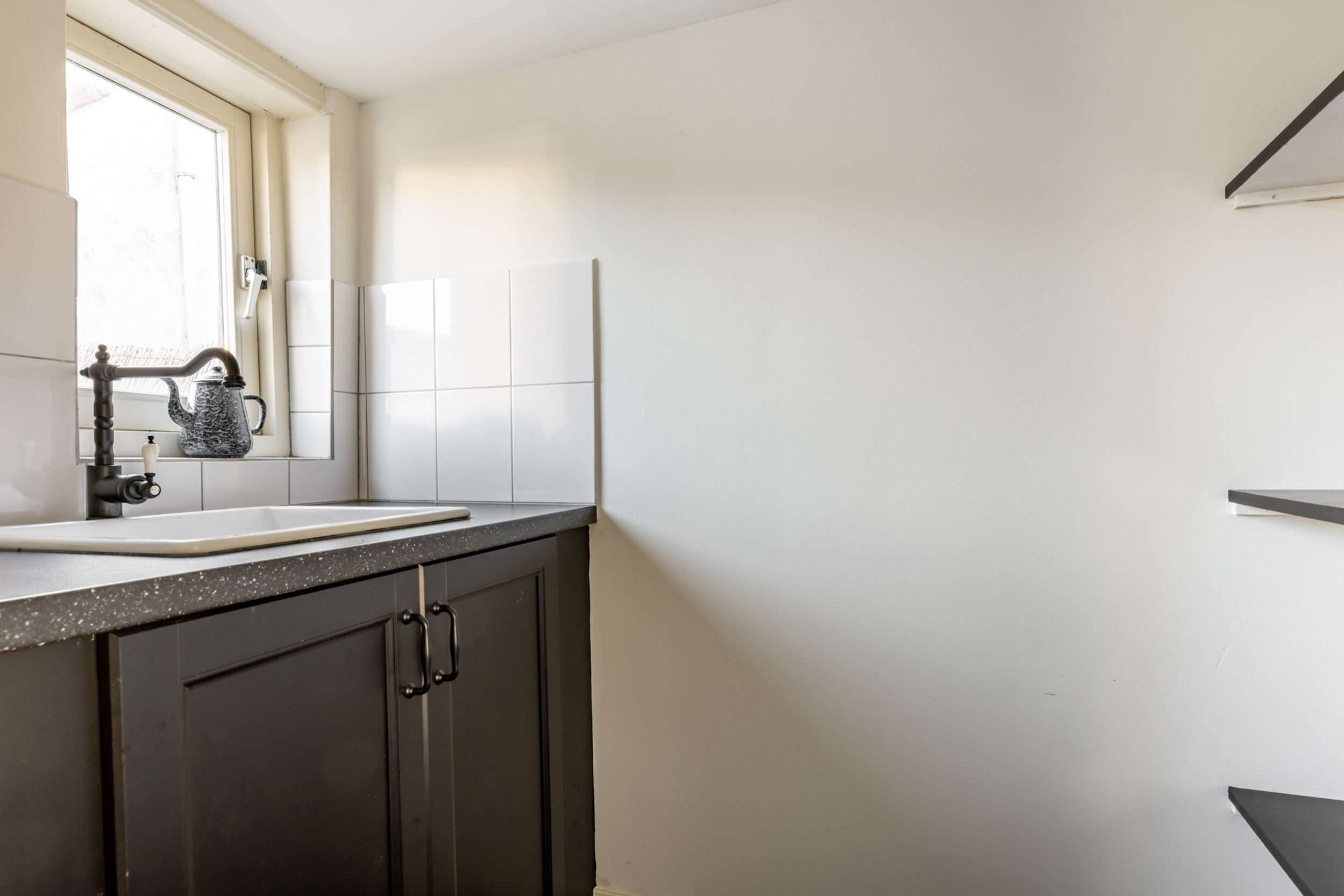 Via de entree aan de voorzijde toegang tot de woonkamer en voorzien van houten vloeren en originele balken. Aan de achterzijde is ruimte voor een keukenopstelling en bijkeuken met toegang tot buiten en deur richting de Groendaalsteeg.