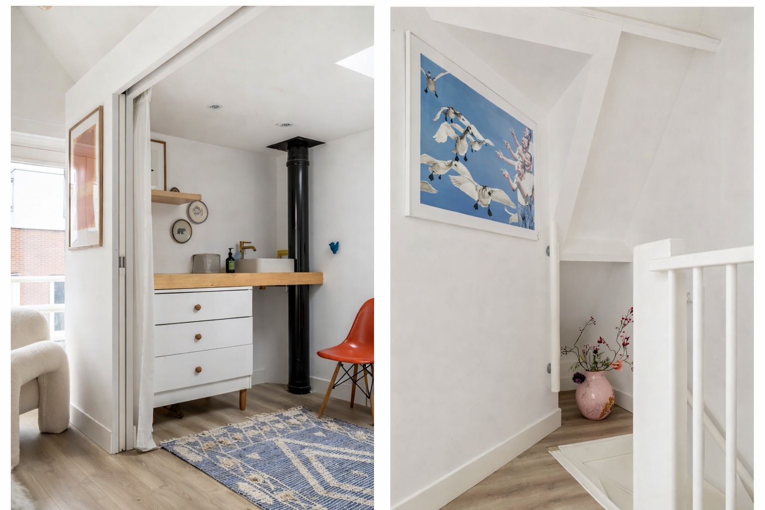 Op de tweede verdieping bevindt zich de royale master bedroom, die dankzij het dakraam en de openslaande deuren geniet van een aangename lichtinval. Aangrenzend ligt een extra kamer, momenteel in gebruik als kinderkamer en bereikbaar via schuifdeuren. Ook deze ruimte beschikt over een dakraam, wat zorgt voor veel natuurlijk licht. Verder is op deze verdieping een wastafel met warm en koud water aanwezig, evenals praktische bergruimte.