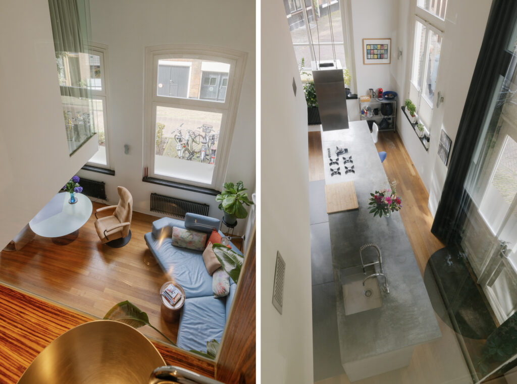 Zodra je binnenkomt, ervaar je de ruimte, licht en hoogte die dit appartement zo uniek maken. De grote raampartijen zorgen voor een spectaculaire lichtinval en de speelse indeling met vide en 2 entresols creëert verrassende zichtlijnen. In het woongedeelte reikt het plafond tot wel 5 meter hoog – een heerlijke open leefruimte met een moderne eilandkeuken en eetgedeelte.