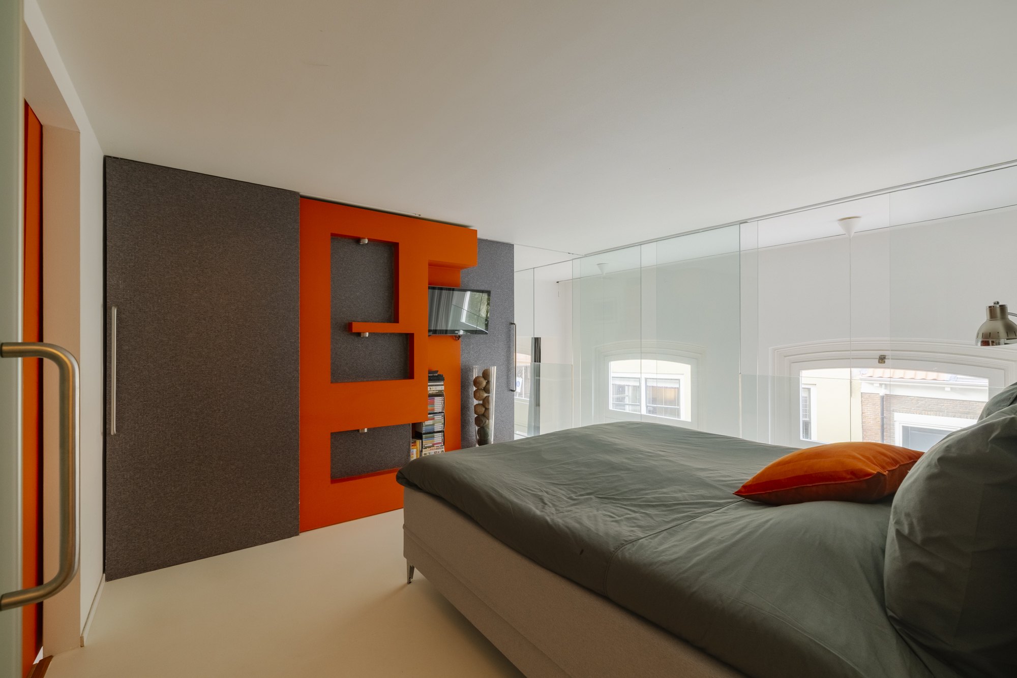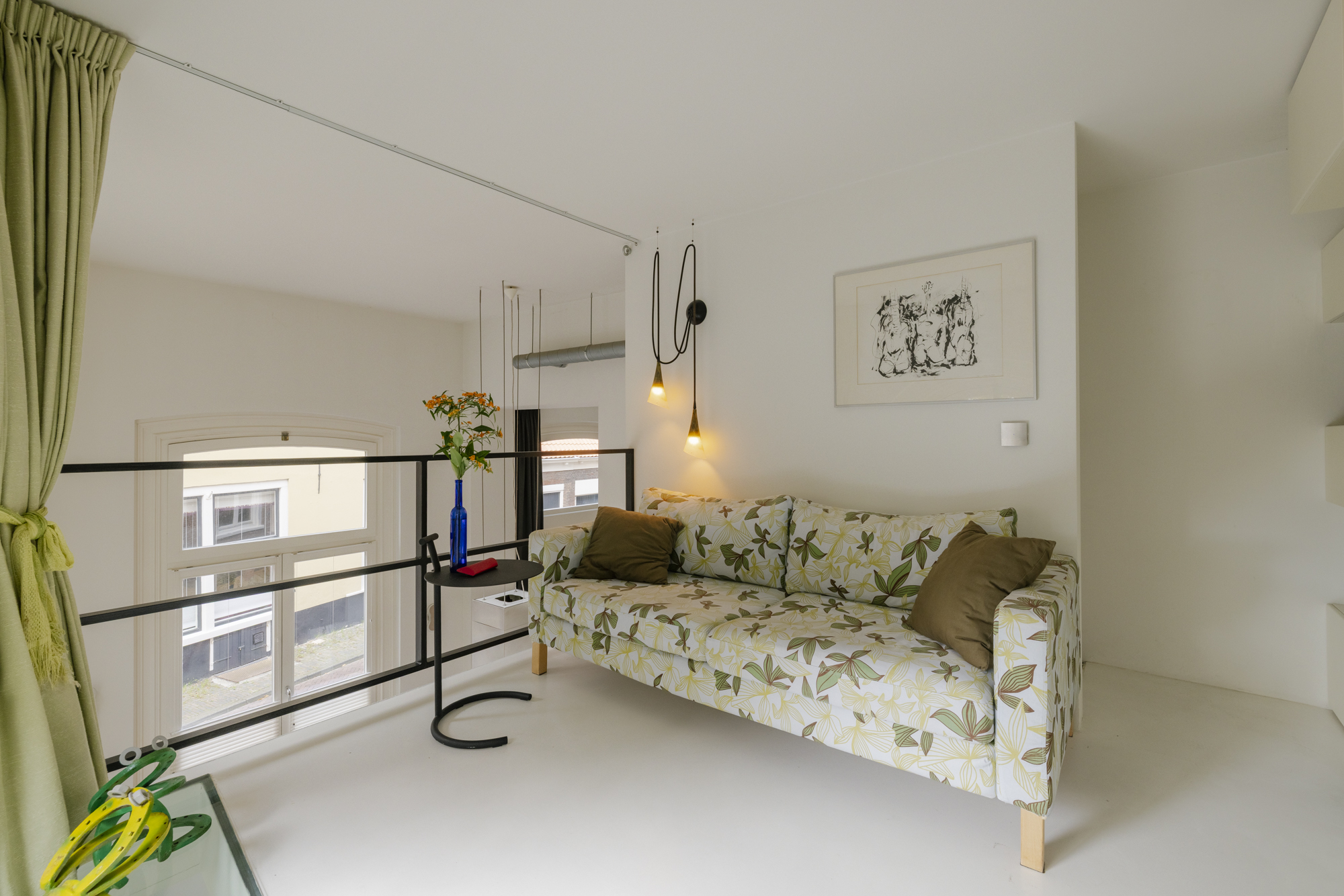 The flat has two separate mezzanine floors. On the first floor, you will find the master bedroom with a spacious walk-in wardrobe/workspace and the bathroom. The bathroom has a spacious walk-in shower, washbasin and toilet. Installing a bathtub here is easy, as all the connections are already in place. On the second mezzanine floor, you will find a multifunctional space – ideal as a study, guest room or studio – with a beautiful view of Zoetestraat.