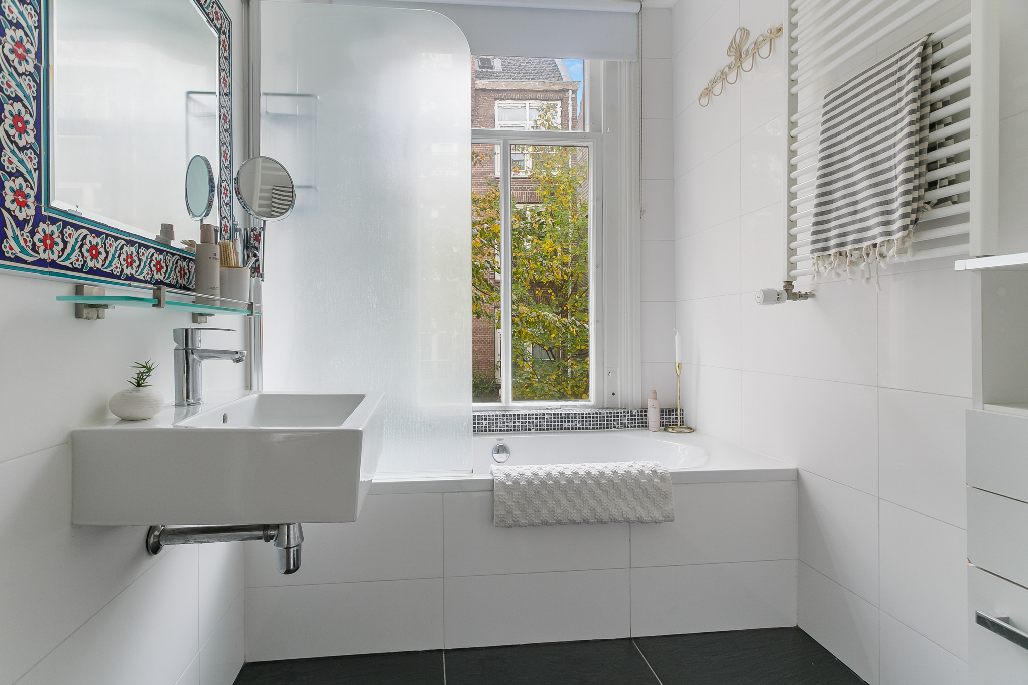 De badkamer ligt naast de hoofdslaapkamer en is uitgerust met een ligbad, aparte douche, handdoekradiator en wastafelmeubel. Vanuit de hal is tevens het separate toilet met fontein bereikbaar. Onder het trappenhuis bevindt zich een kast met aansluiting voor wasmachine en droger.