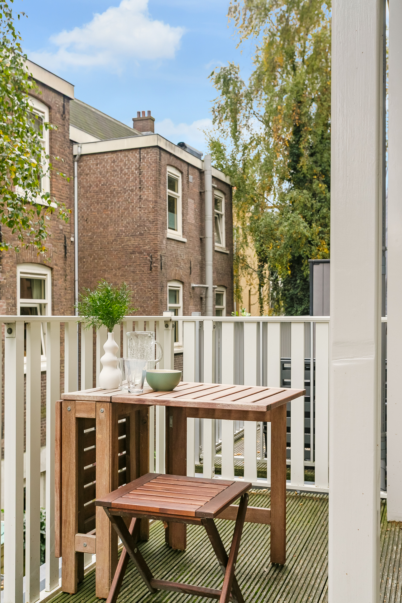 Het terras is afgewerkt met hardhouten vlonders, beschikt over een praktische bergkast en biedt uitzicht op de groene binnentuinen; een rustige plek midden in de stad.