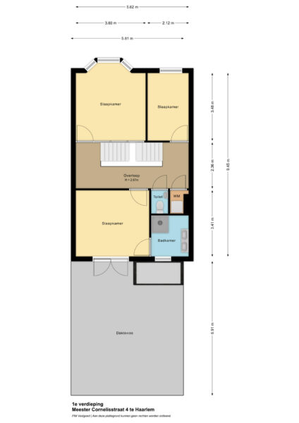 Eerste verdieping: Grote en door het dakraam erg lichte overloop met toilet en waskast, 2 slaapkamers aan voorzijde waarvan een met erker die zicht in de straat geeft. Ruime slaapkamer aan achterzijde met badkamer en-suite voorzien van douche en dubbele wastafel, via de openslaande deuren in de slaapkamer toegang naar het fraai aangelegde dakterras op het zuiden.