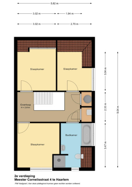 Tweede verdieping: Ruime overloop met CV/warmtepomp opstelling in vaste kast, 2 slaapkamers aan voorzijde, slaapkamer achterzijde, riante badkamer met bad, douche, wastafel en toilet.