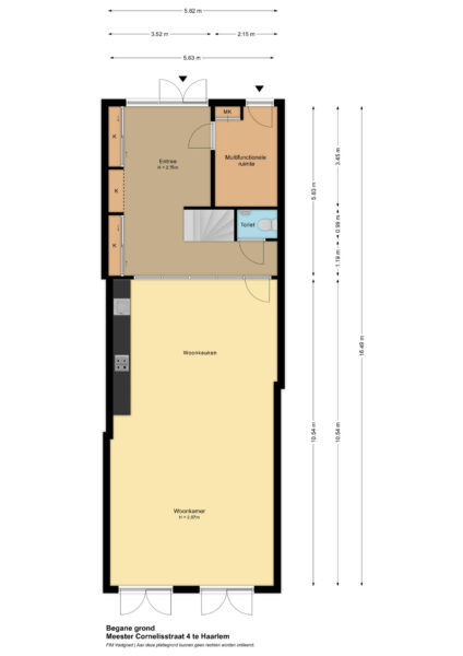 Begane grond: voortuin, entree met meterkast, grote hal met vaste kasten, toilet met fontein, ruime leefkeuken met genoeg plek voor een grote eettafel. Aan de achterzijde een riante woonkamer met dubbele openslaande deuren naar de fijne tuin op het zuiden.