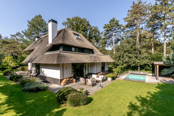 Rondom de villa ligt een tuin die ondanks de noord ligging heerlijk zonnig is. De tuin is voorzien van een verwarmd zwembad met solardek, een buitendouche (met warm en koud water), een jacuzzi, een mooi gazon met een trampolinekuil en een zeer groot zonnig terras. Tevens is de tuin aan de voorzijde welke door middel van een elektrisch hekwerk is afgesloten voorzien van een ruime parkeergelegenheid voor meerdere auto’s en een fietsenberging.